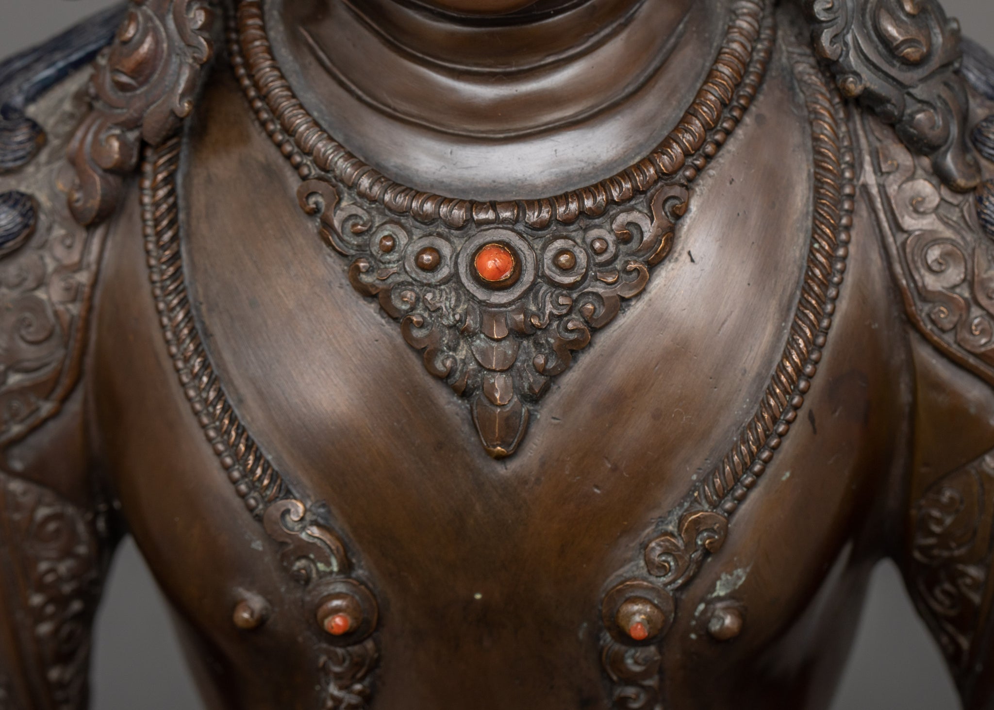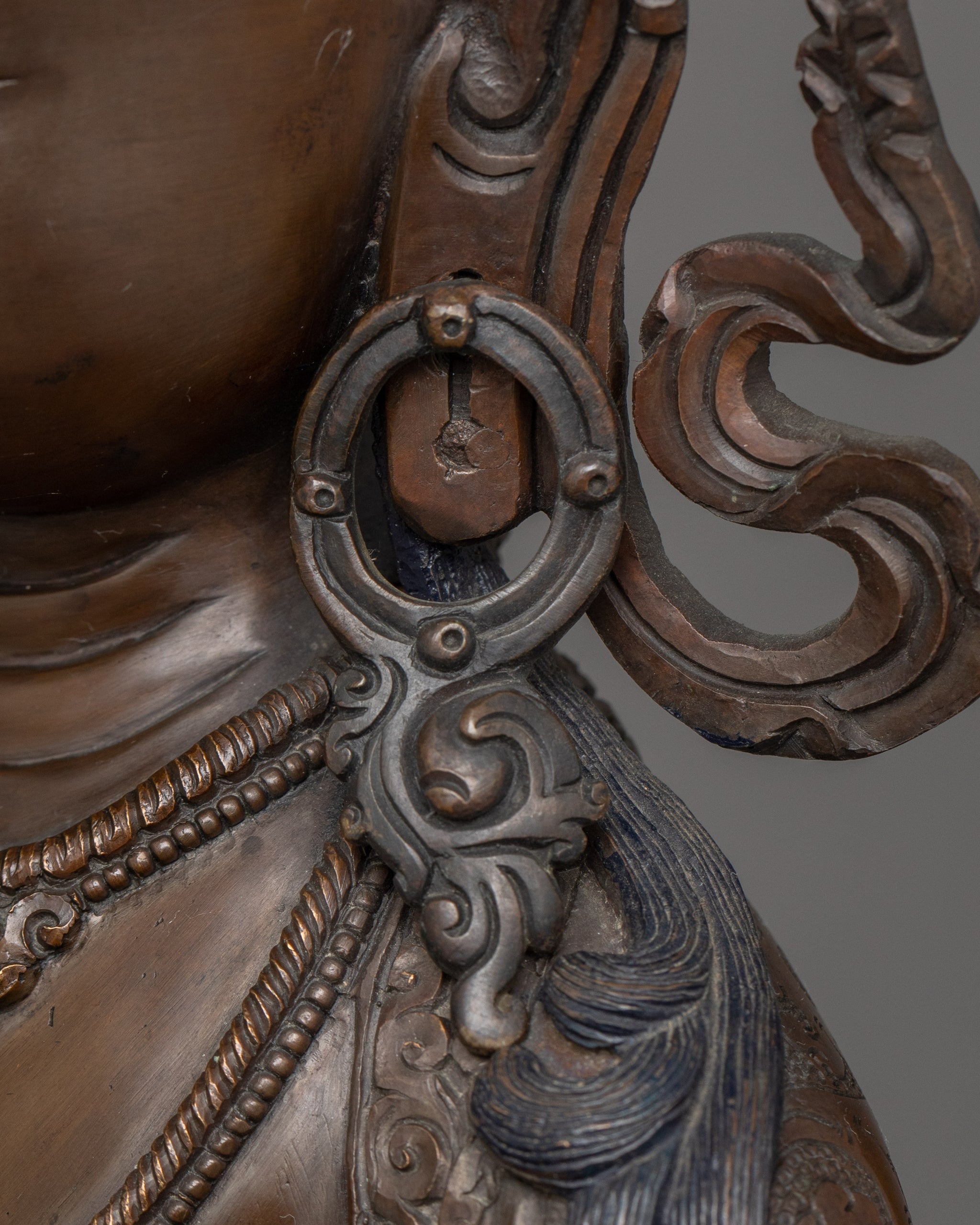 Vajrayogini is stunning. The details are amazing. It's easy to make out her facial expressions, skulls, feet, and the ring of fire around her. You can tell she's handmade. There is a consecration hole in her back.