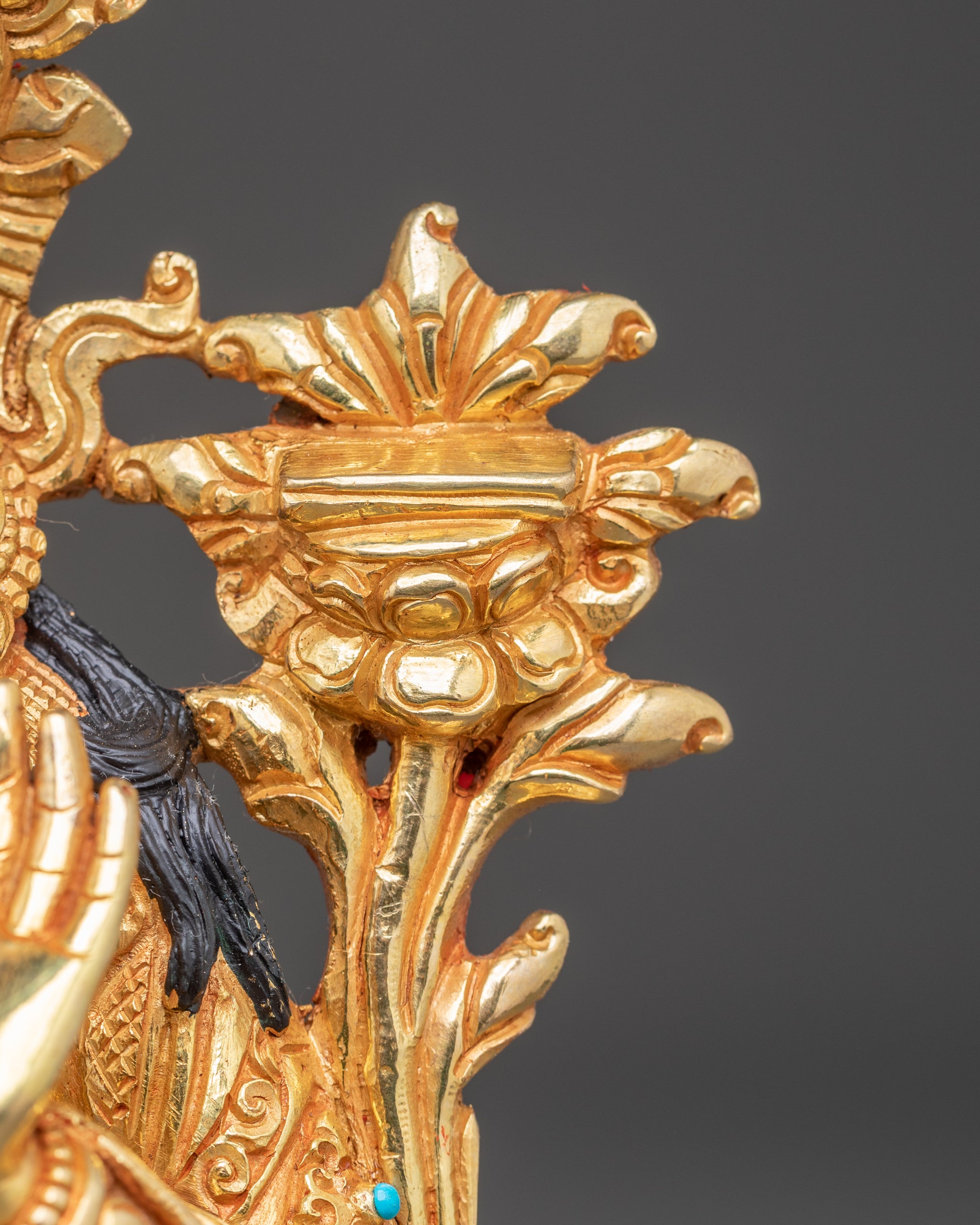 The Buddhist Copper Statue of Bodhisattva Manjushri stands at a height of 8.9 inches (22.5 cm) with a base width of 7.3 inches (18.5 cm) and weighs 1.58 kg. Crafted from copper, it is adorned with 24K gold gilding and intricate gold and acrylic paintings. The statue is further embellished with carefully inlaid gemstones, adding a touch of spiritual elegance and vibrant energy to its overall design. Representing the embodiment of transcendent wisdom, this piece serves as a powerful symbol of insight, clarity, and enlightenment. Ideal for altars, meditation spaces, or spiritual collections, it offers both aesthetic beauty and profound symbolic significance.