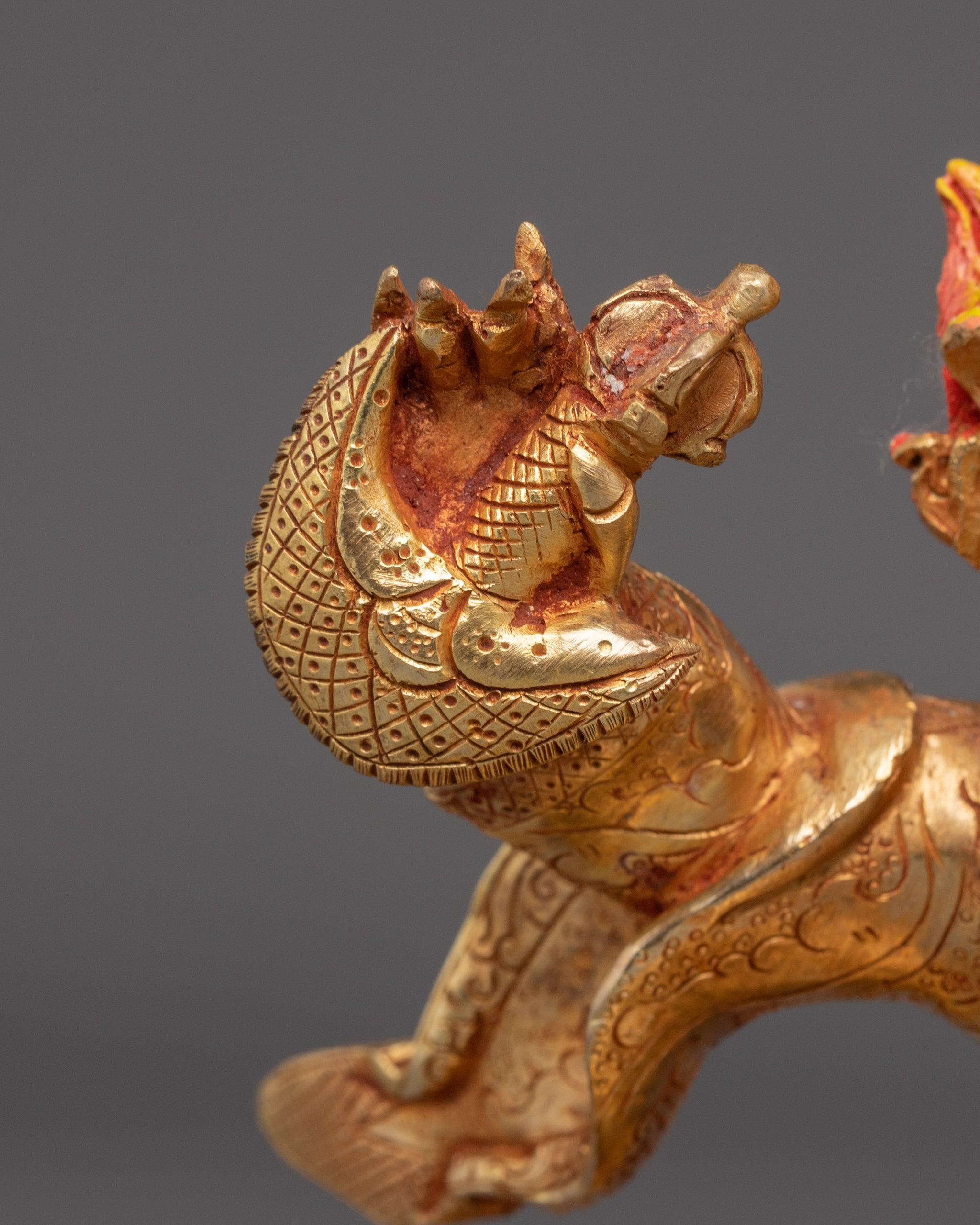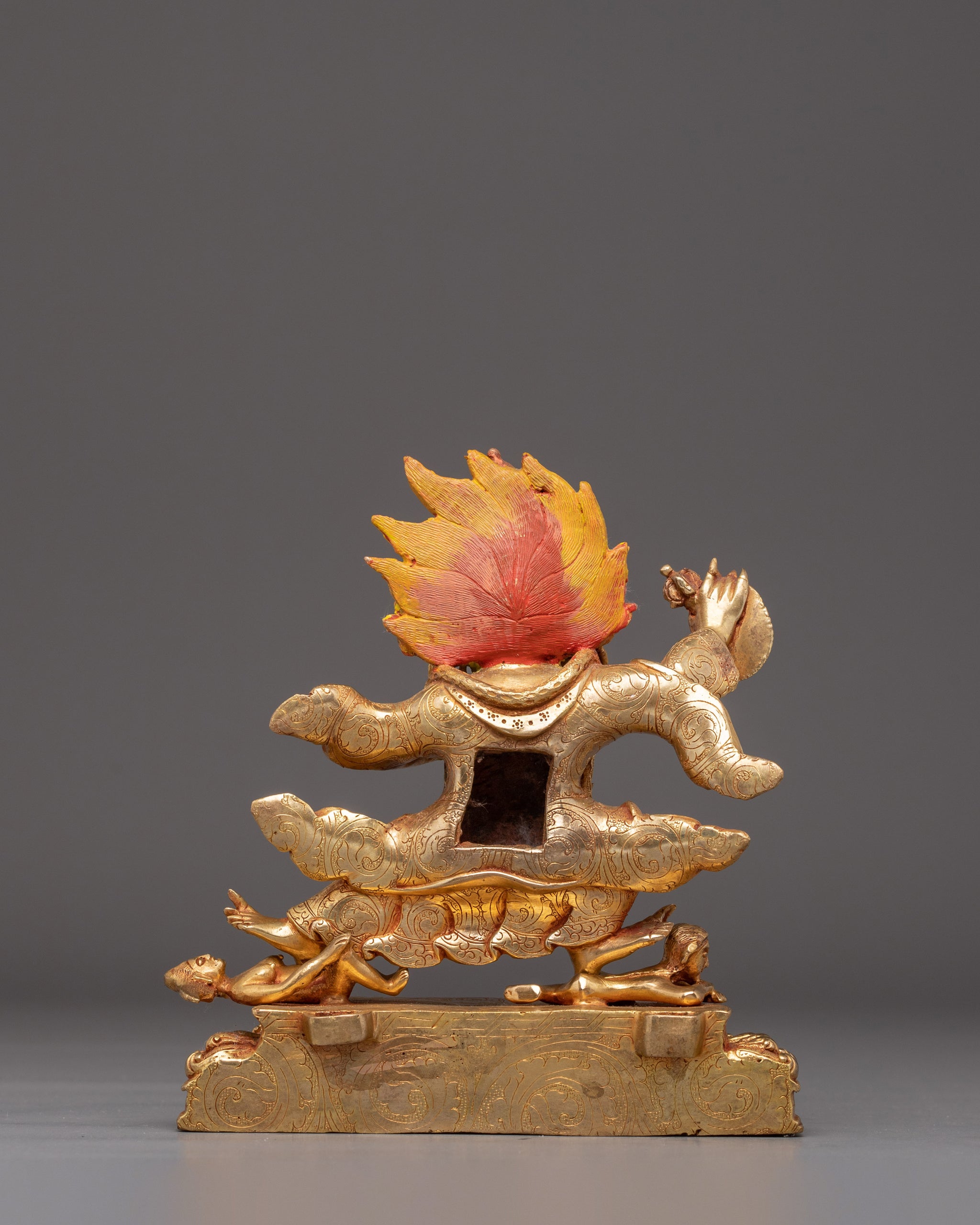 This handmade Buddhist deity, a Mahakala Bernagchen Art, stands at 9.8”/25cm in height and 7.1”/18cm at the base, weighing 2.21 kg. Made from copper, covered with a triple layer of 24K gold gilding, and carved with deeply engraved carvings that produce a magnificent 3D-like effect. This sculpture, adorned with gemstones, handcrafted by expert Nepalese artisans, elegantly symbolizes Himalayan Buddhism's sacred traditions, making it an appropriate addition to altars, meditation places, or sacred collections.