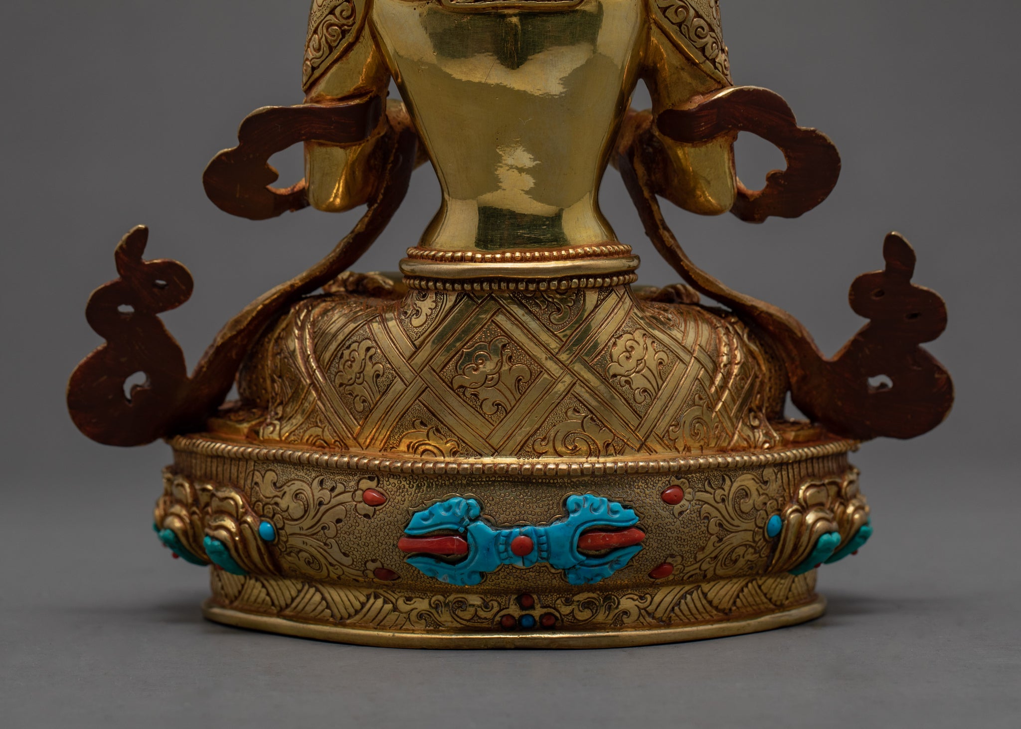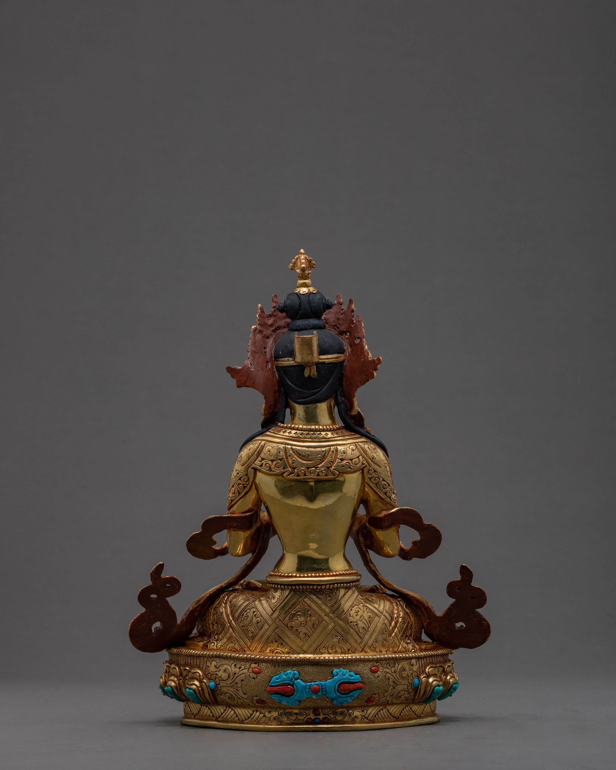 Vajradhara, also known as Dorje Chang, is represented as seated cross-legged in a vajraparyaka posture atop a lotus in the Buddhist deity statue. His left, feminine hand is within, bearing the bell (symbolizing his inner wisdom and emptiness); his right, masculine hand, holding the vajra, is above the left, illustrating technique and compassion directed outwards.