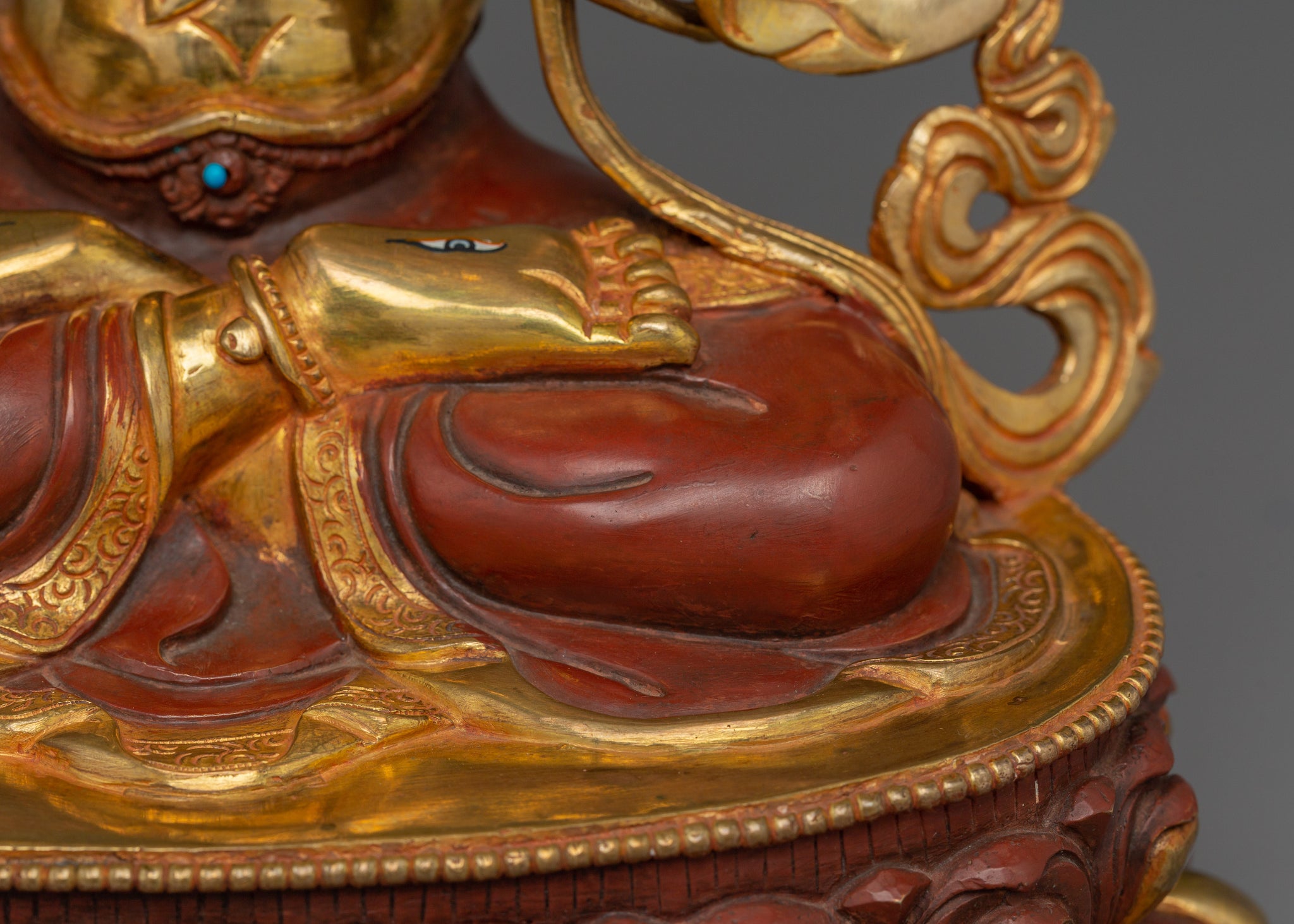 This significant statue weighs 4.34 kg and is suitable for sacred altars, healing rituals, and Vajrayana long-life practices. White Tara holds flowering lotuses with both hands, symbolizing purity, rebirth, and the healing of physical and mental traumas. Her presence is especially beneficial to individuals seeking longevity, spiritual enlightenment, or comfort during illness and change. This sculpture, which showcases great Nepali craftsmanship, strikes a balance between elegance and divine purpose.