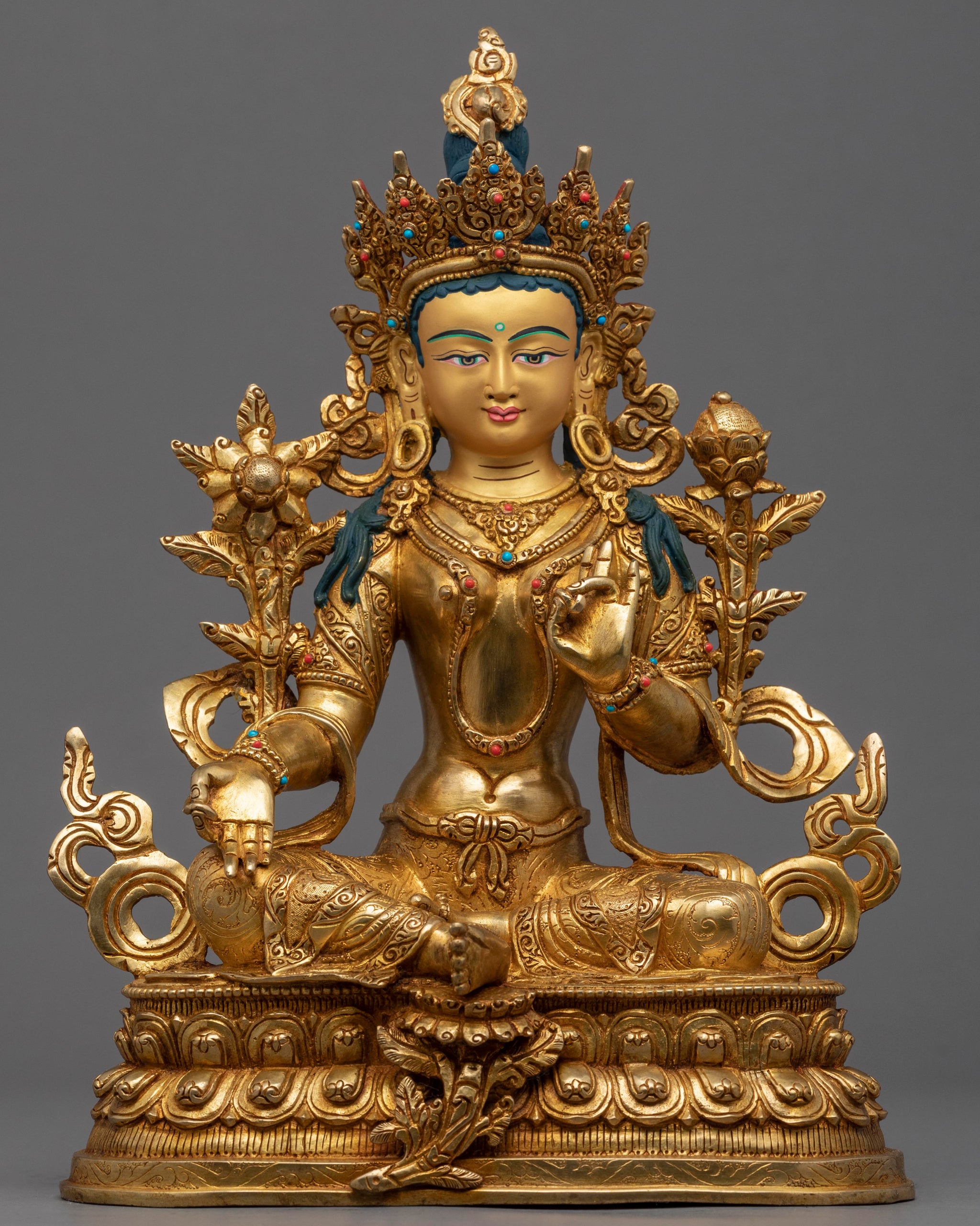 The Buddhist Green Tara Sculpture was flawlessly crafted by the master craftsmen of Nepal using Nepal's ancient Himalayan art. The Buddhist Green Tara, also known as the Mother Tara, was carved using a copper body, gilded with 24k genuine gold and finely painted with acrylic paint to highlight the intricate design patterns of the statue. the deity is depicted seated upon a moon disc lotus with a serene expression as she makes the gesture of providing refuge with her right hand and her left hand making the Prithvi Mudra, which represents the union of wisdom and compassion. The body jewelry that the deity wears is adorned with many gemstones. The statue's materials are of the highest quality and will last for a very long time. This sculpture may be used in different Buddhist rituals and for mindfulness meditation, like a yoga practice.