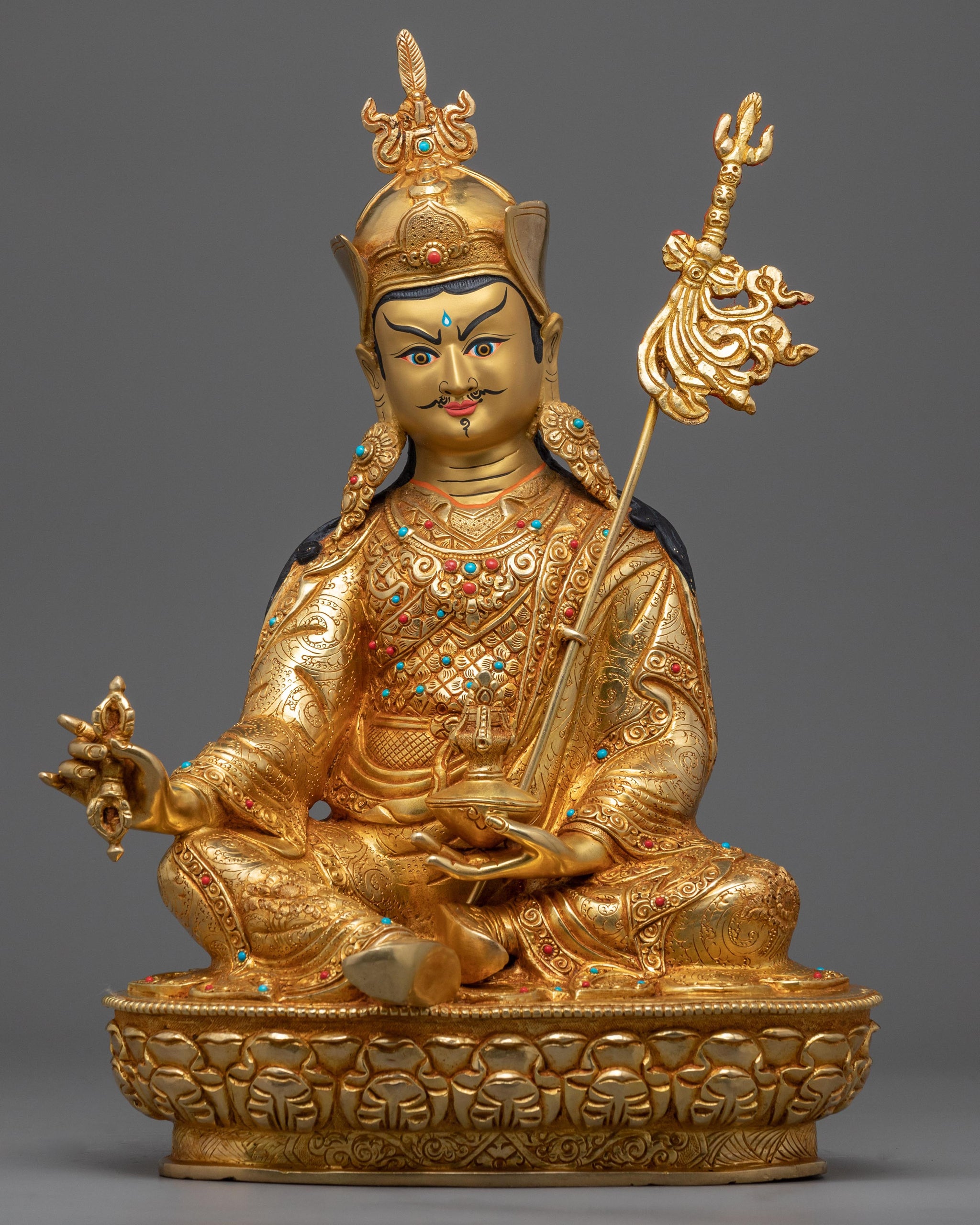 This beautifully crafted piece of Buddhist Guru Padmasambhava Statue employs traditional Himalayan motifs and designs delicately produced in our studio. The statue's copper body is gilded gold, giving it its sheen and brilliance. In the statue, the Lotus-Born is depicted regally seated atop a moon disc lotus seat holding a vajra in his left hand and a skull vase with a jar of immortality in his left. In the arc of his left hand, he holds the Khatvanga trident, his celestial ally of bliss and emptiness. The Guru's body is filled with artistically placed jewels that add to the statue's prominence.