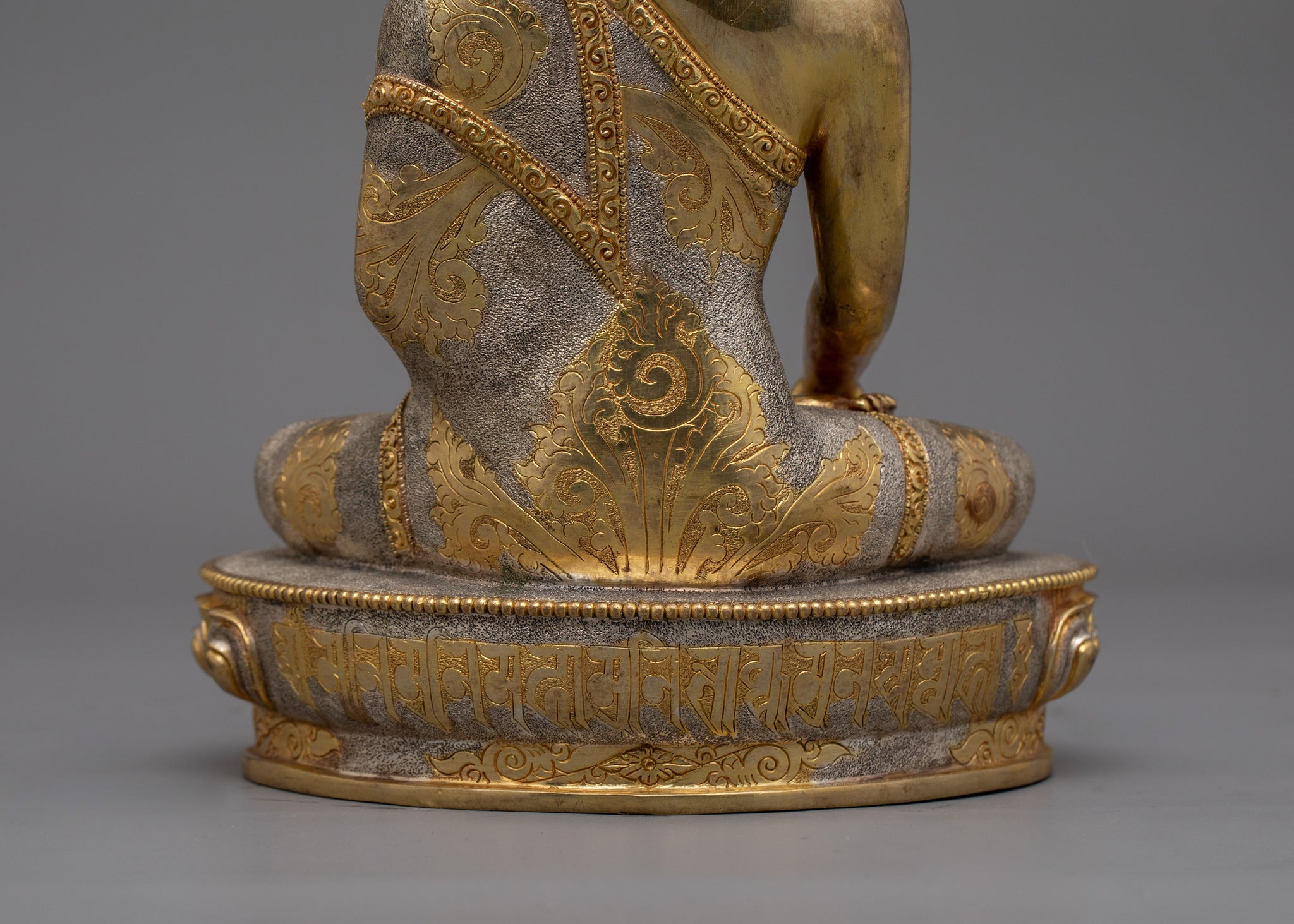 Shakyamuni Buddha is depicted sitting in the lotus pose (padmasana), indicating his steady concentration and mastery over the distractions of the material world. His right hand stretched toward the earth in bhumisparsha mudra, represents his moment of enlightenment, inviting the earth to witness his waking. The left hand, lying gently in his lap in dhyana mudra holding an alms bowl depicts the profound state of meditation and mindfulness that leads to insight and clarity.