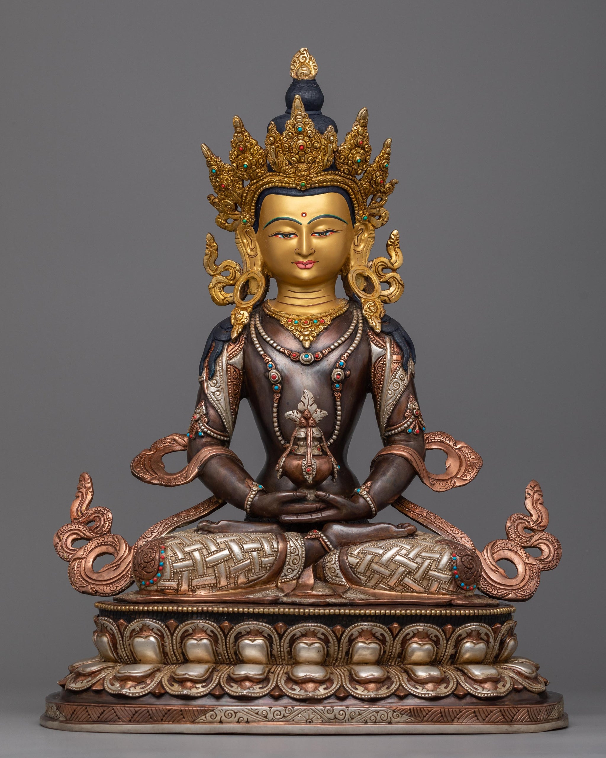 This magnificent Amitayus Buddhist Meditation statue has a height of an astonishing 18.5 inches and a base width of 14.1 inches. It is expertly made with an oxidized copper body, silver plating, and 24K gold gilding. A visually appealing and significant work of art is created by the meticulous detailing and vivid acrylic paints that bring the statue to life.