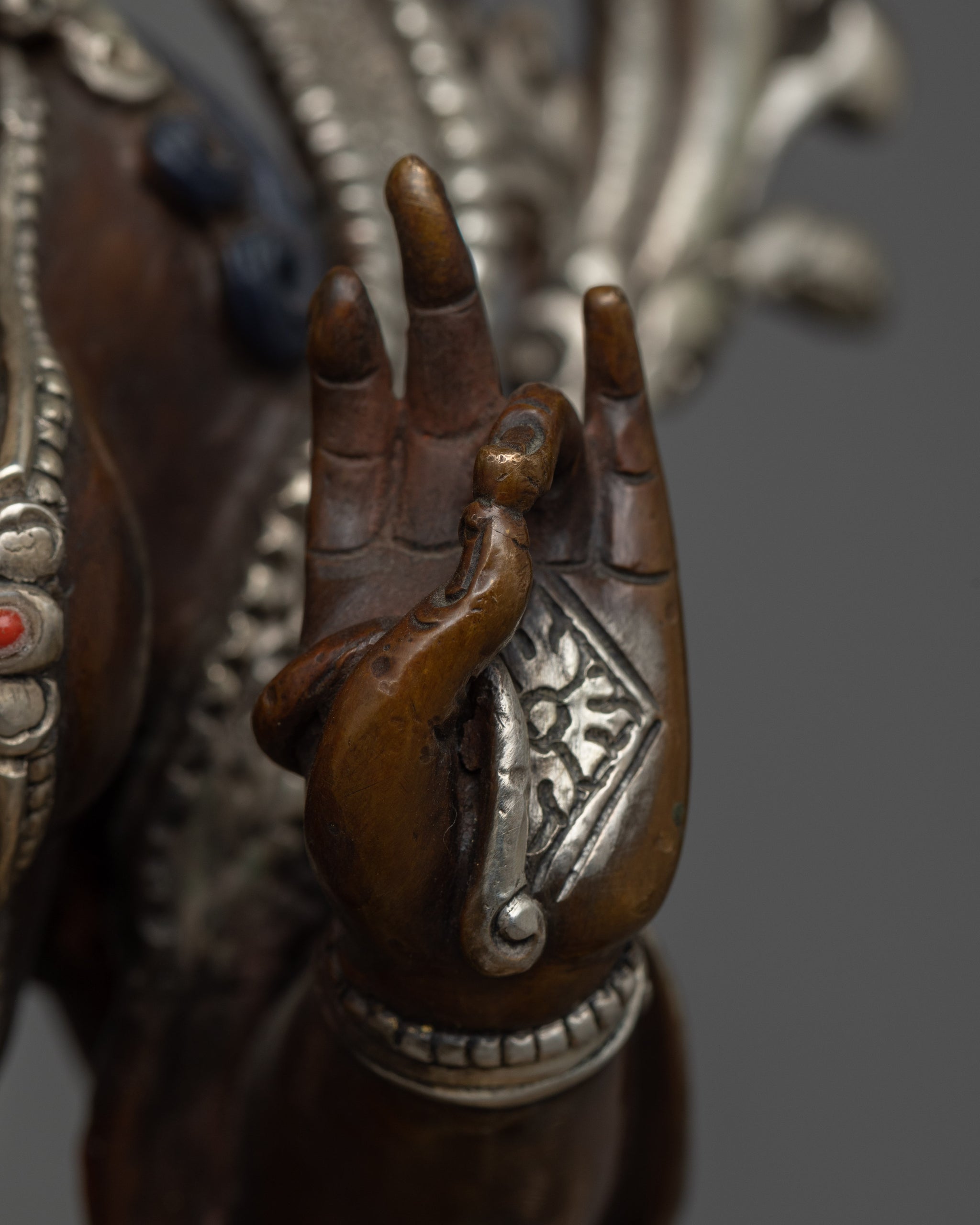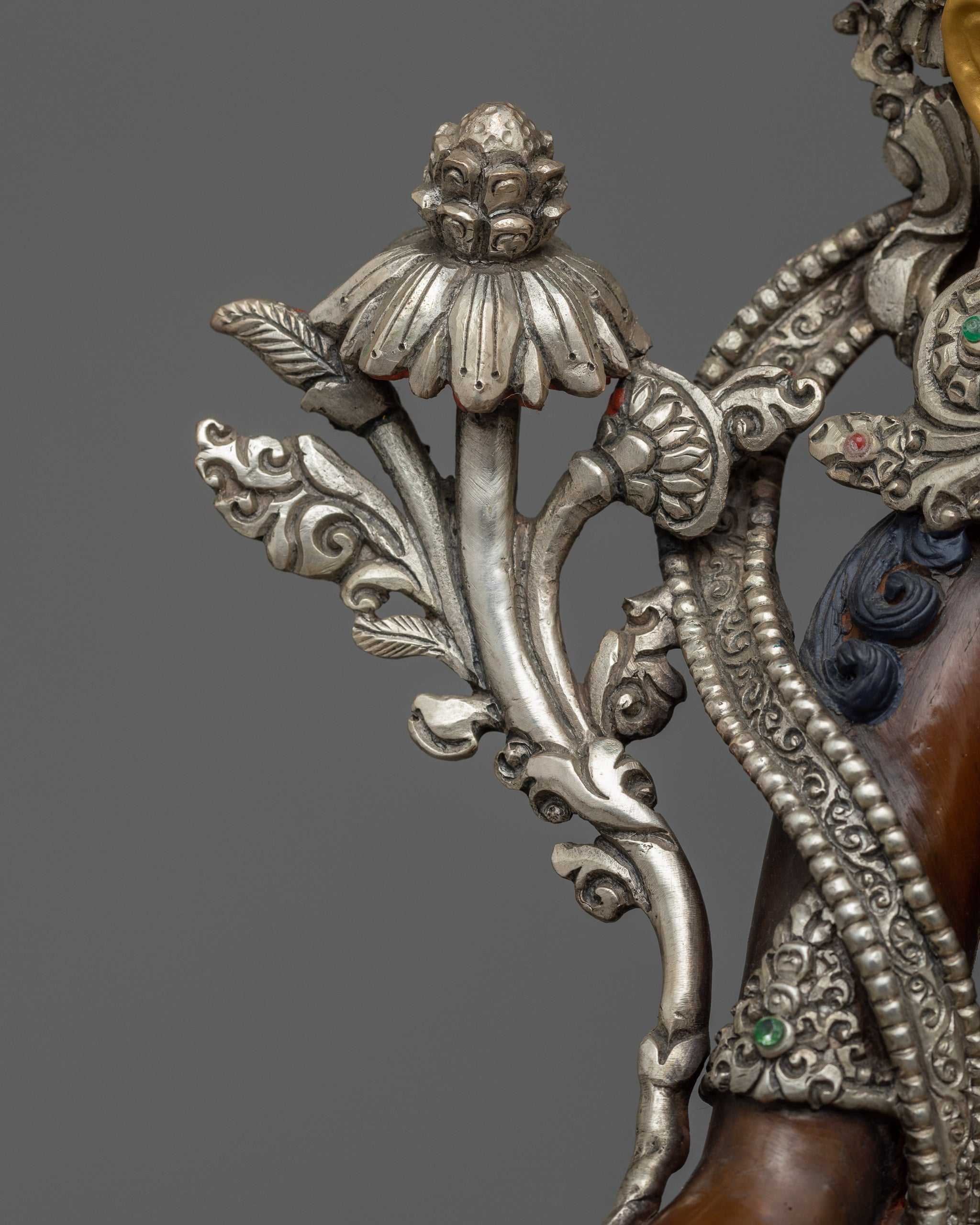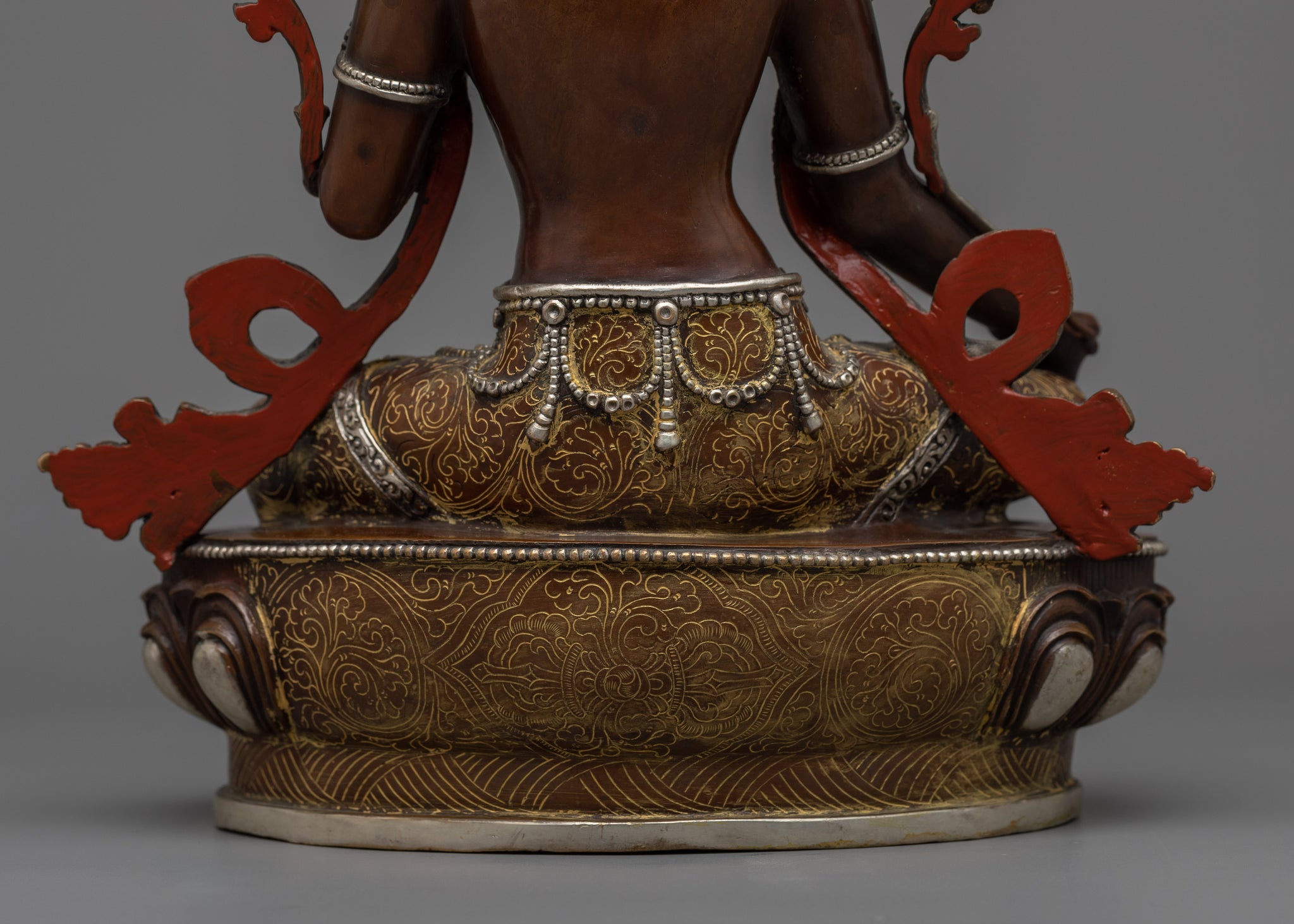 Vajrayogini is stunning. The details are amazing. It's easy to make out her facial expressions, skulls, feet, and the ring of fire around her. You can tell she's handmade. There is a consecration hole in her back.