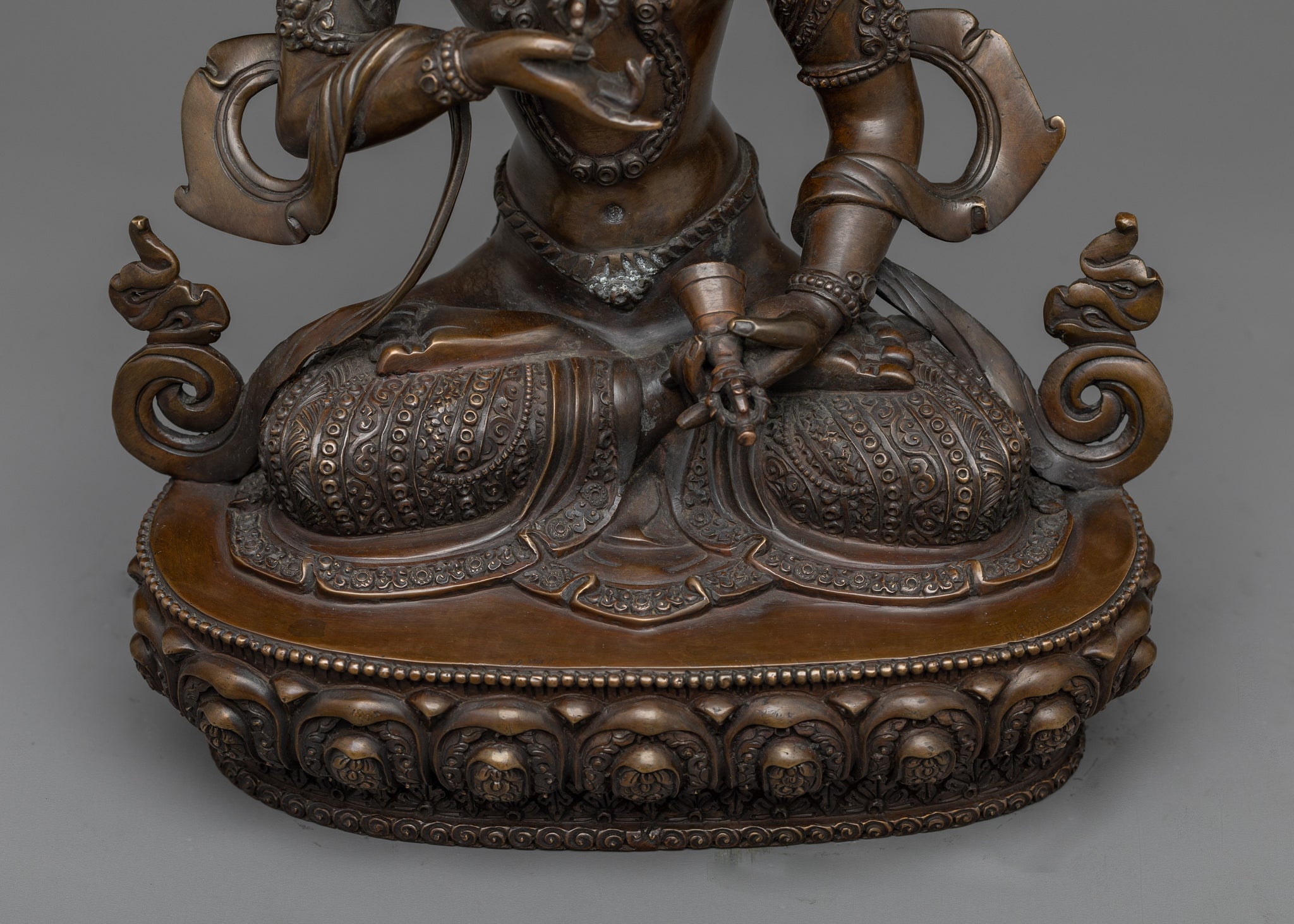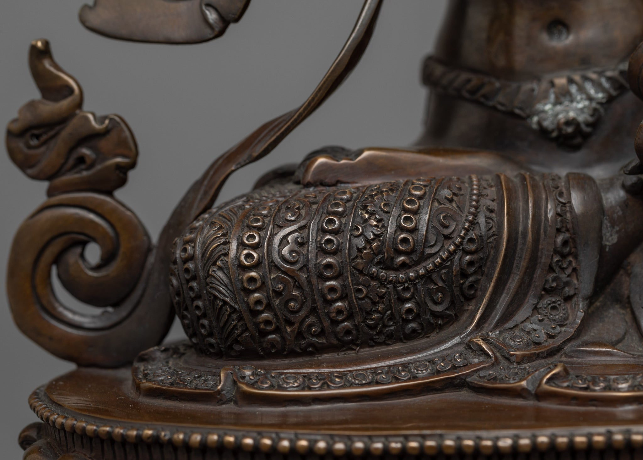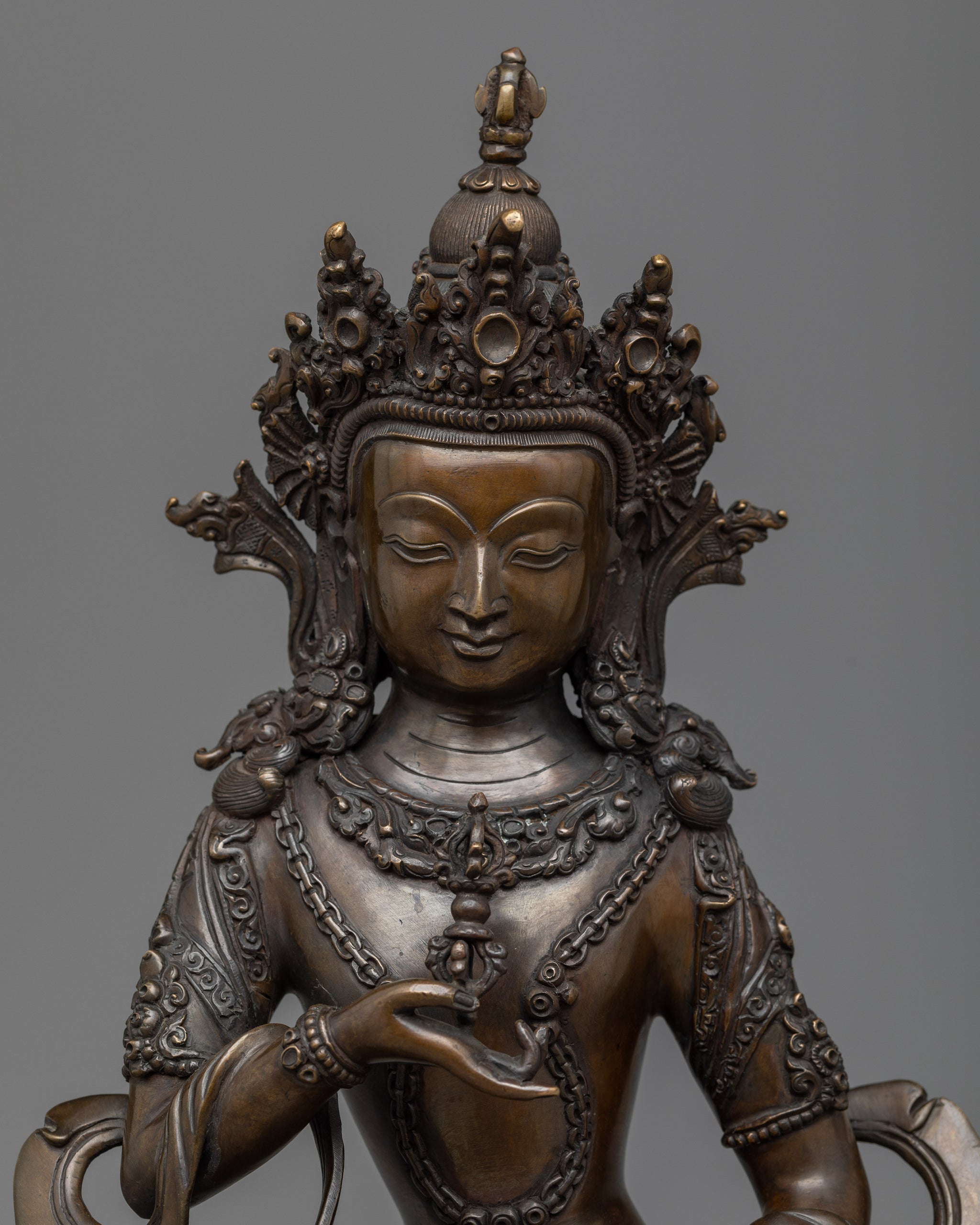 Our statue is made of pure oxidized copper and exudes a sense of timeless tradition and spiritual depth. The complex hand-carved designs, paired with the one-of-a-kind patina of the oxidized copper, bring to life Vajrasattva's tranquility and purifying force.
