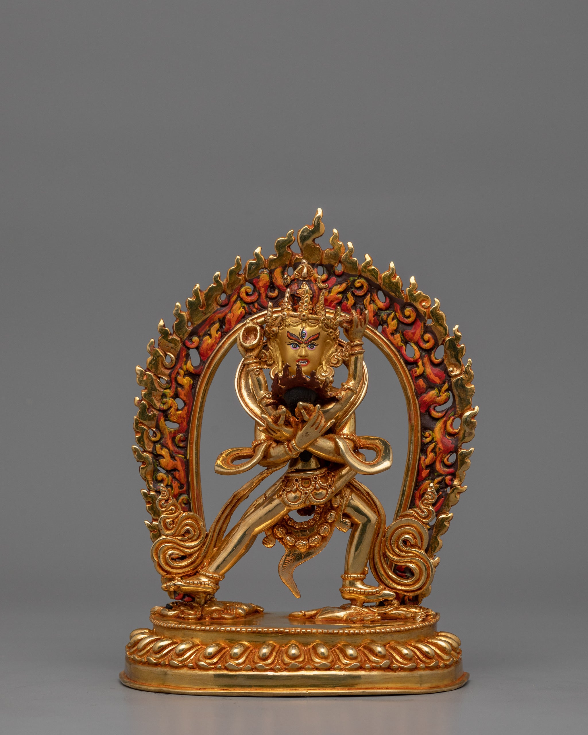 This Chakrasamvara Deity figurine, measuring at 7.9 inches (20 cm) tall with a 5.9-inch (15 cm) base. It is made from copper and gilded with 24K gold. The statue features gold and acrylic paintings. Designed by talented Nepalese artisans, this detailed sculpture is ideal for altars, meditation areas, or as a meaningful decor item for individuals seeking awareness in their daily life.