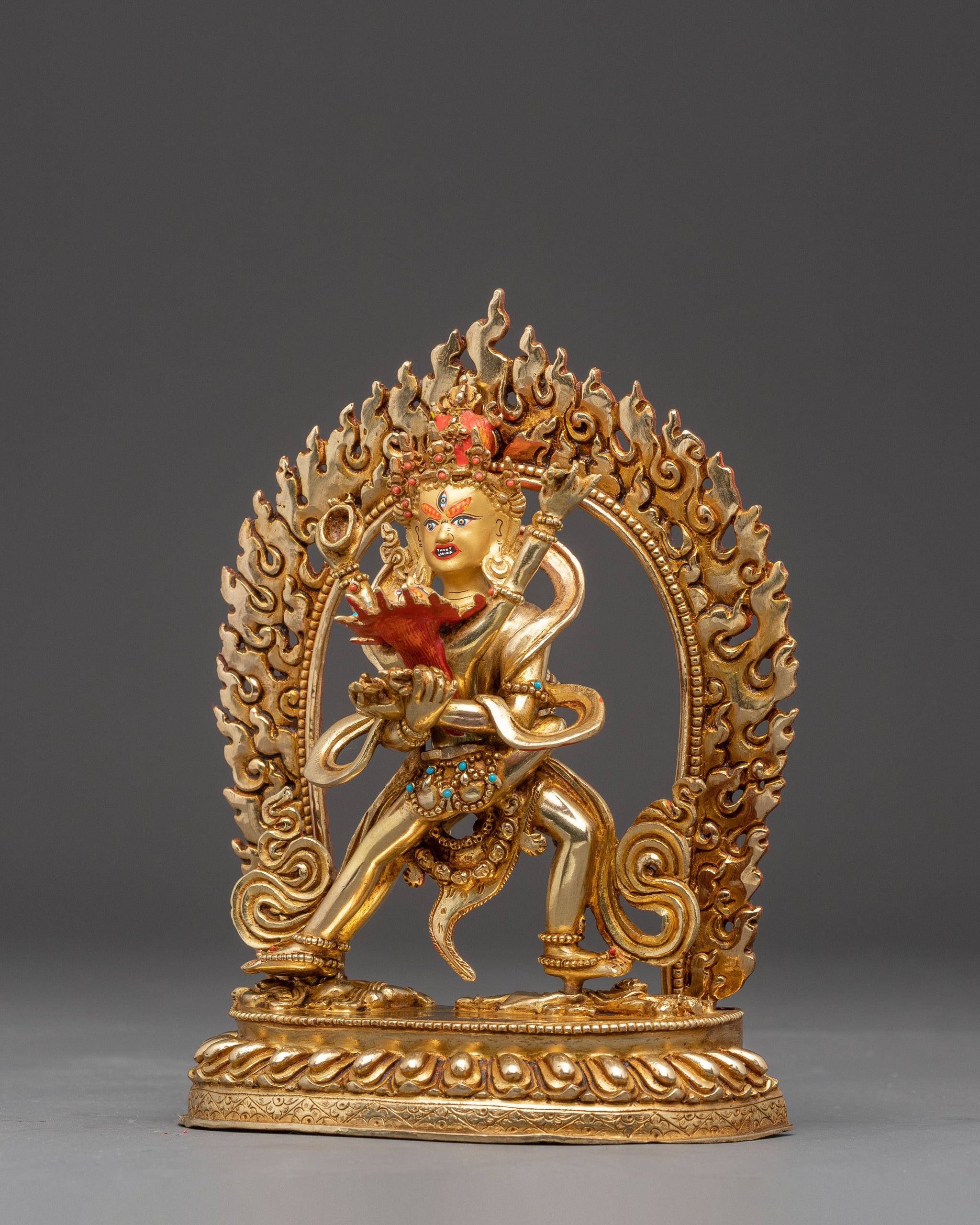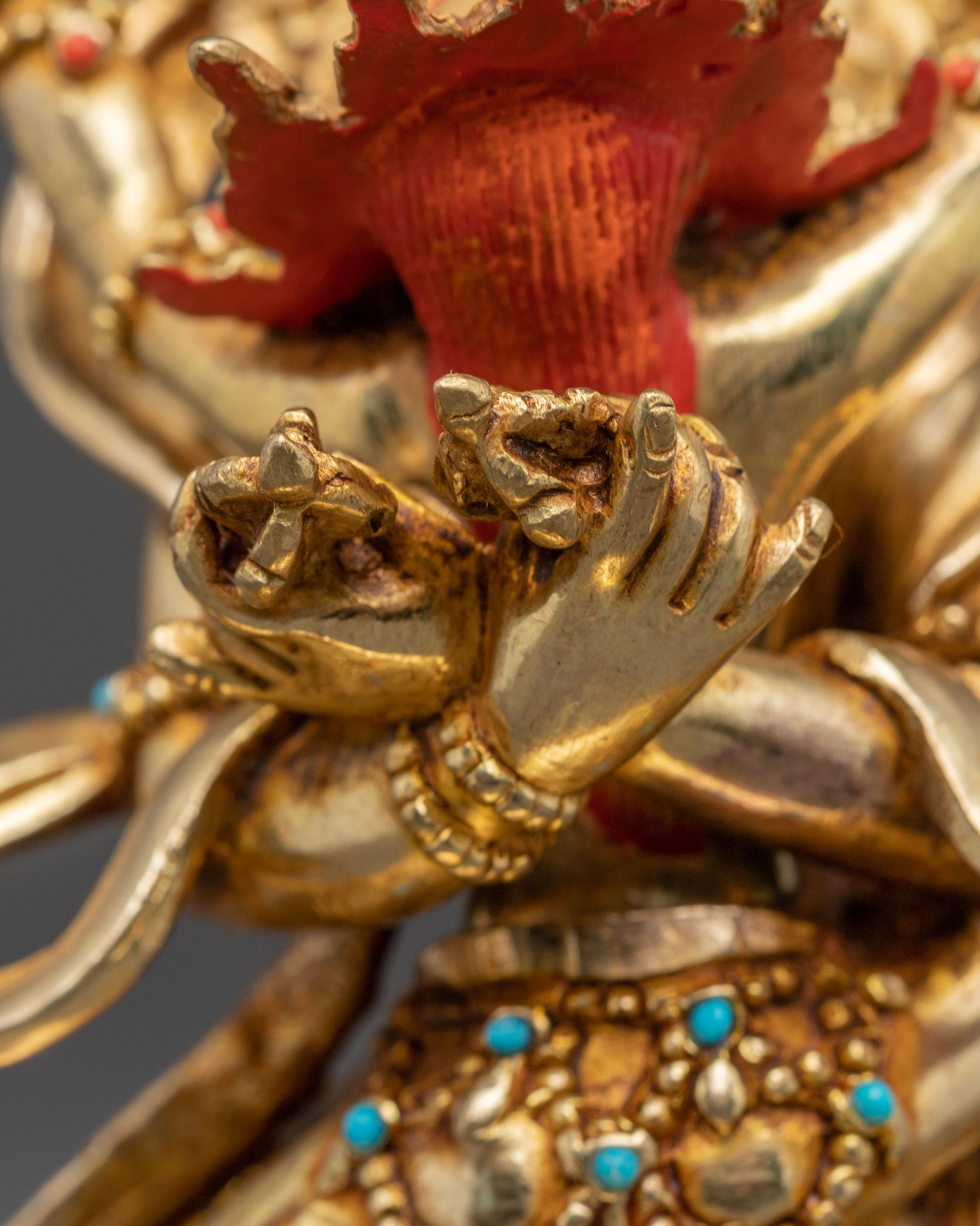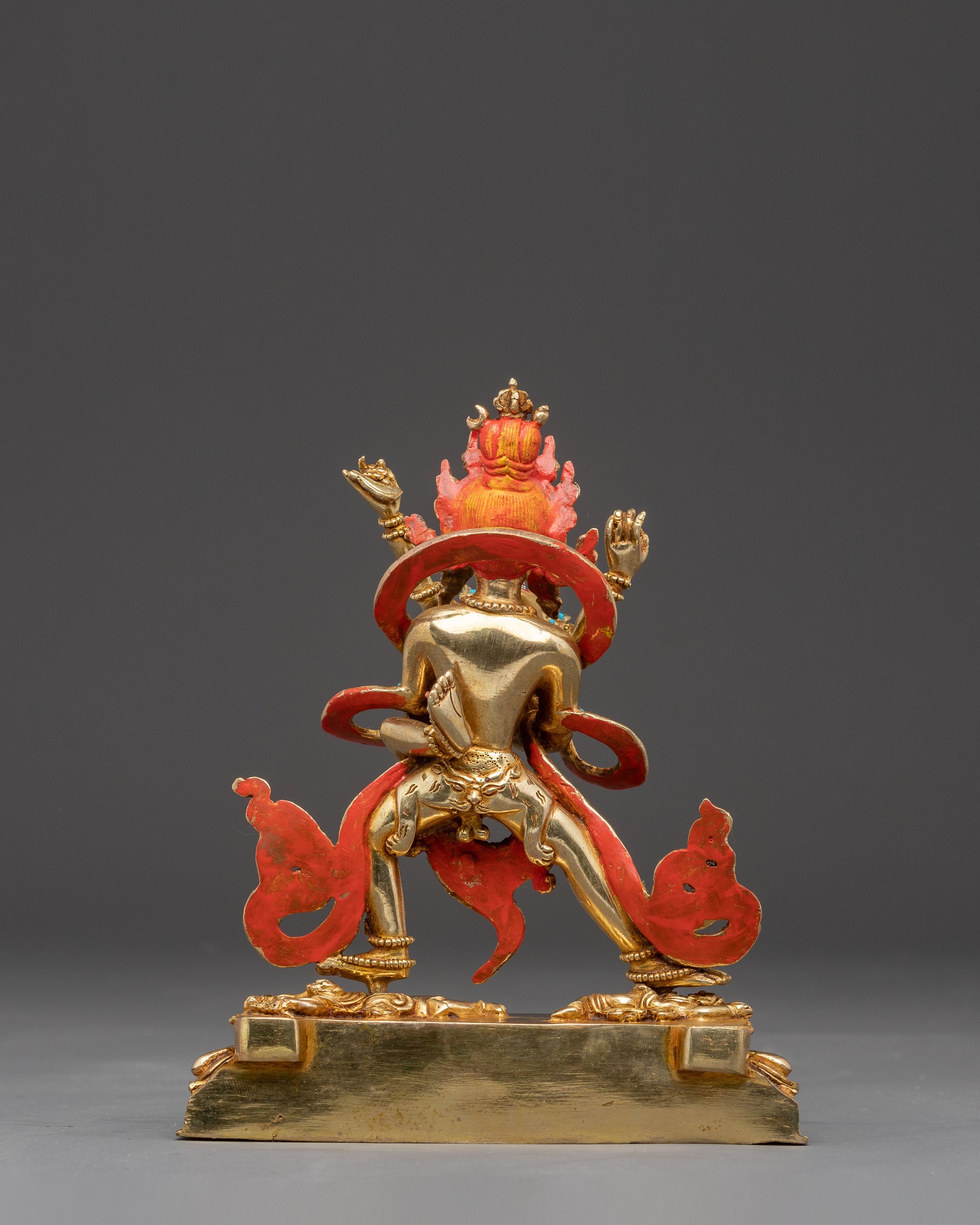 Chakrasamvara is depicted in a dynamic dancing posture upon a lotus base, symbolizing the union of wisdom and compassion. He is shown in embrace with his consort, representing the inseparable harmony of method and insight. His body is adorned with a five-jeweled crown, bone ornaments, and a halo encircling his head, signifying radiant spiritual power. With three eyes, Chakrasamvara perceives the past, present, and future, embodying complete awareness. This powerful image conveys the transcendence of duality and the victory over inner and outer obstacles, making it a profound representation of tantric realization.