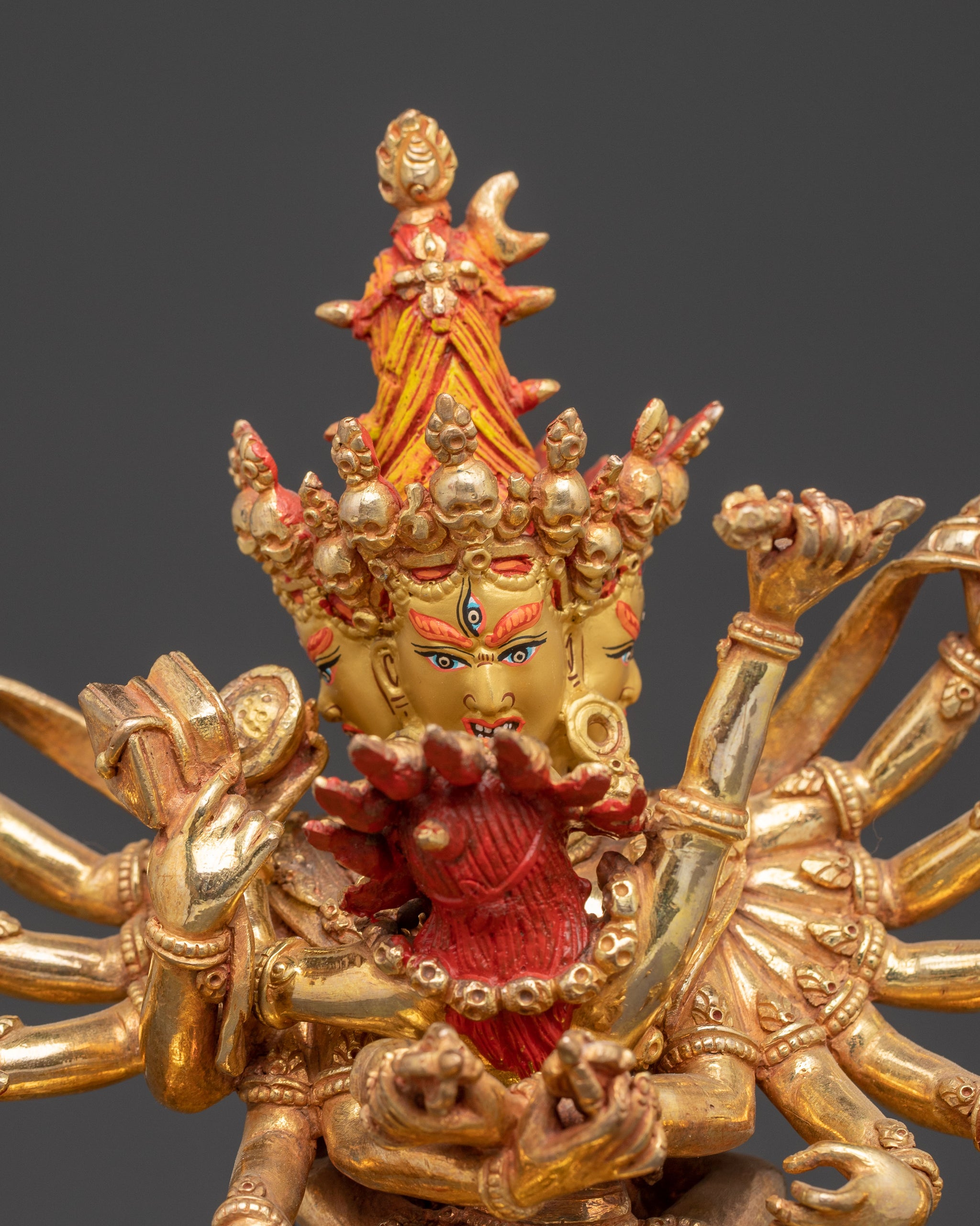 Chakrasambhara is depicted in a dynamic dancing posture, symbolizing the union of wisdom and compassion. His wrathful expression radiates transformative power, while his multi-armed form signifies his mastery over many realms. The intricate details of his attire, weapons, and mudras reflect his role as a powerful tantric deity capable of subduing negative forces and guiding practitioners toward enlightenment. This statue serves as a powerful reminder of the fierce compassion and wisdom necessary for spiritual transformation.