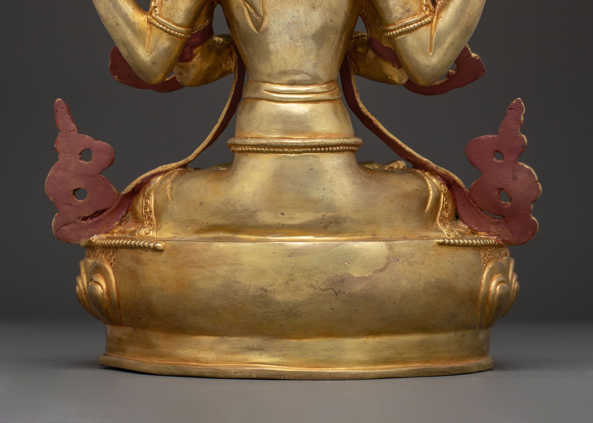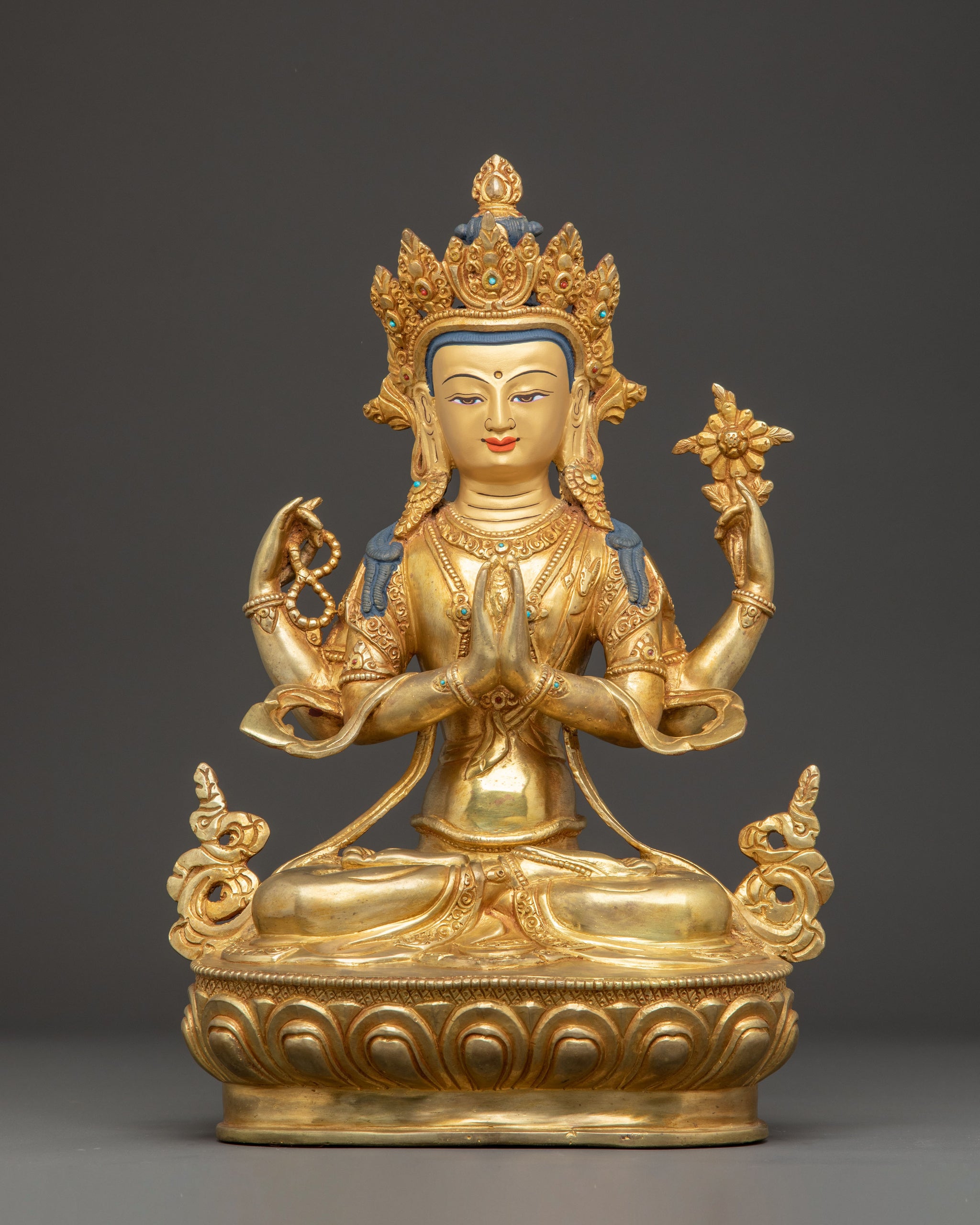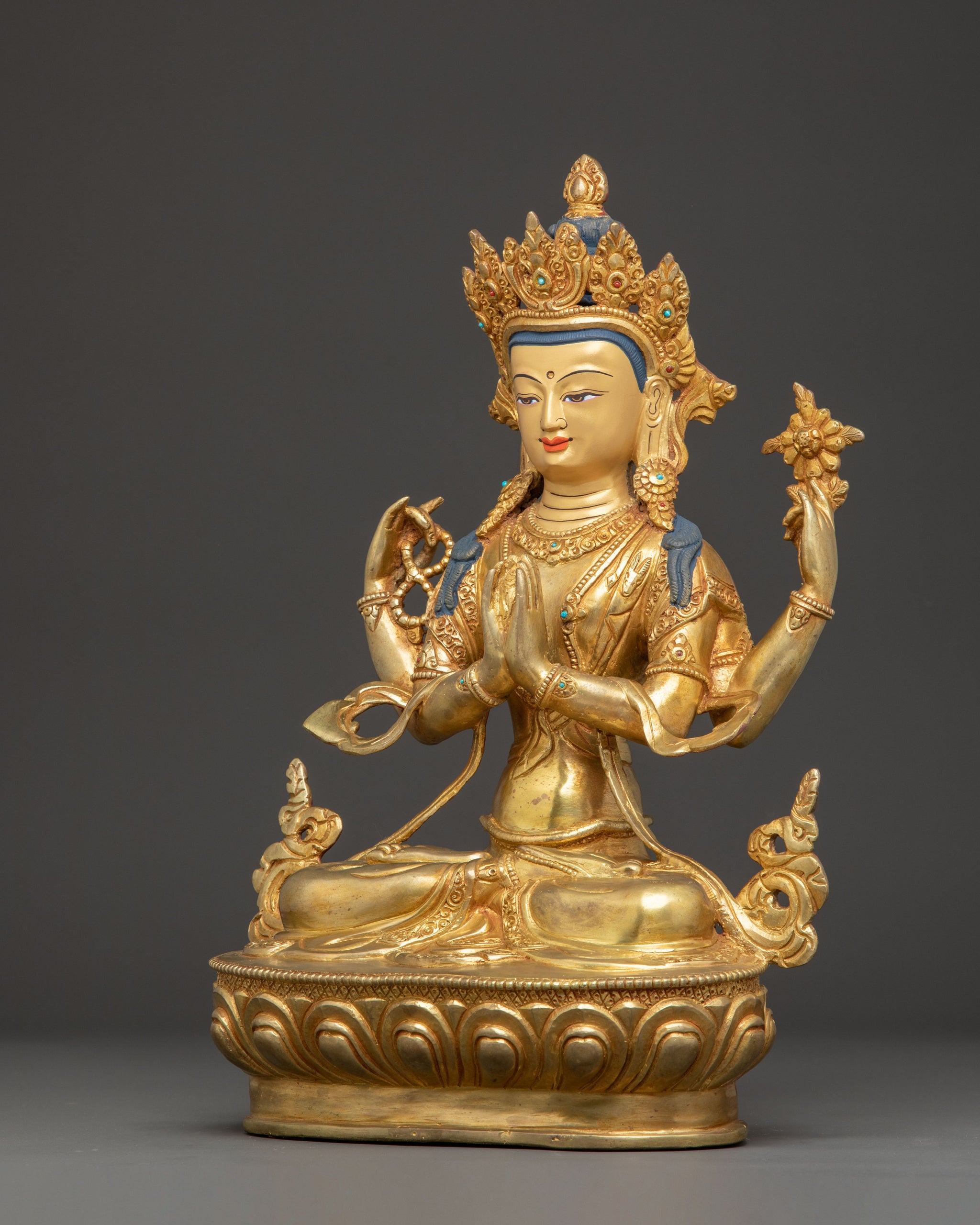 Chenrezig Artwork: Lord of Compassion stands 14.6 inches (37 cm) tall with a base width of 10.2 inches (26 cm), weighing 4.92 kg. Expertly handcrafted from copper, it is adorned with 24K gold gilding, intricate gold and acrylic paintings, and gemstones that enhance its sacred elegance. This finely detailed statue radiates spiritual grace and traditional Himalayan artistry, making it a meaningful addition to any altar, meditation space, or collection of sacred Buddhist treasures.
