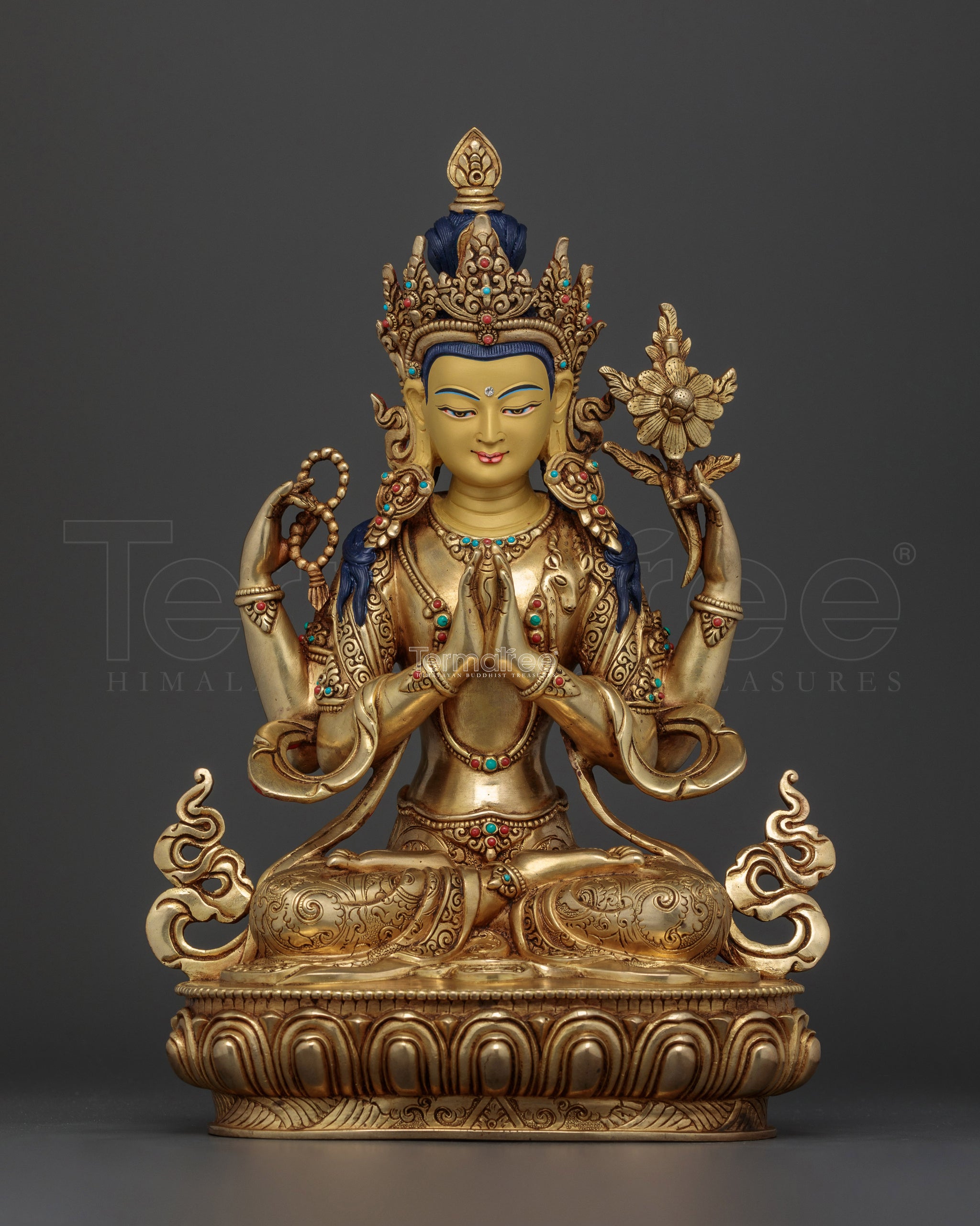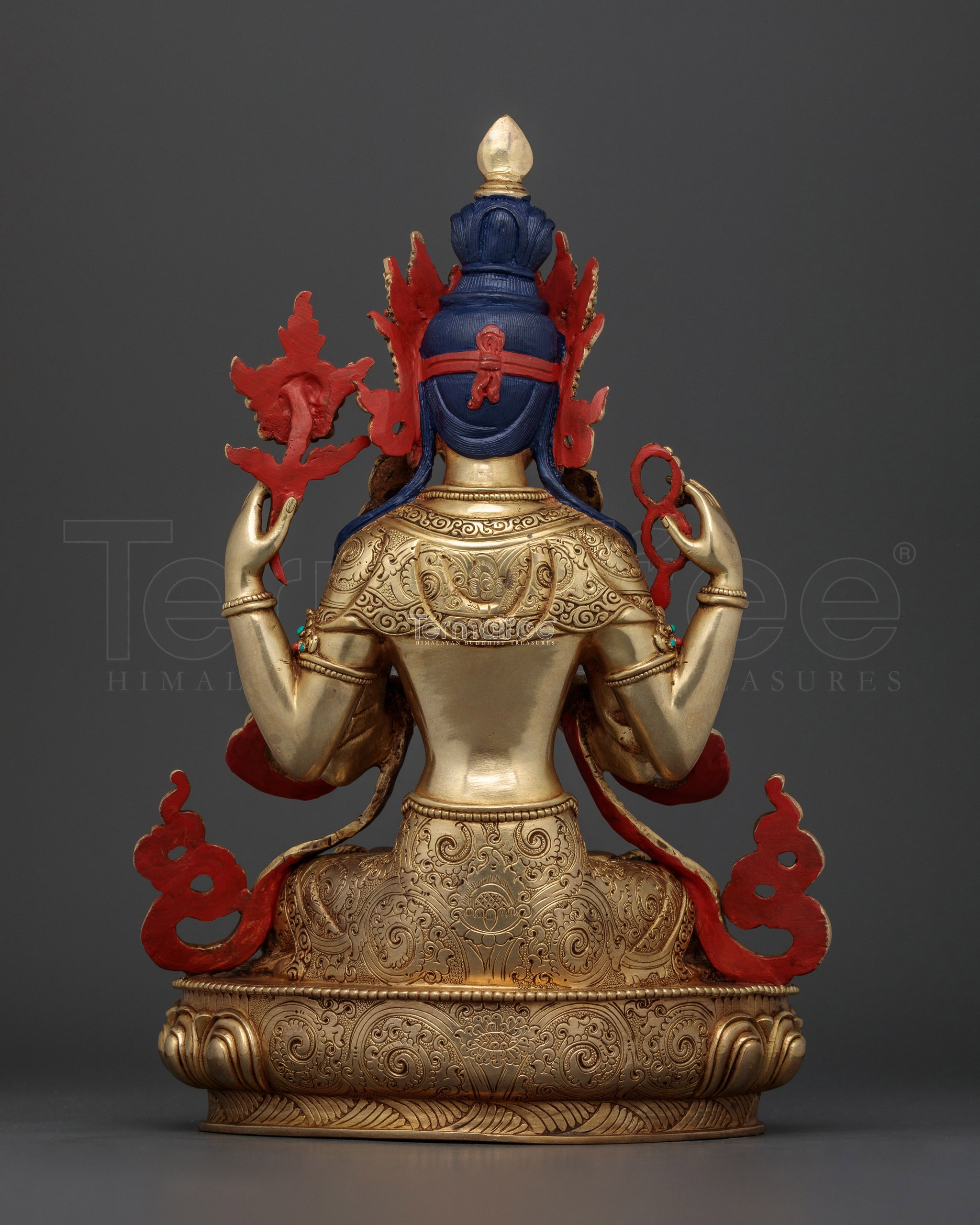 This stunning Chenrezig Beautiful Copper Statue depicts Chenrezig in a calm, contemplative pose. His four arms represent the four immeasurable characteristics of a Bodhisattva: lovingkindness, compassion, sympathetic delight, and serenity. Each hand carefully holds symbolic artifacts, such as a lotus flower and a wish-fulfilling jewel, representing purity and the ability to relieve the suffering of all sentient beings.