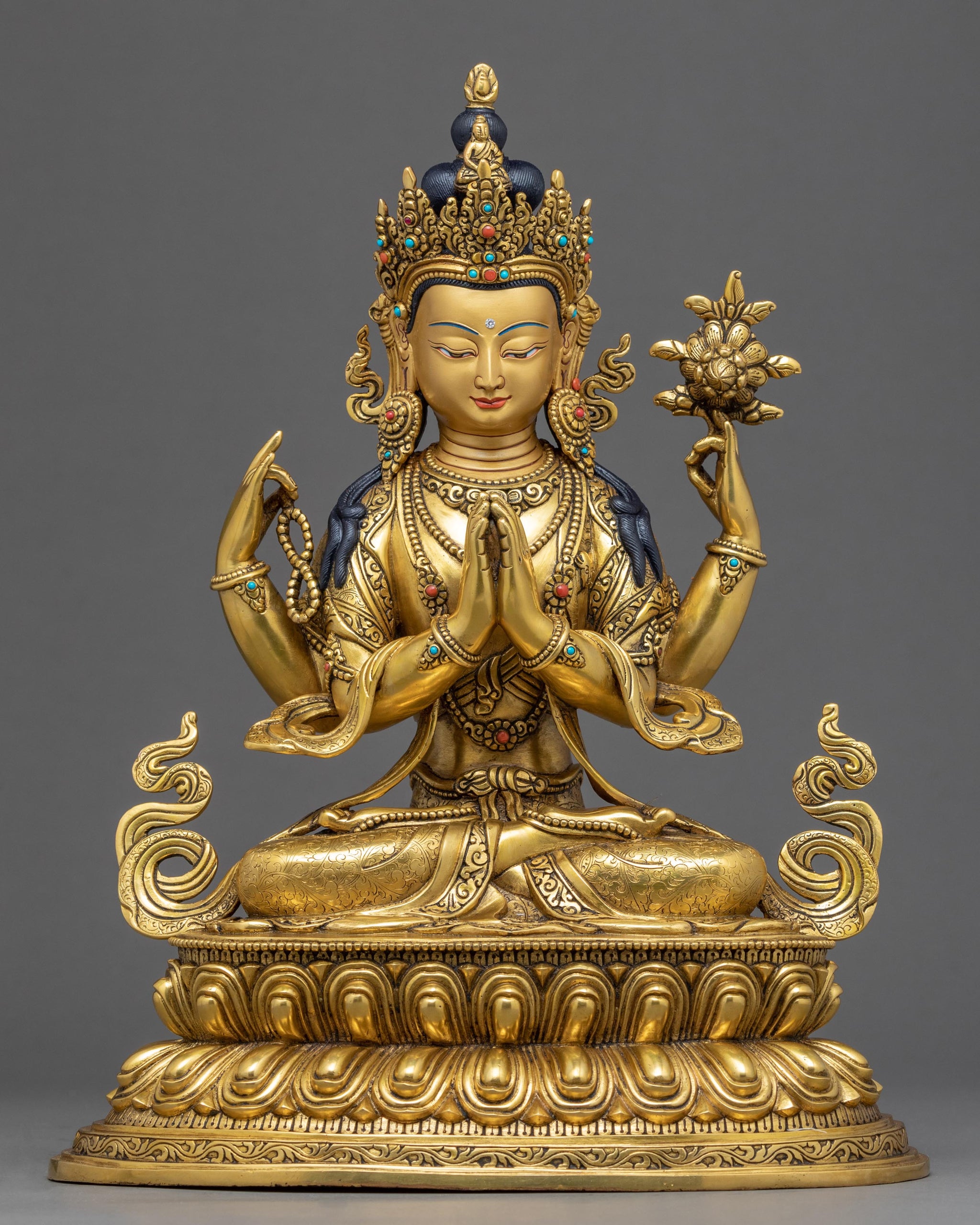 We are the artist of Kathmandu who has sculpted the sculpture of Bodhisattva Chenrezig in the traditional Himalayan Art of Nepal. It took more than a month for us to complete the art since we have designed exquisitely and finely handcrafted in pure copper body and gilded it with genuine 24k gold. We have magnificently adorned the crown with precious turquoise and corals and elegantly embellished the ornaments with valuable pearls and jewels. The materials used in this statue are of high quality, and we assure you that they will last for many years. We have depicted a deity seated atop a moon disc lotus seat with a serene expression.