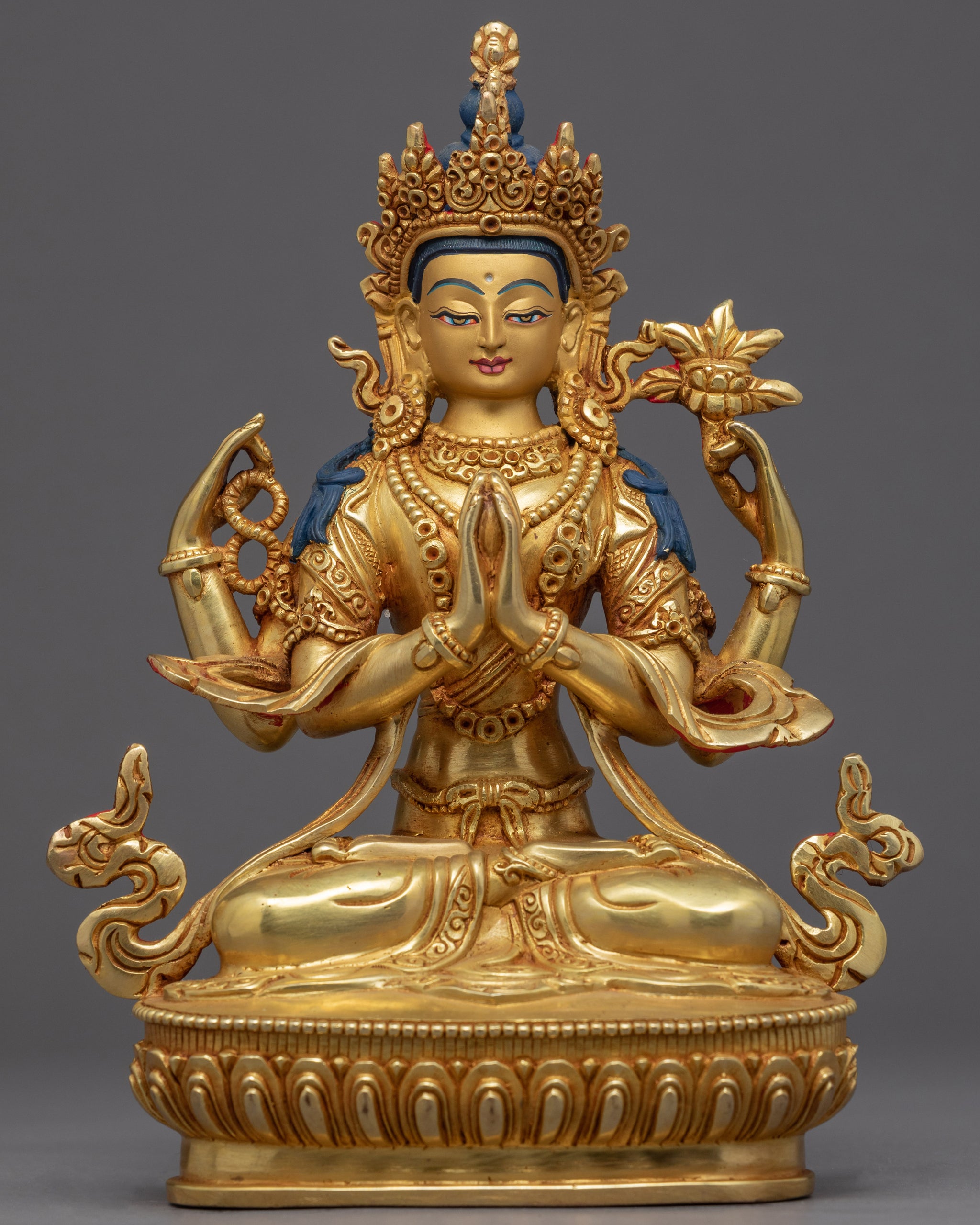 We are Vajrayana sculpting Buddhist sacred deities artists, and our craftsmanship has been passed down to us for generations. We hand-carved this beautiful Chenrezig Bodhisattva statue in the traditional Himalayan Art of Nepal. We have depicted a deity seated atop a moon disc lotus seat with a serene expression. We have depicted a deity sitting atop a moon disc lotus seat with a peaceful expression. A beautifully adorned crystal rosary and lotus are held in the upper right hand and upper left hand, respectively. We have sculpted him on a copper body and gilded him in genuine 24k gold.