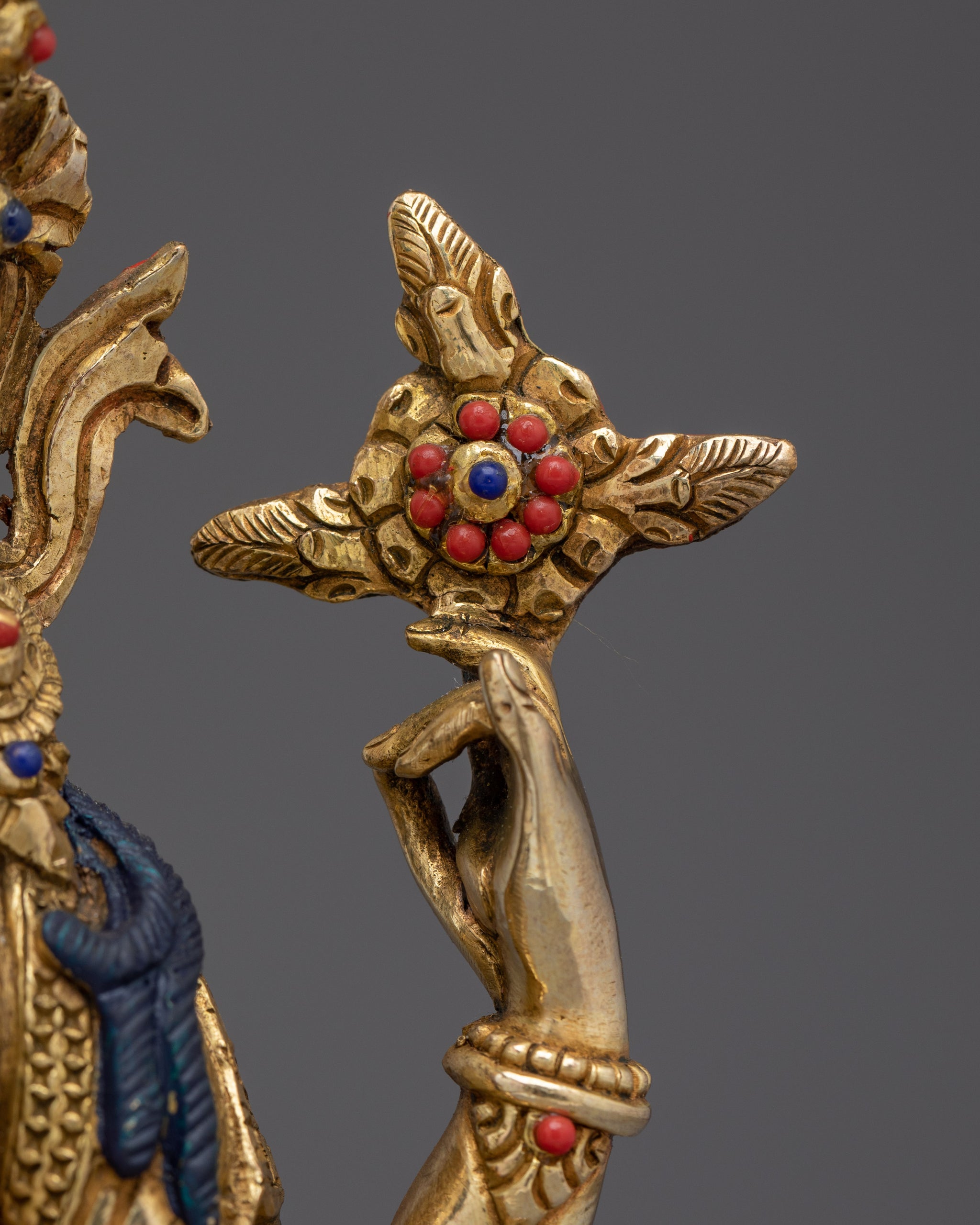 Compassion symbolized, this stunning Chenrezig Buddha Copper and Gemstones Statue is carefully crafted with a copper body and coated in 24K gold. The jewels set into the base and crown give a layer of spiritual energy, and the intricate acrylic and gold painting highlights the vibrant colors. This magnificent artwork, which stands 9.4" (24 cm) tall and weighs 1.89 kg, will provide a powerful presence to any altar or meditation area.
