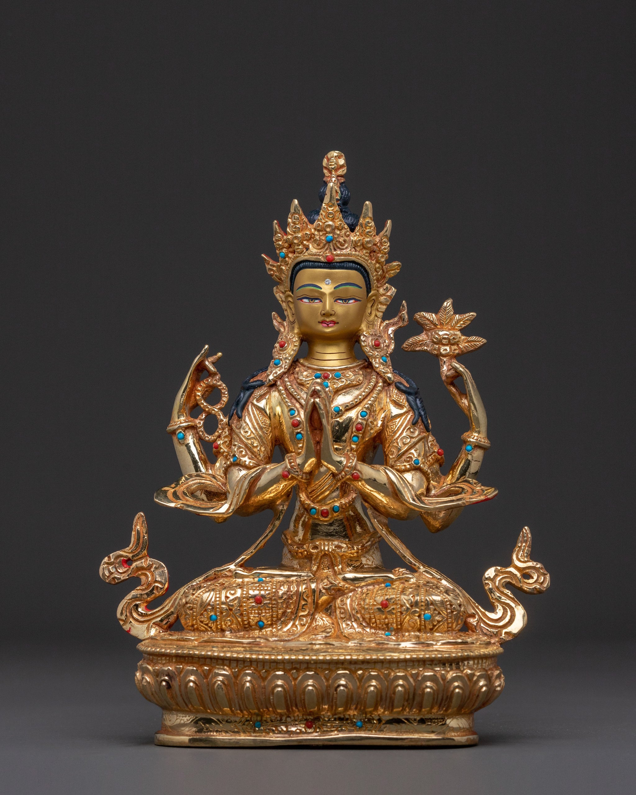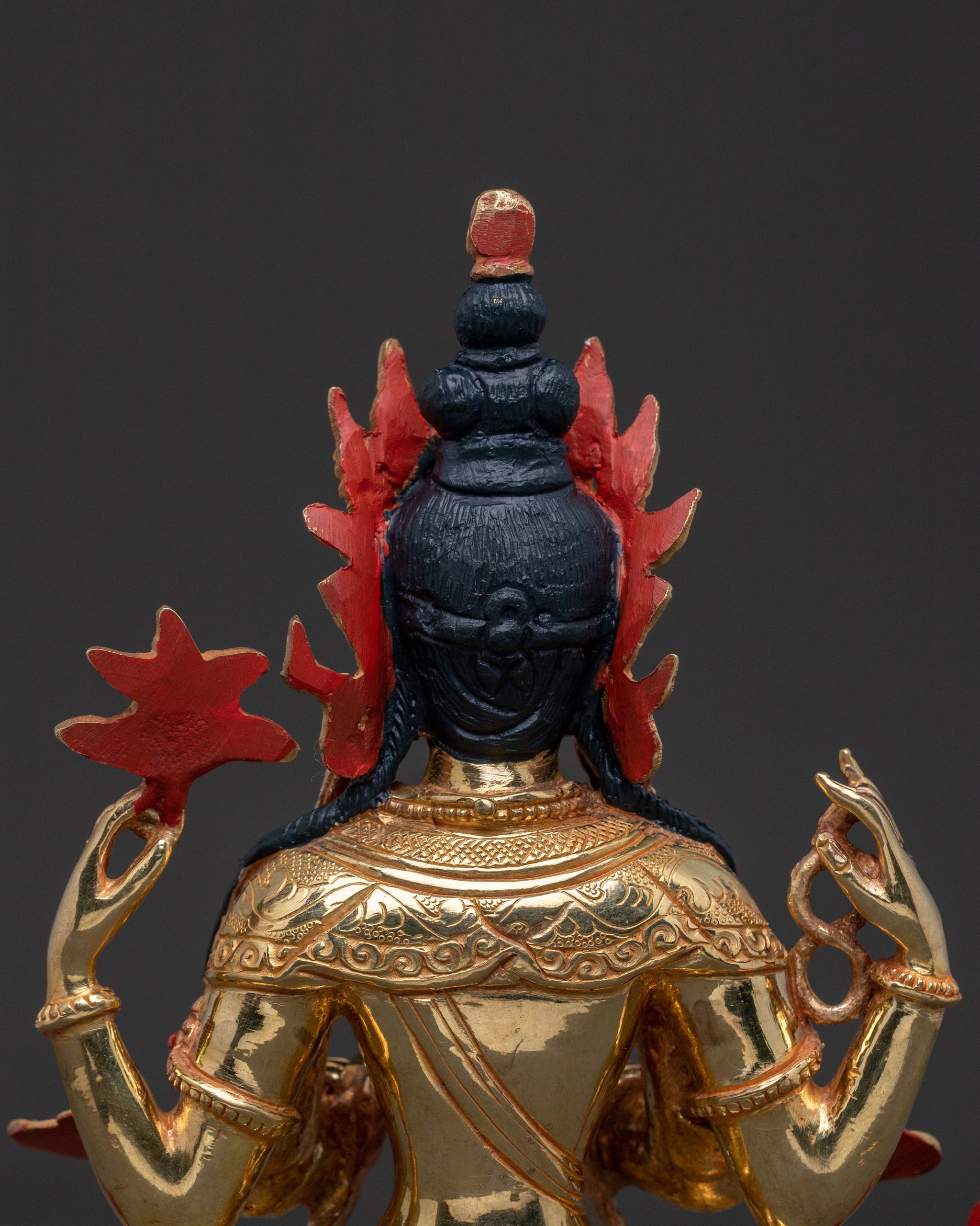 The four-armed Chenrezig holds the wish-fulfilling jewel at his heart, symbolizing universal love and the power of prayer. His other hands hold a crystal mala and a lotus flower, representing the constant turning of the Dharma wheel and the purity of compassionate action. This portrayal, subtly adorned with gemstones, inspires devotion and the cultivation of boundless compassion.