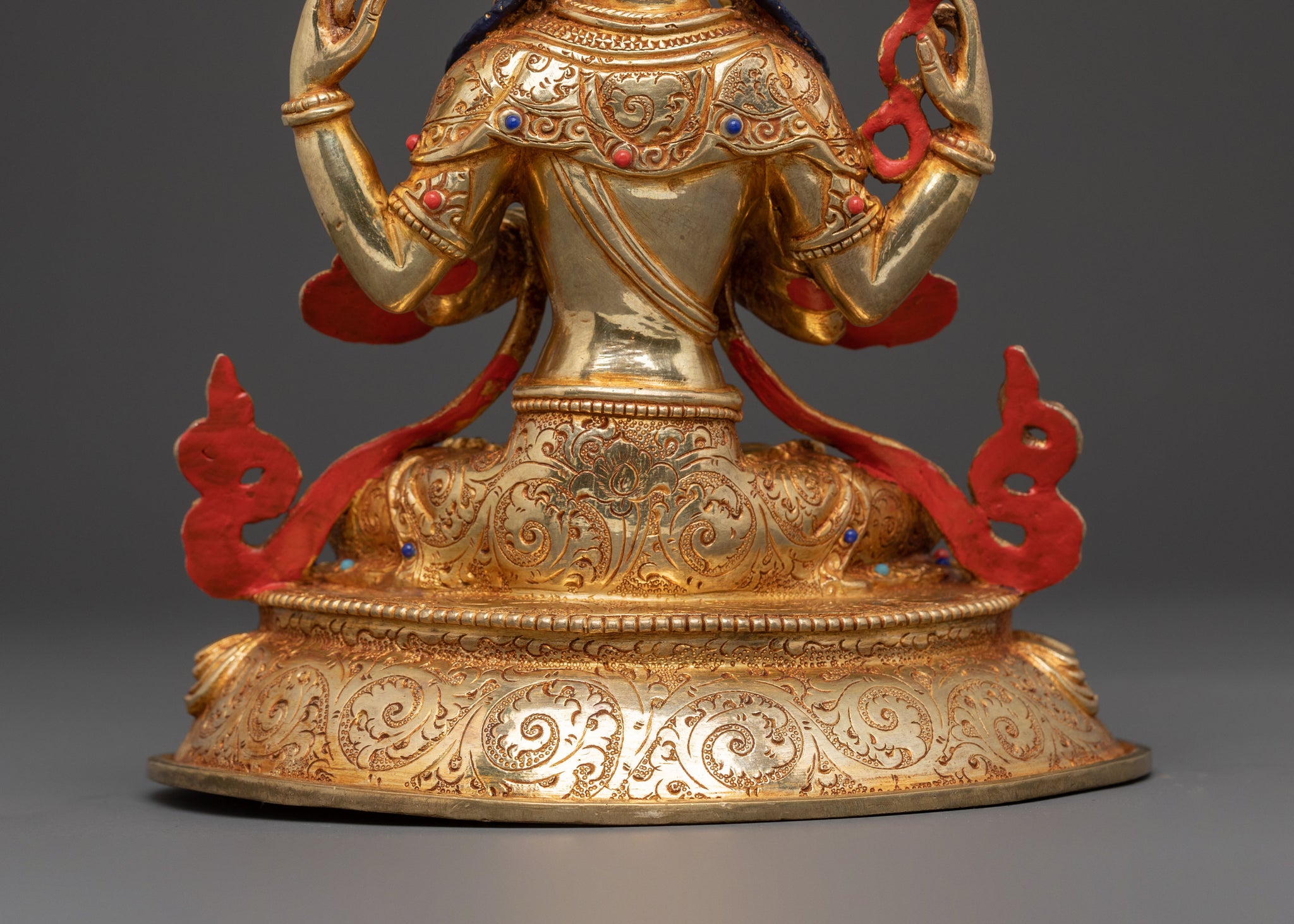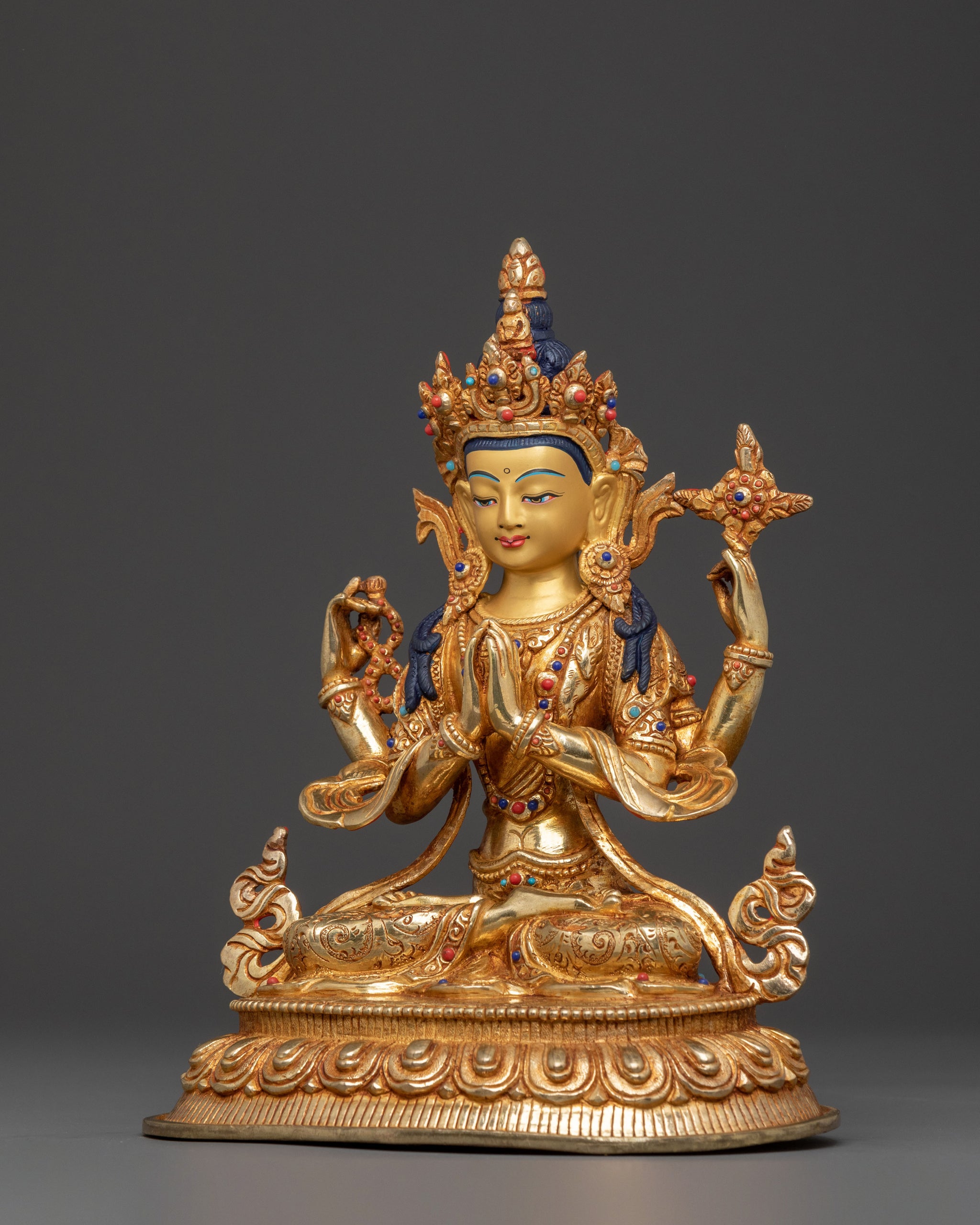 Chenrezig is depicted with four arms, symbolizing the Four Immeasurable Thoughts, with his principal hands held in prayer at the heart. This iconography represents infinite compassion, mercy, and wisdom, following traditional Tibetan Buddhist representations. The serene posture and intricate detailing inspire devotion, mindfulness, and a deeper connection to the qualities of universal love.