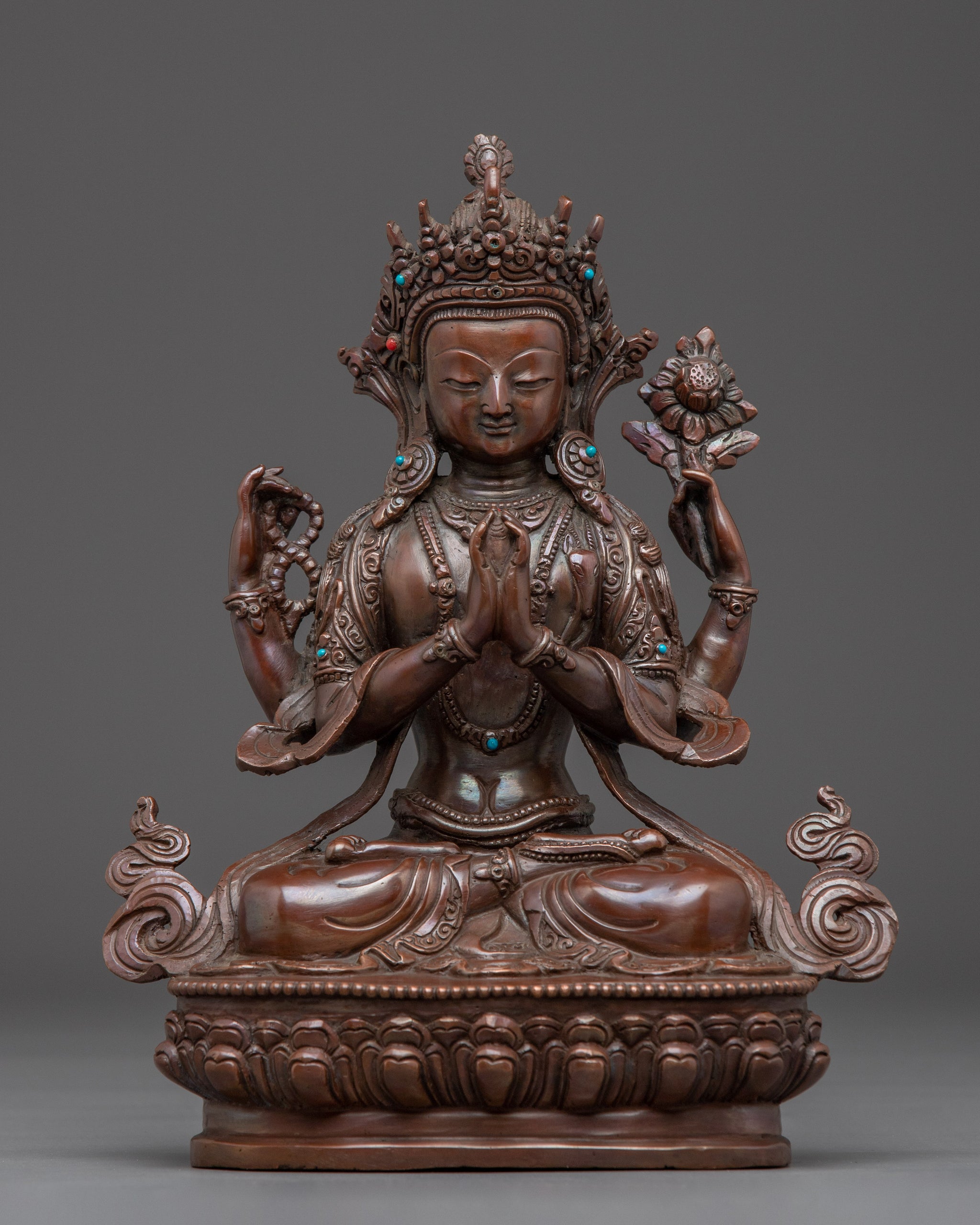 This Chenrezig Oxidized Copper Artwork, known as the embodiment of boundless compassion, represents boundless love, peace, and the desire to alleviate the suffering of all beings. This handcrafted statue is 9.3" (Height) x 7.5" (Base) and weighs 2.07 kg. It is made of oxidized copper. This sculpture, created by expert Nepalese artisans, symbolizes the spiritual traditions of Himalayan Buddhism and makes a meaningful addition to altars, meditation places, or sacred collections.
