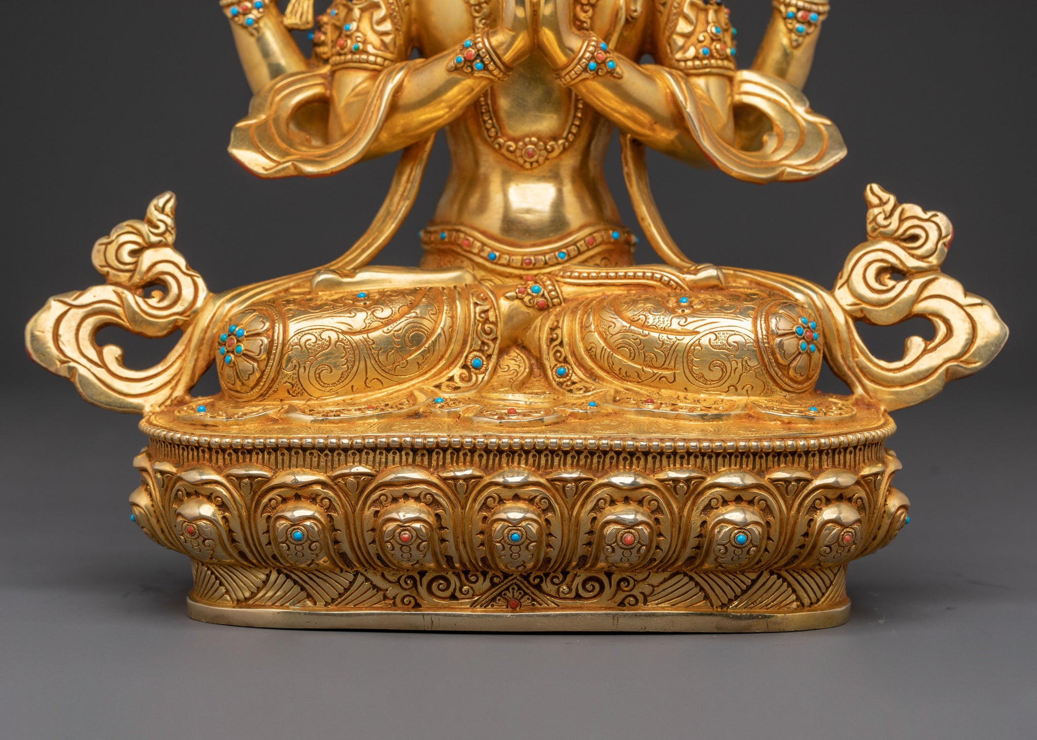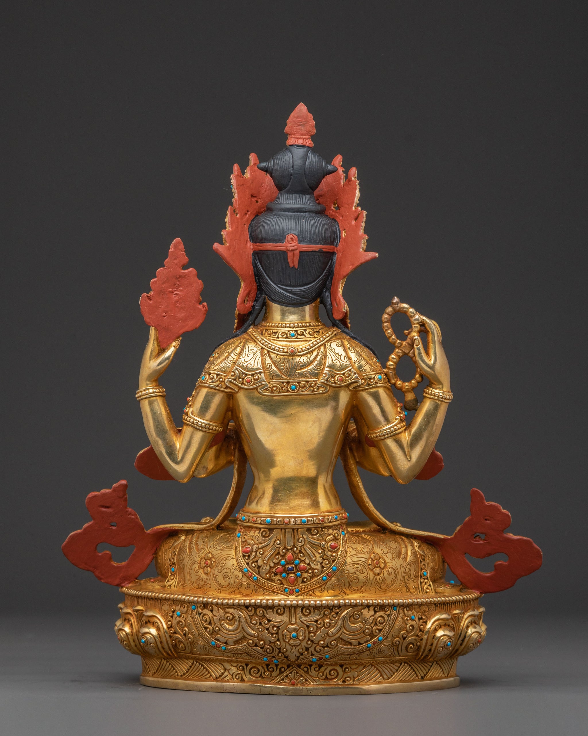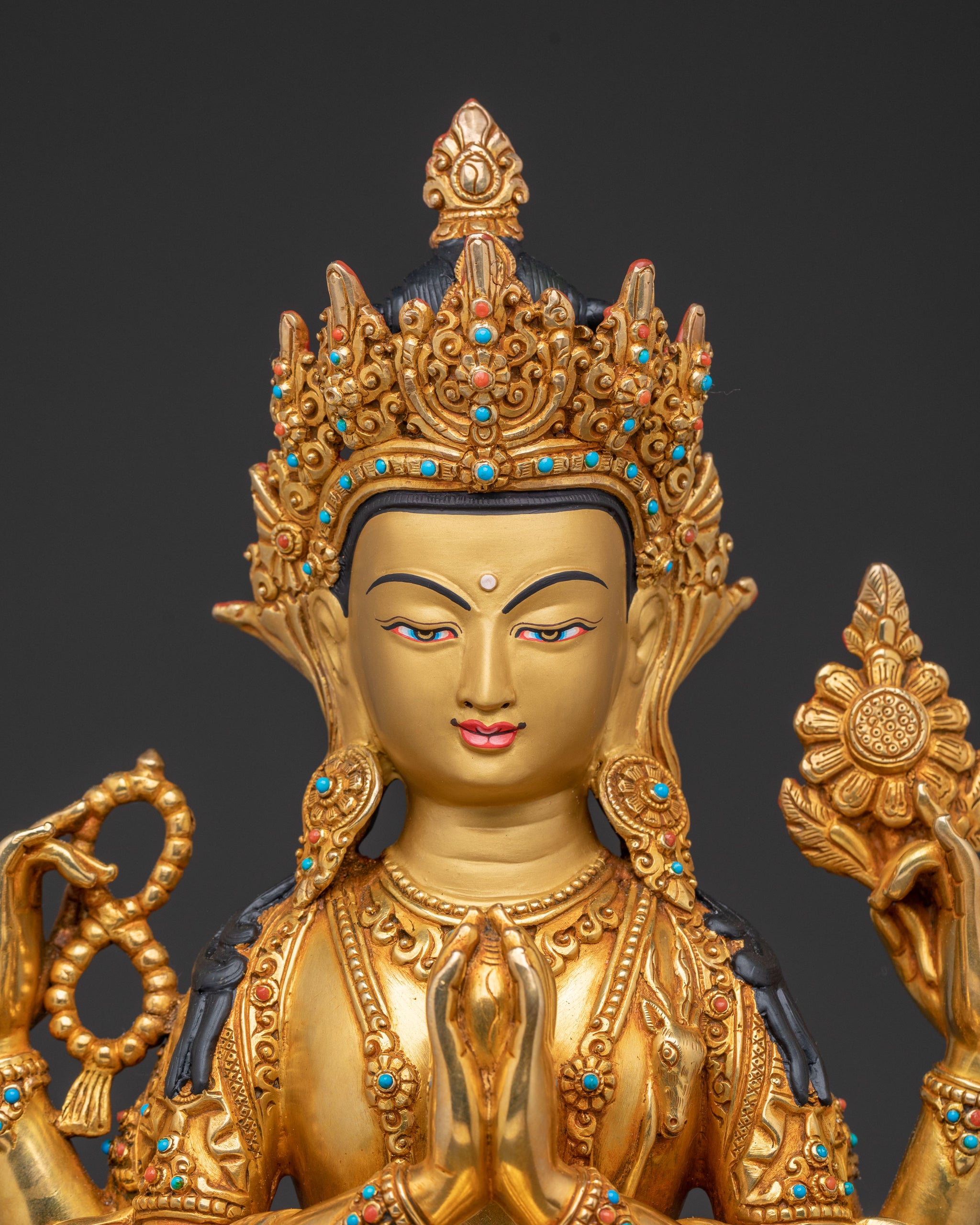 As the Bodhisattva of Compassion, Chenrezig's four arms symbolize the boundless reach of his enlightened activities to benefit all sentient beings. His main hands are joined in Anjali mudra, holding a wish-fulfilling jewel, while the others hold a crystal mala and a lotus flower. This statue serves as a profound reminder of the power of unconditional love and protective energy, inspiring peace and kindness.
