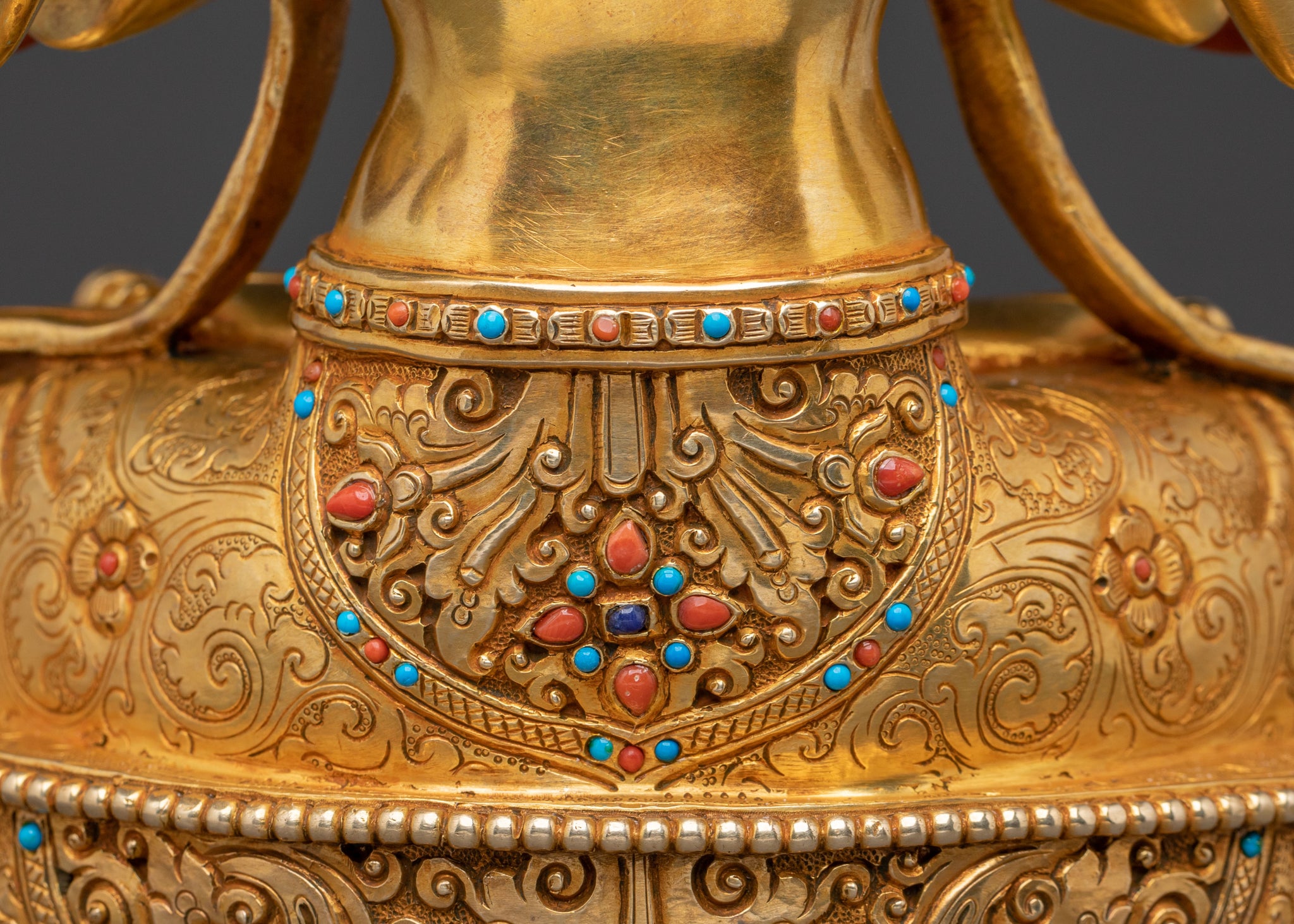 A radiant Chenrezig protector statue emerges from the skilled hands of Nepalese artisans, bringing forth the boundless compassion of Avalokiteshvara. This Buddhist art piece, meticulously handcrafted in Nepal, embodies the gentle strength and protective presence of the Bodhisattva. Adorned with 24K gold gilding and vibrant acrylics, it offers a serene focal point for any spiritual space. Each detail is brought to life through intricate repoussé and chasing techniques, enhanced by delicate 24K gold gilding and colorful acrylic paintings. The embedded gemstones add a touch of sacred brilliance, reflecting generations of Himalayan craftsmanship.