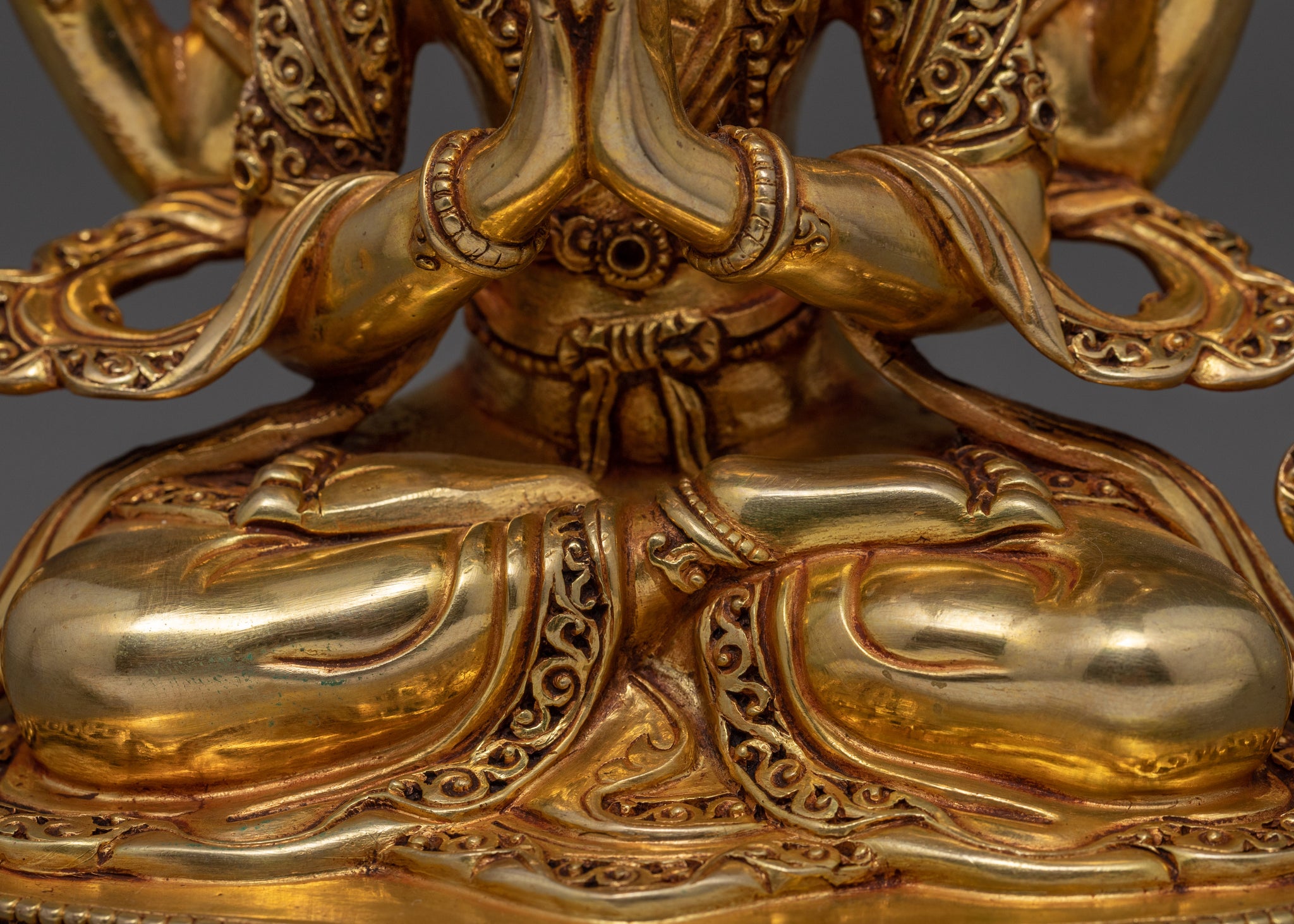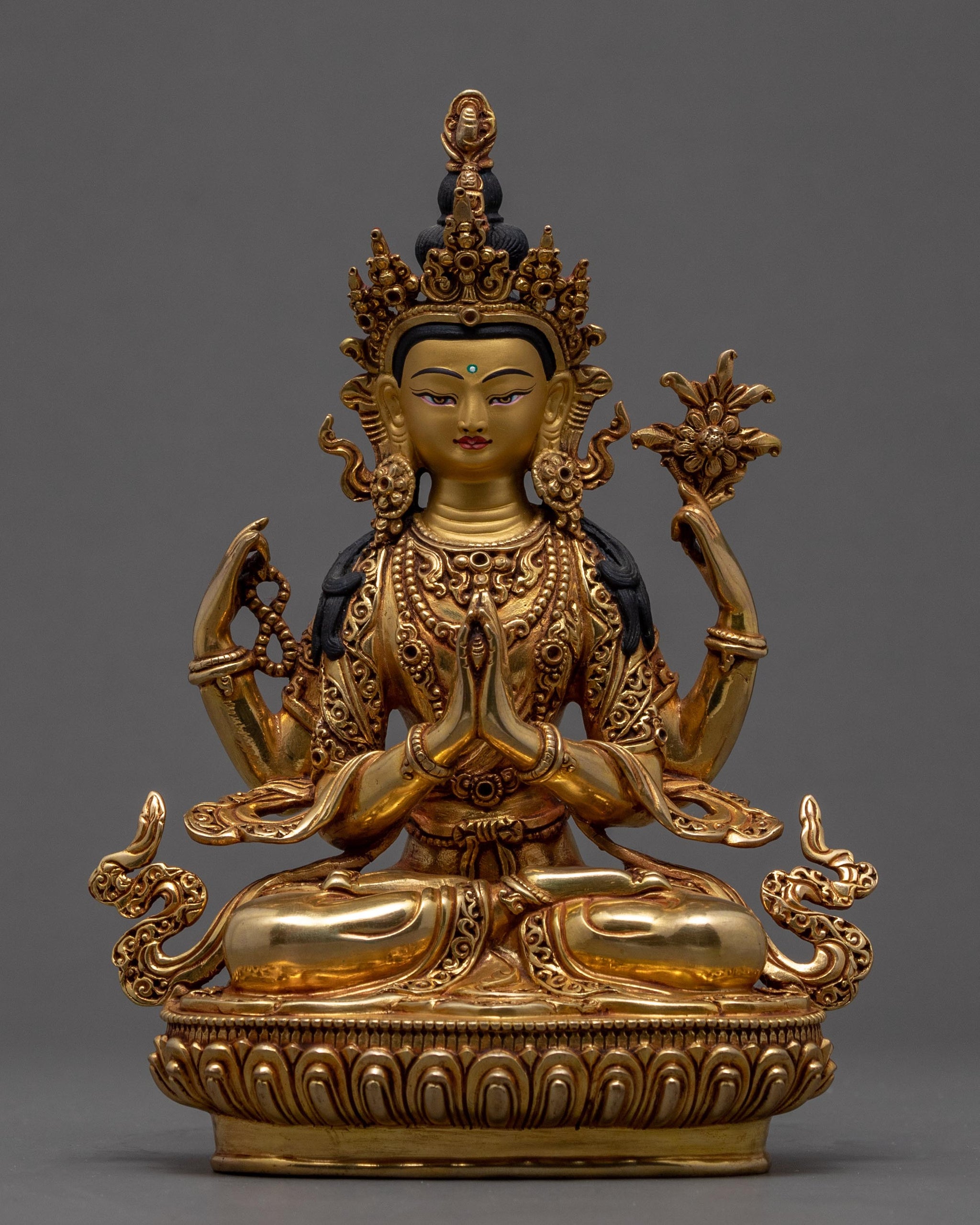 Chenrezig, also known as Avalokitesvara in Sanskrit, is depicted splendidly in this Buddhist hard-carved Artwork. A Nepali artist in Kathmandu handcrafted this Tibetan Sculpture in copper and gilded it in 24K gold, our artisans has worked very hard to make sure all the intricate details of the deity is accurately represented . Chenrezig sits on a lotus, holding the moon disc in his shoulder. His two hands are joined in prayer. He holds a lotus flower in his left hand and rosary beads in his right, He is wrapped in silk and embellished with beautiful ornaments.