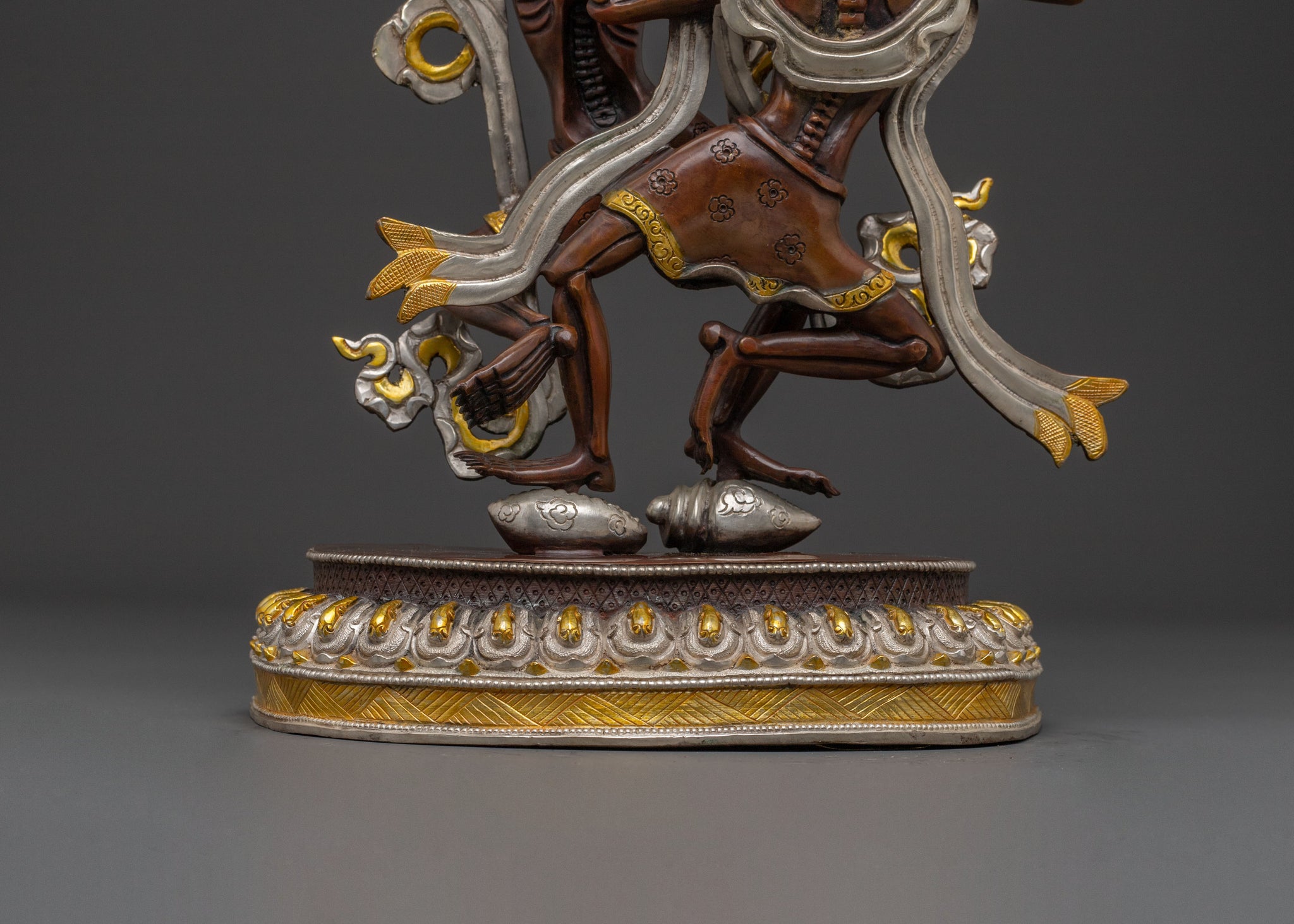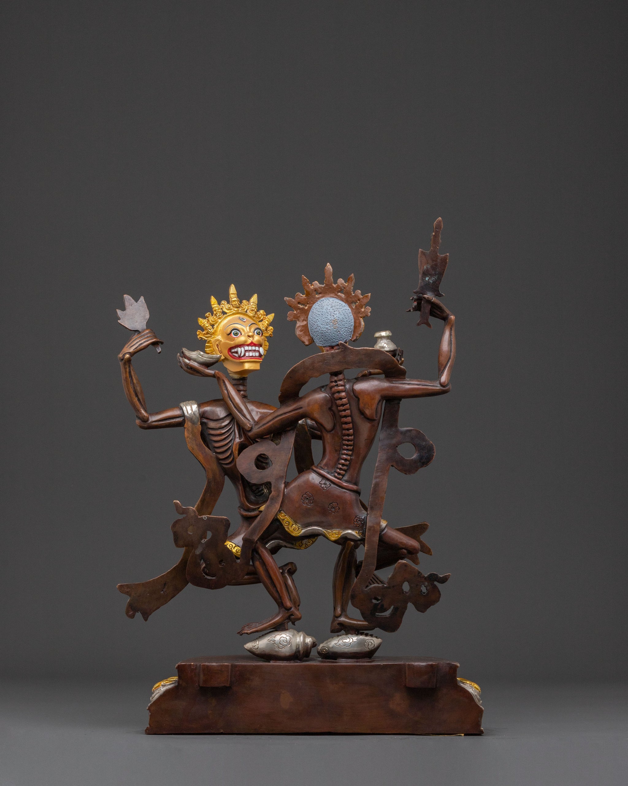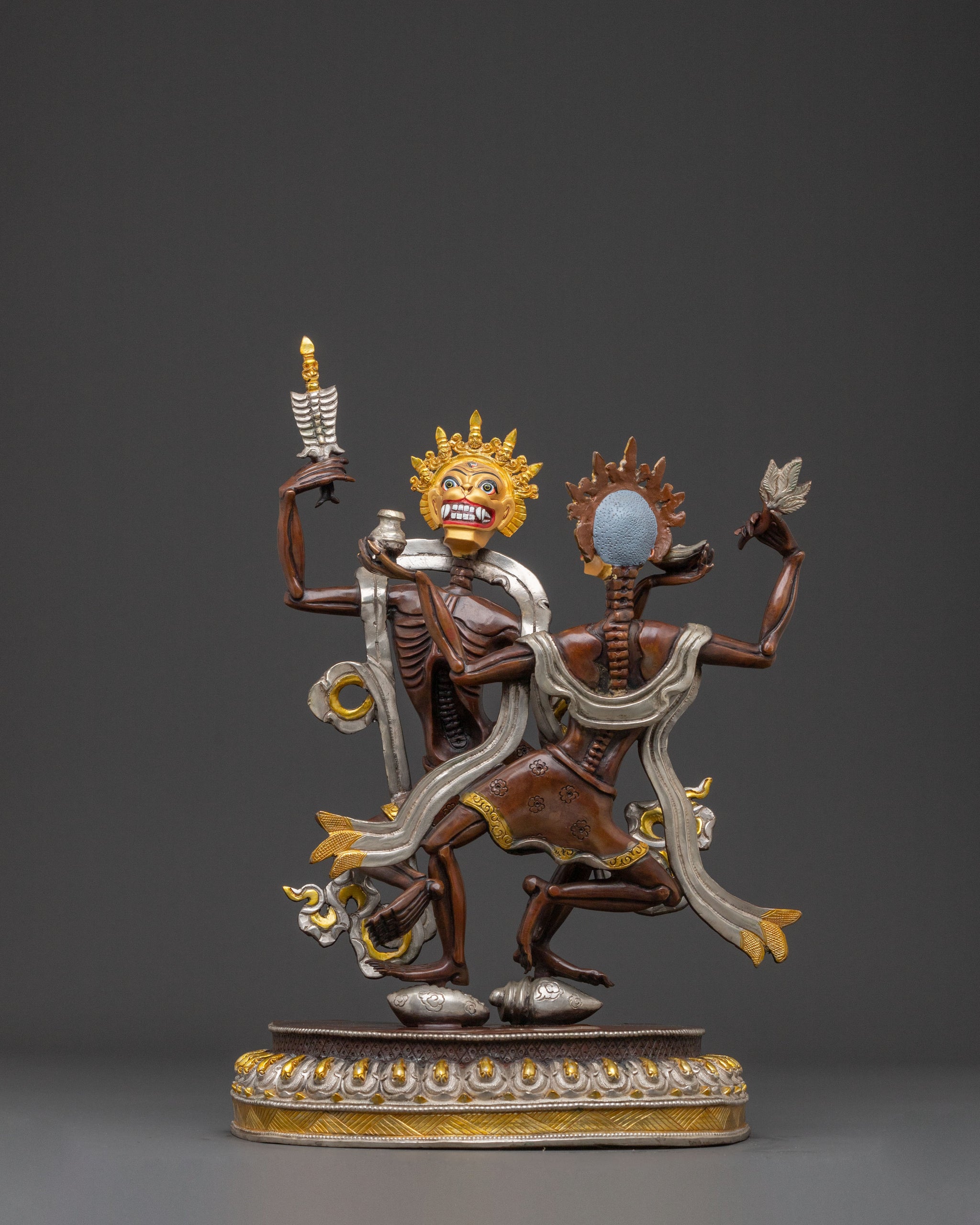 This Chitipati Buddhist sculpture stands 15.16 inches (38.5cm) tall, with a base measuring 12.6 inches (32cm), and weighs 5.62 kg. Crafted from an oxidised copper body and enhanced with gold electroplating, silver electroplating, and acrylic paintings, this piece reflects refined Himalayan metal artistry. Handcrafted in Nepal by skilled Newar artisans, it is well-suited for personal altars, meditation spaces, or distinctive spiritual décor collections.