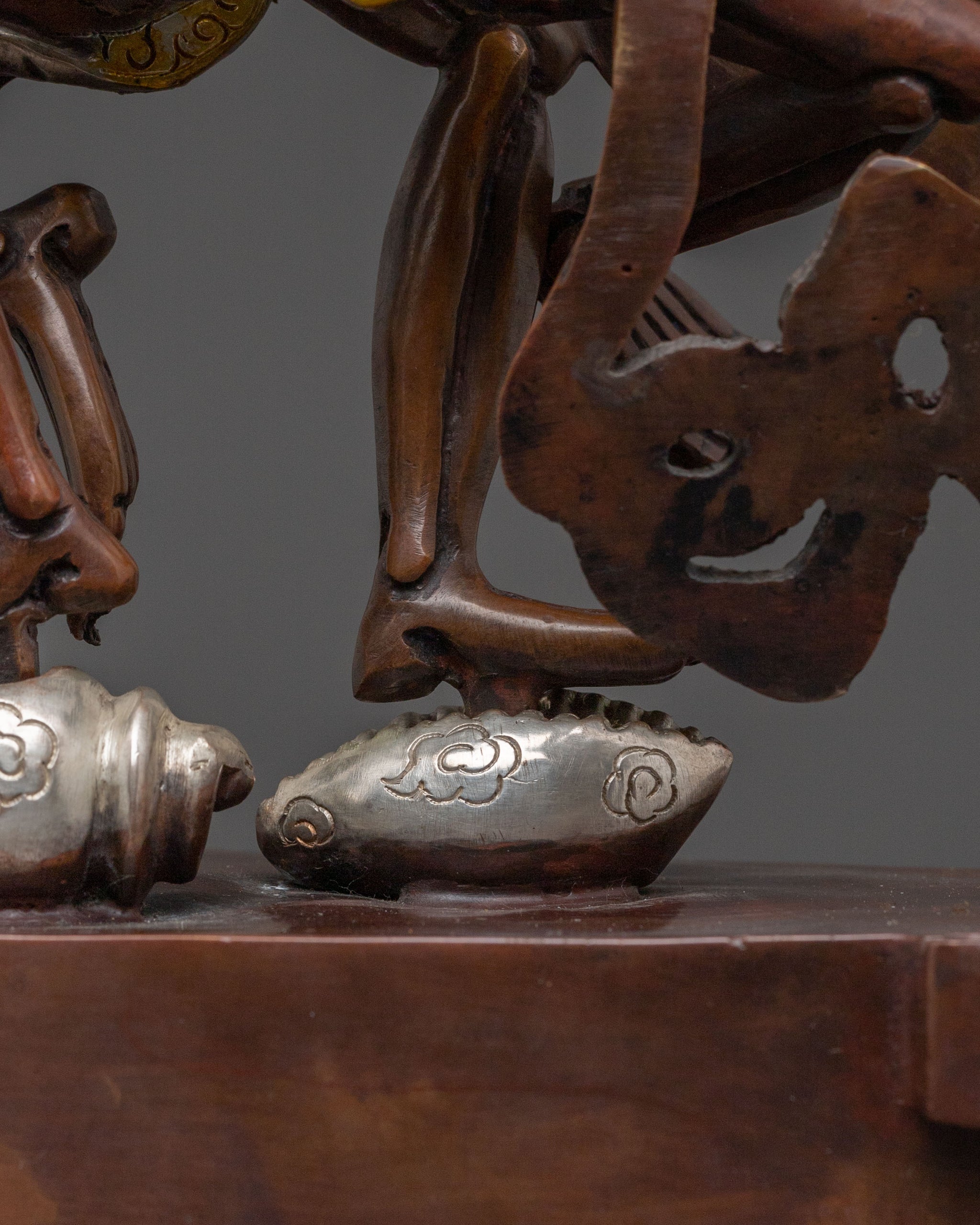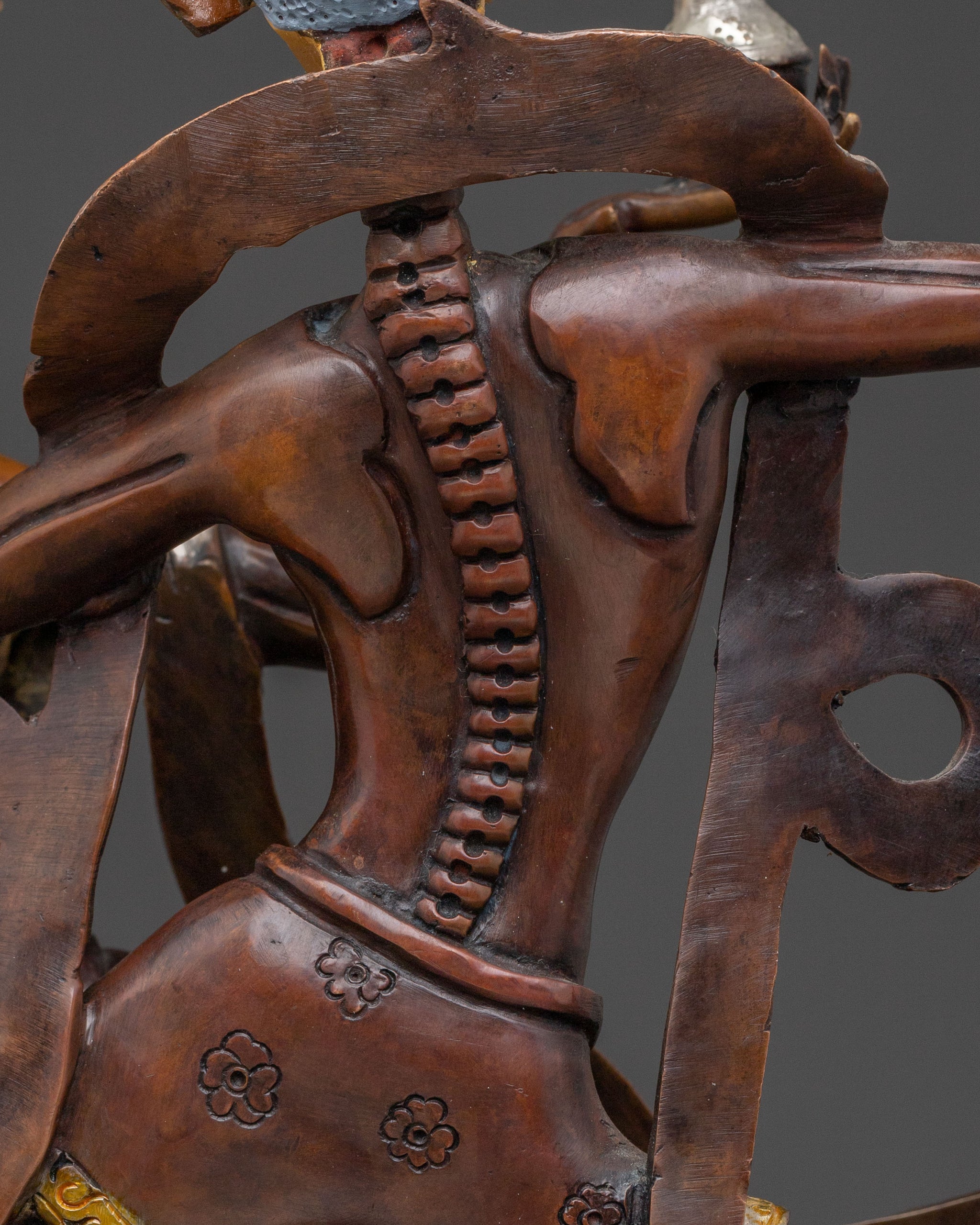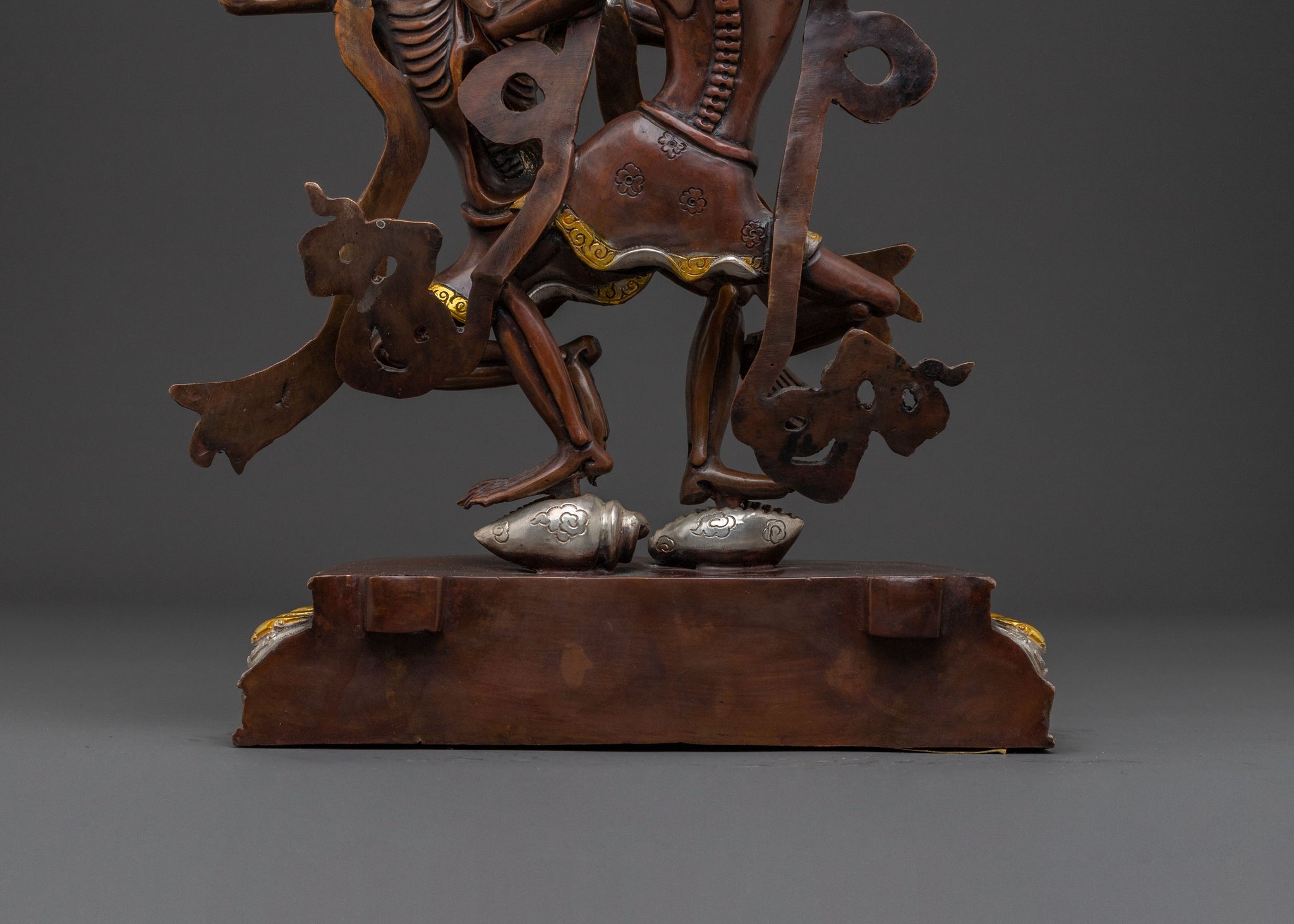 This Chitipati Buddhist sculpture stands 15.16 inches (38.5cm) tall, with a base measuring 12.6 inches (32cm), and weighs 5.62 kg. Crafted from an oxidised copper body and enhanced with gold electroplating, silver electroplating, and acrylic paintings, this piece reflects refined Himalayan metal artistry. Handcrafted in Nepal by skilled Newar artisans, it is well-suited for personal altars, meditation spaces, or distinctive spiritual décor collections.