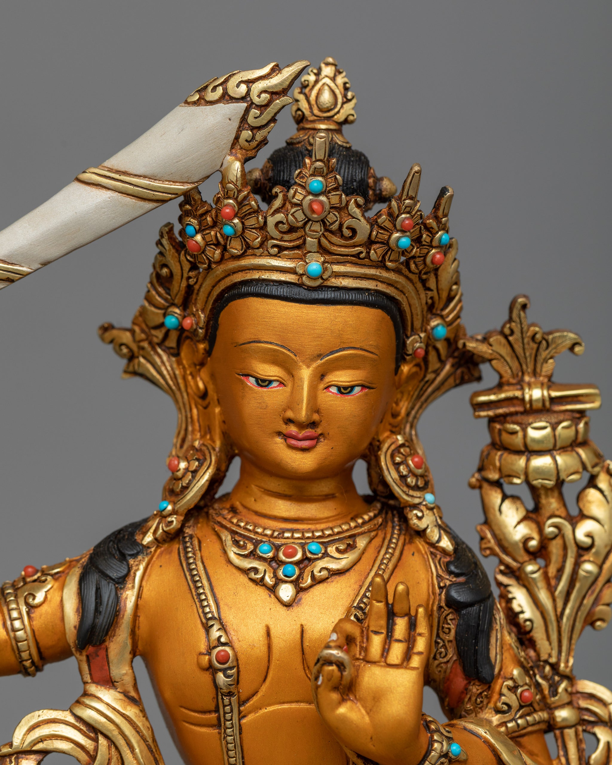 With the help of this colorful statue of Manjushri, the Bodhisattva of ultimate wisdom, you can enter the colorful world of wisdom. This magnificent sculpture, which combines the unmatched skill of Nepali artisans with divine inspiration, has a bright 24K gold-gilded copper body that is covered with vibrant acrylic paints that vividly depict the details of Manjushri's compassionate visage and symbolic qualities.