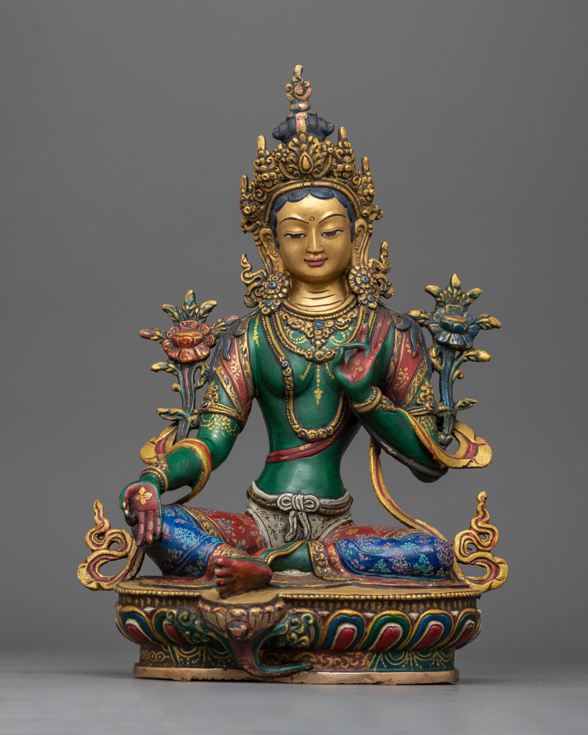 Seated in her well-known relaxed pose with one leg outstretched, Green Tara represents her willingness to respond quickly to assist her followers. Her vibrant colors enhance her visual appeal and signify her connection to the natural world and the lively, nurturing energy she embodies. Each aspect of this statue—from the serene yet watchful expression to the delicate floral motifs that adorn her throne—invokes Tara's presence, making her a source of comfort and inspiration in any space.