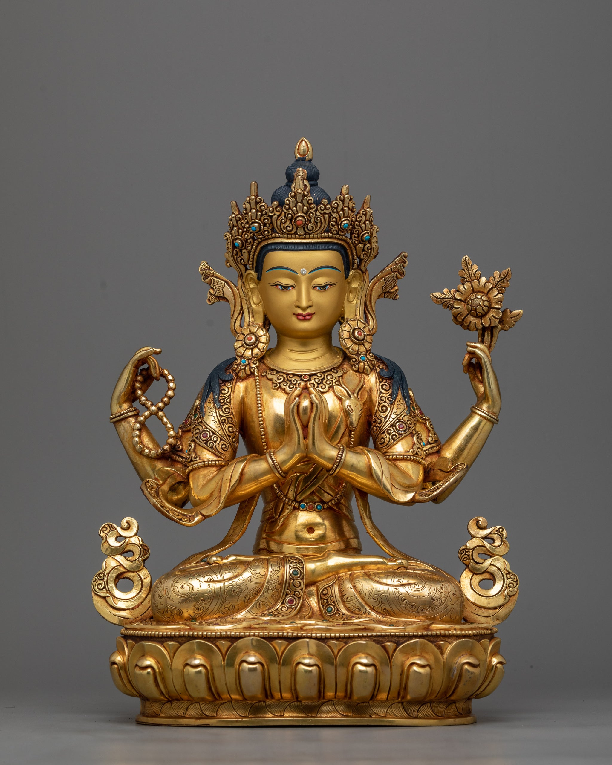Presenting our lovely Compassion Buddha Cherezig statue, skillfully created by Patan, Nepali artists. Made of copper, the figurine has a height of 13.4 inches and a base diameter of 9.8 inches. It has been enhanced with acrylic paintings, 24K gold gilding, and gold. The great attention to detail in the depiction of the Compassion Buddha, who is highly esteemed in Mahayana Buddhism for embodying infinite compassion, reflects his calm and kind disposition.