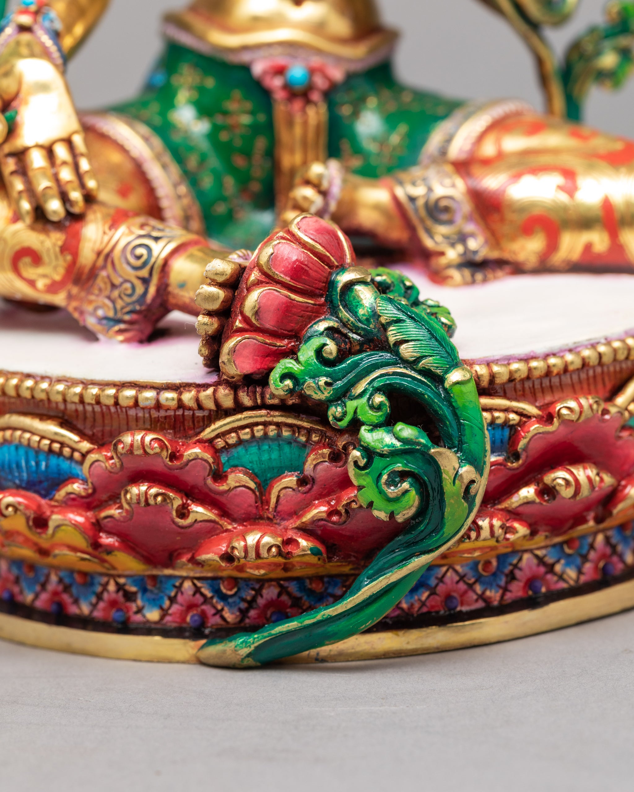 The compassion deity, Green Tara art is a hand-carved statue. The statue is embedded with precious corals and turquoise, gilded with 24K gold, and some parts painted with acrylic colors. She holds a lotus in both hands and wears a gemstone studded crown.