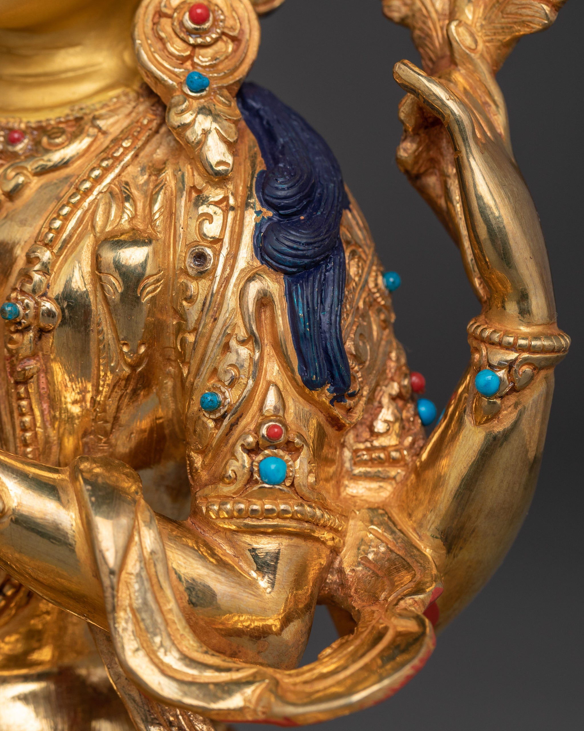 Vajrayogini is stunning. The details are amazing. It's easy to make out her facial expressions, skulls, feet, and the ring of fire around her. You can tell she's handmade. There is a consecration hole in her back.