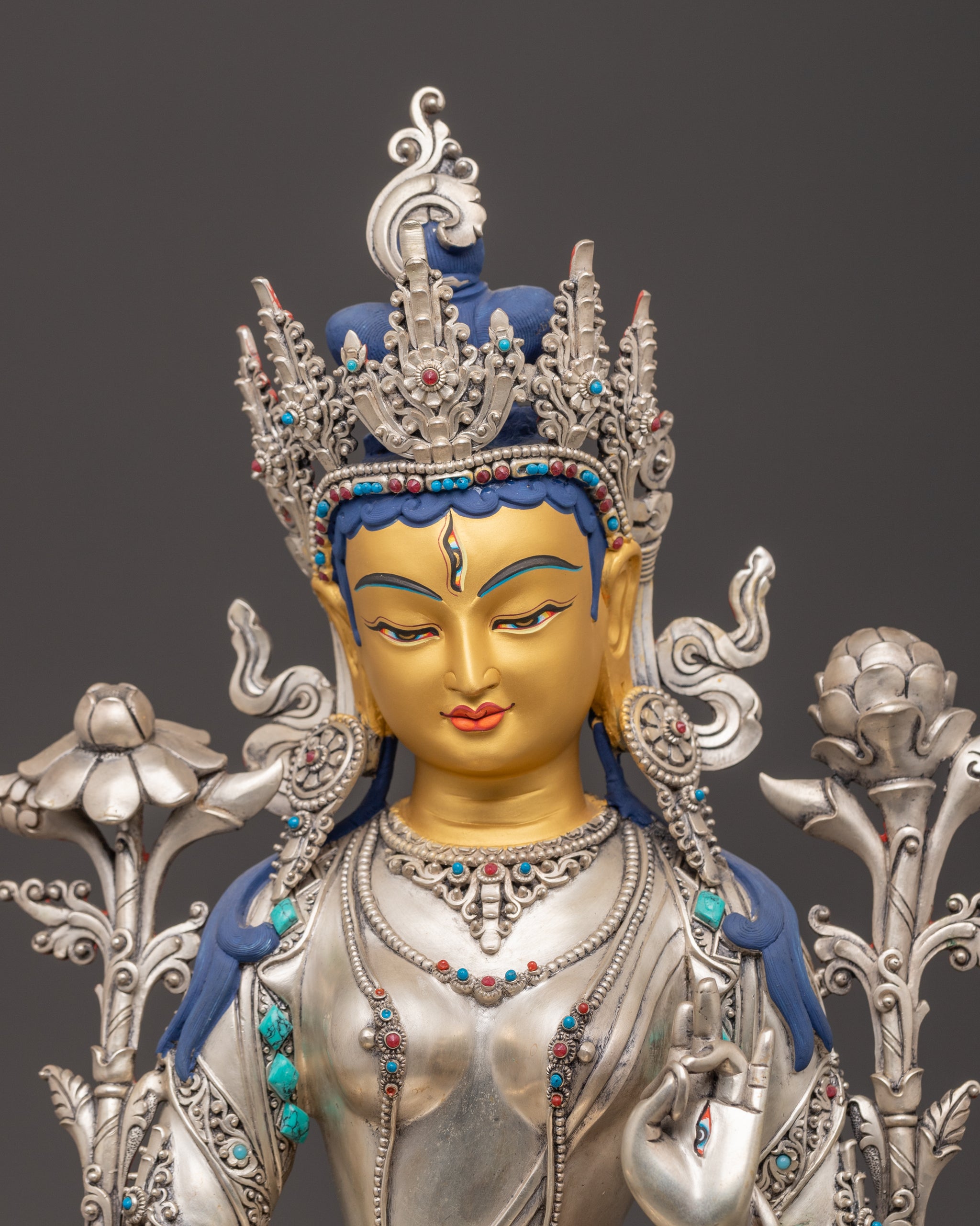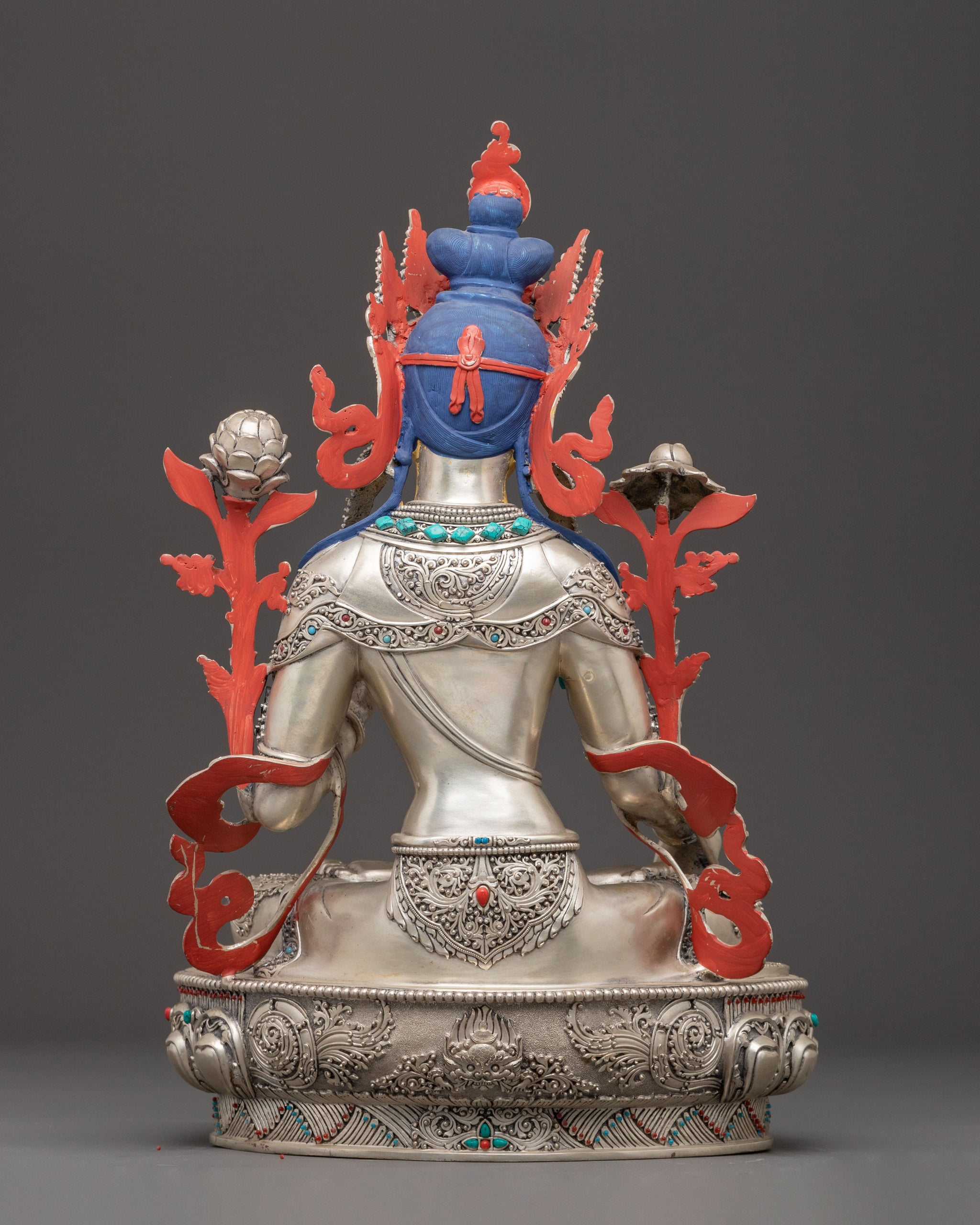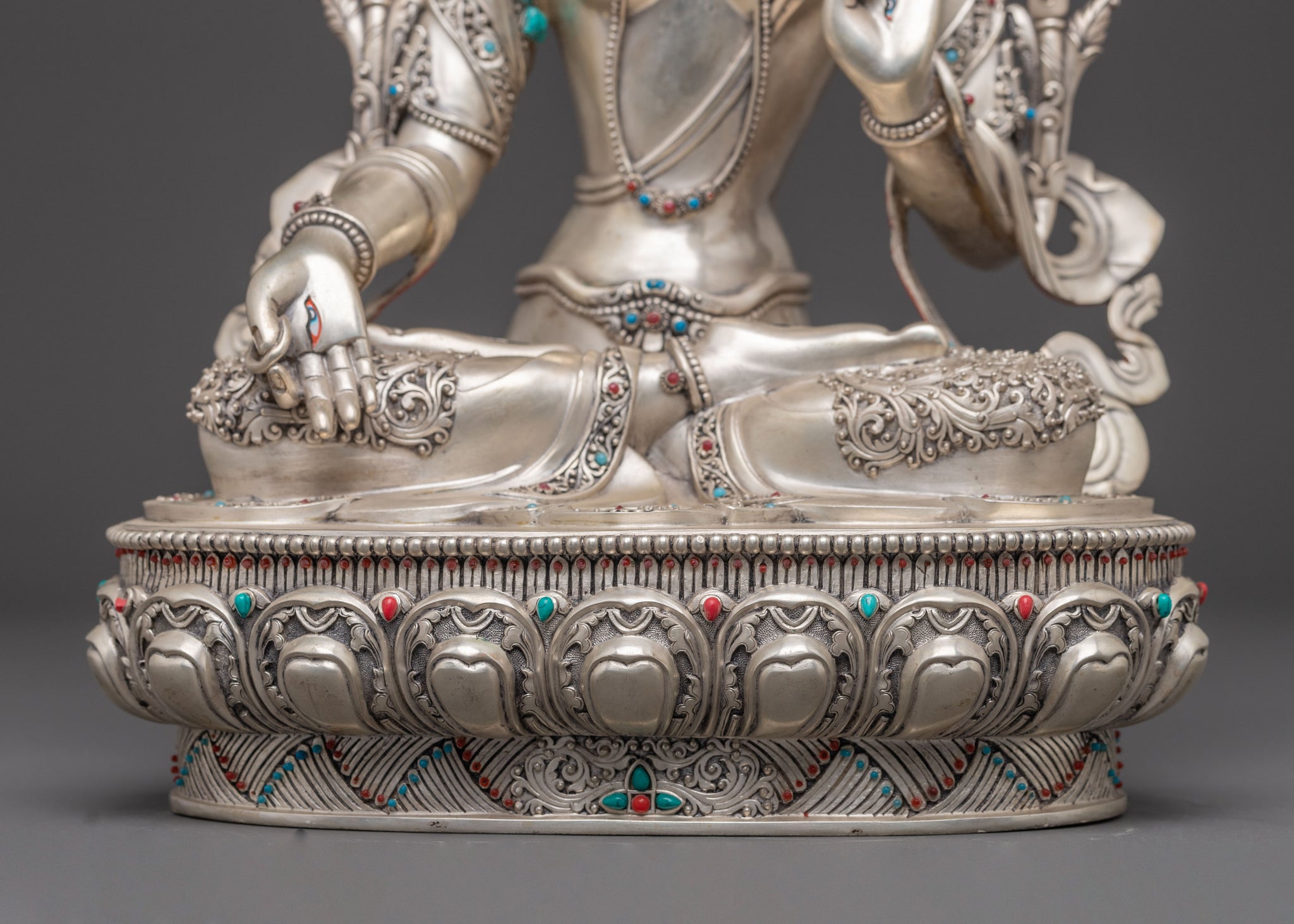 The Compassionate Healing Goddess White Tara Statue measures 14.8”/37.5cm in height and 9.6”/24.5cm at the base, weighing 3.78 kg. It is crafted from pure silver and adorned with gemstones, featuring gold and acrylic accents. This exquisite statue, crafted by skilled Nepalese artisans, represents the compassionate and healing qualities of White Tara. It makes a meaningful addition to altars, meditation spaces, or spiritual collections.