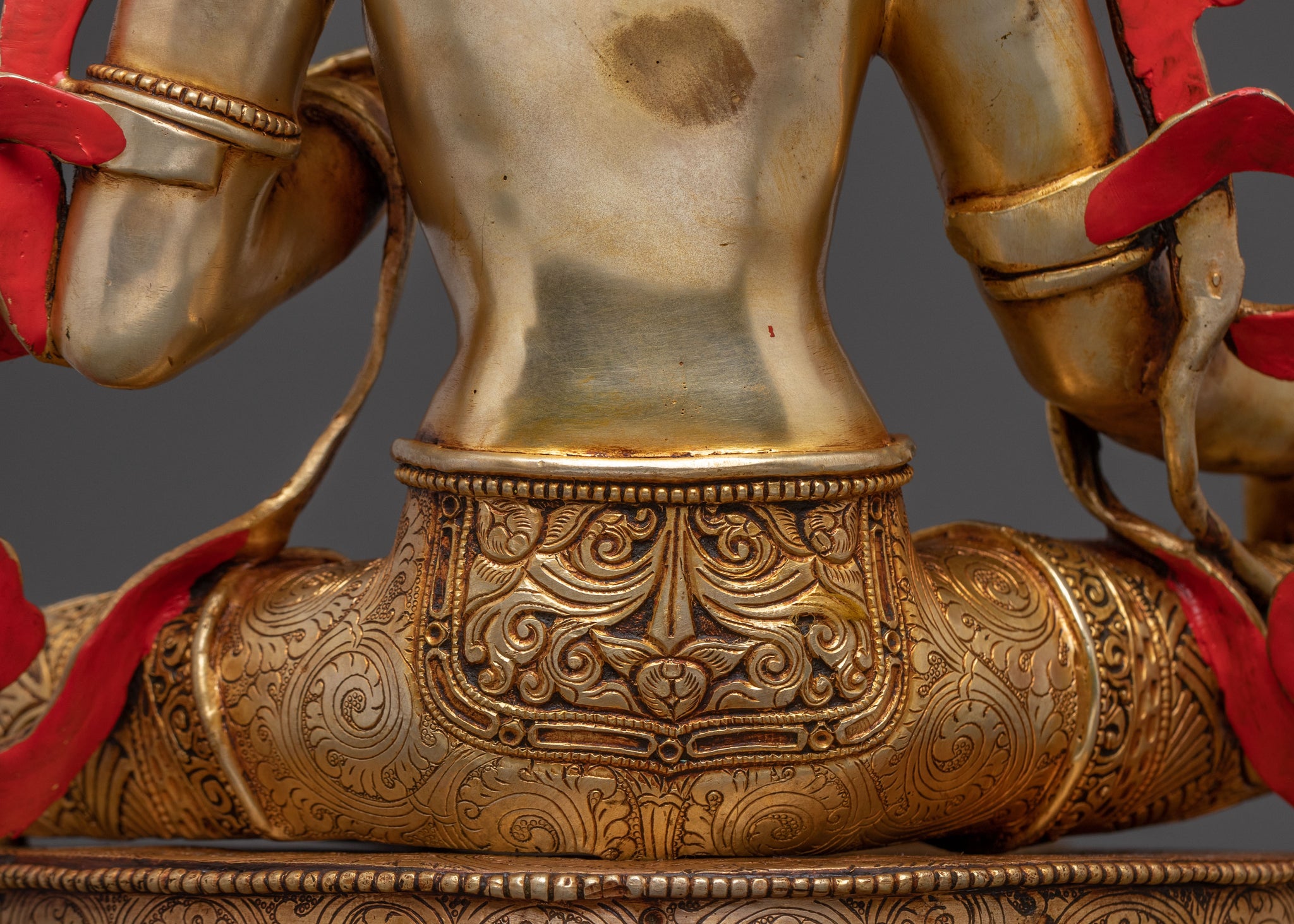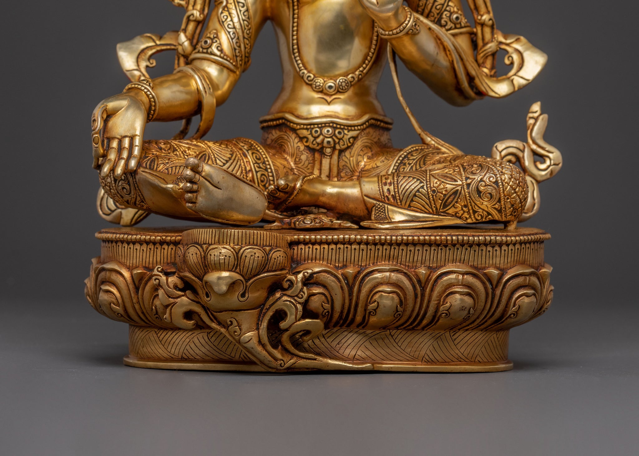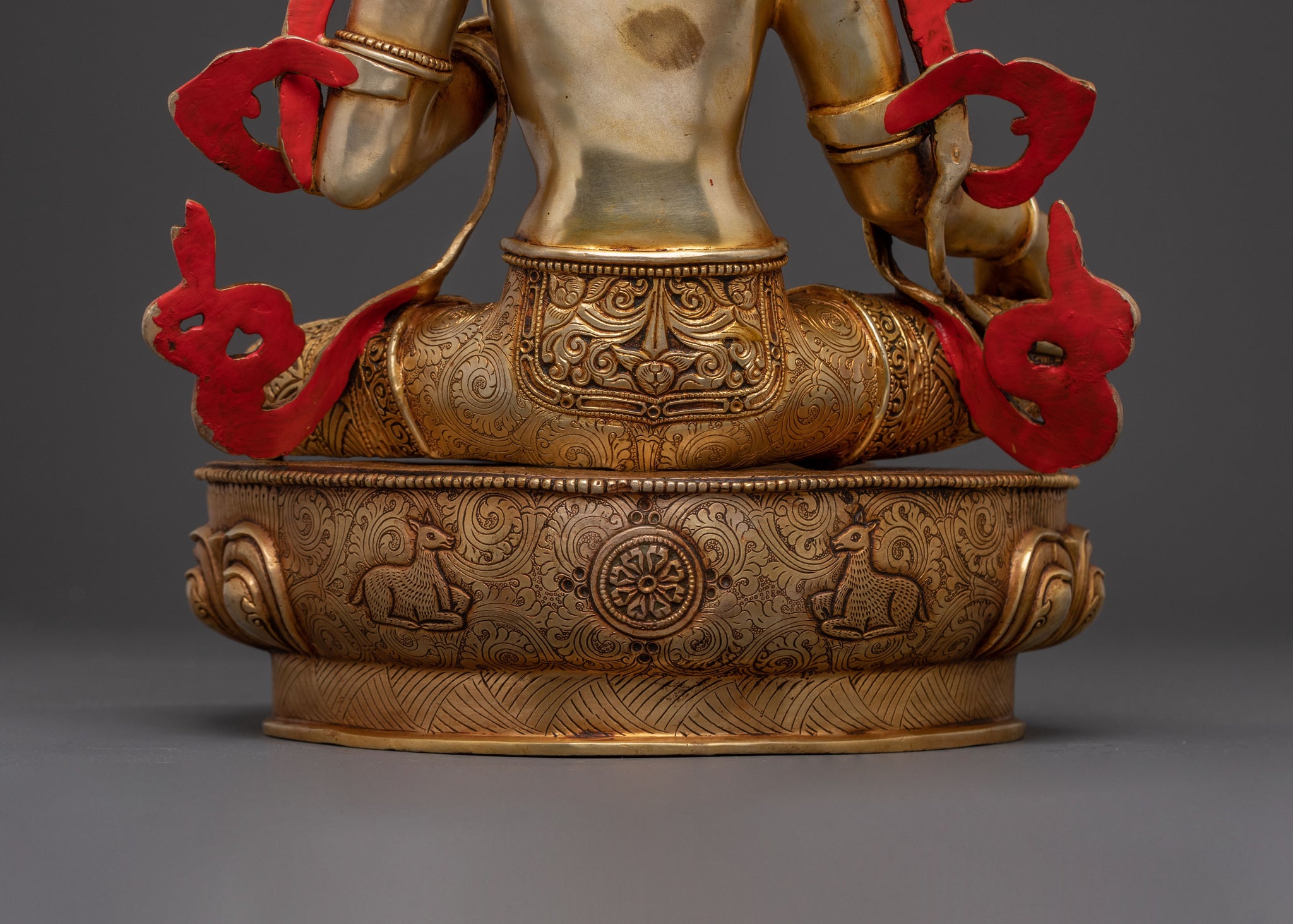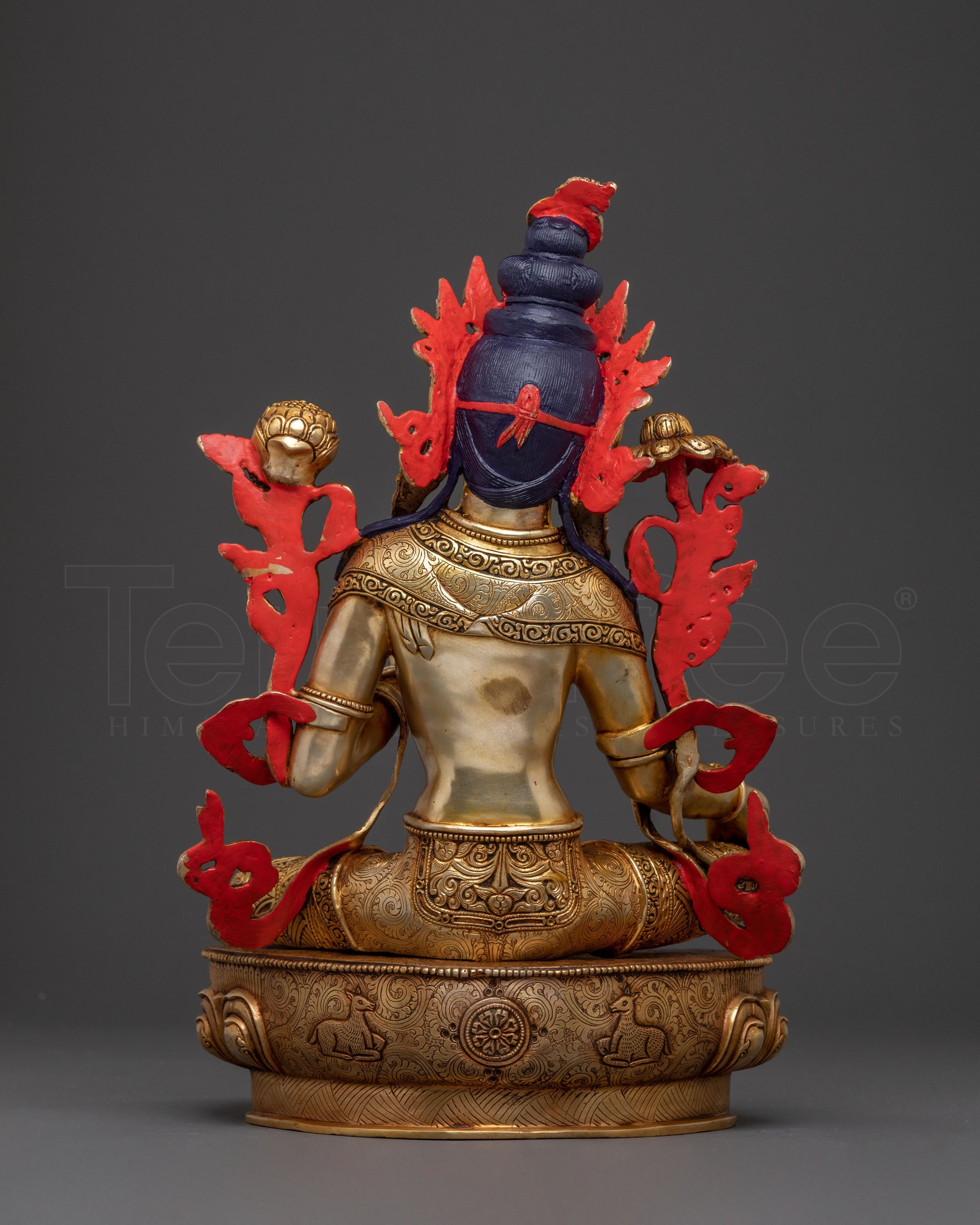Green Tara, known for her swift action and healing power, is often depicted with two hands in a gesture of protection and granting wishes. Her posture, typically seated with one foot resting on a lotus, signifies her readiness to step into the world to help those in need. The lotus represents purity, while the vase symbolizes the gift of health and prosperity.