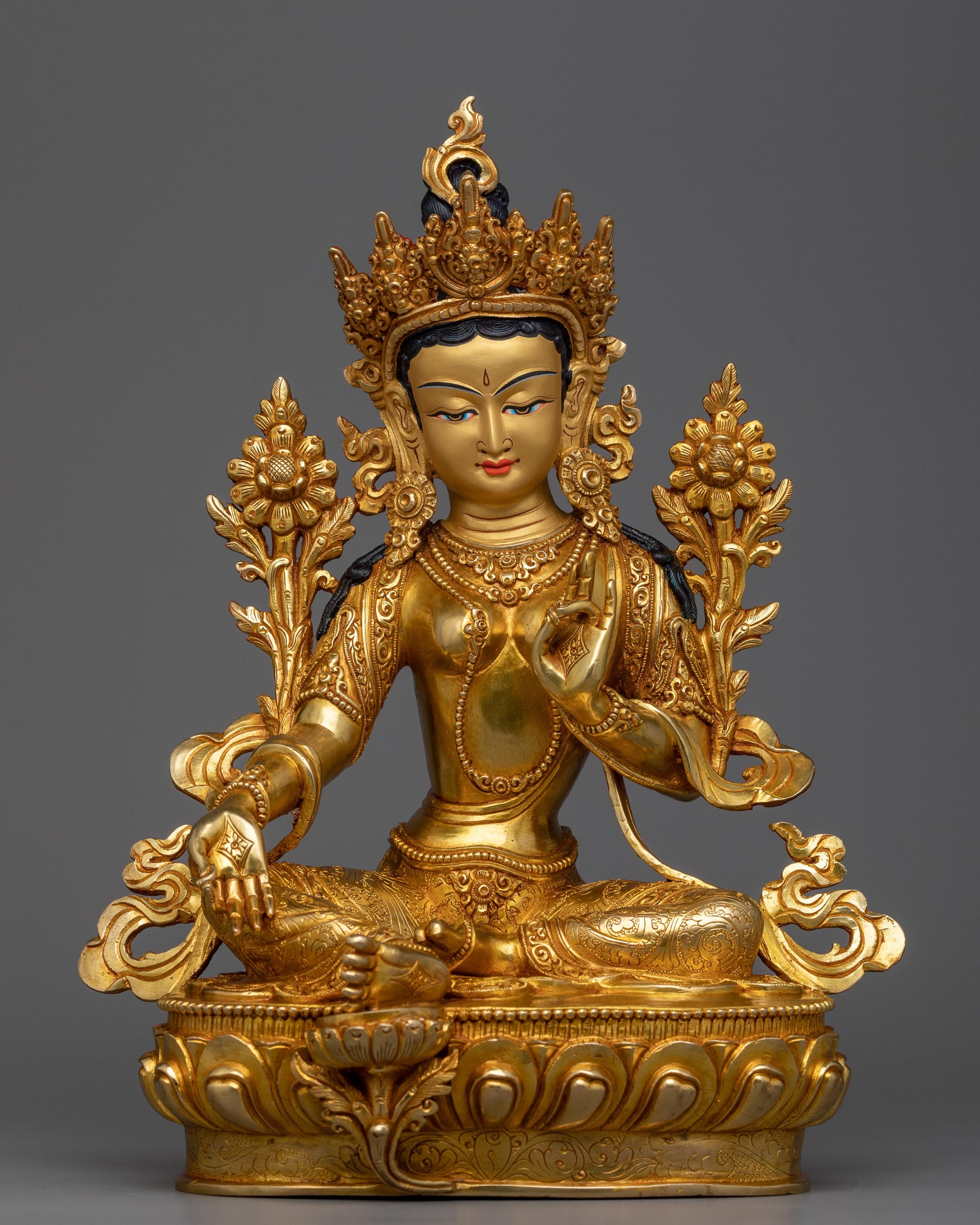 With the help of our Green Tara statue, an emblem of prompt assistance and charity in Buddhist traditions, you may bring compassion and safety into your area. This handcrafted Copper Art Sculpture, which is 12.2" tall with a 9.4" base, is a brilliant example of the extraordinary craftsmanship of Nepalese craftspeople. Its sturdy copper construction, 24K gold plating, and beautiful acrylic paints give it a reassuring sense of protection. From Green Tara's compassionate smile to the finely created folds of her clothing, every minute element perfectly captures the painstaking craftsmanship that is Nepali in origin. This statue is a wonderful addition to any meditation area, shrine, or any place that might use a little calm Buddhist influence because it acts as a potent symbol of protection and compassion.