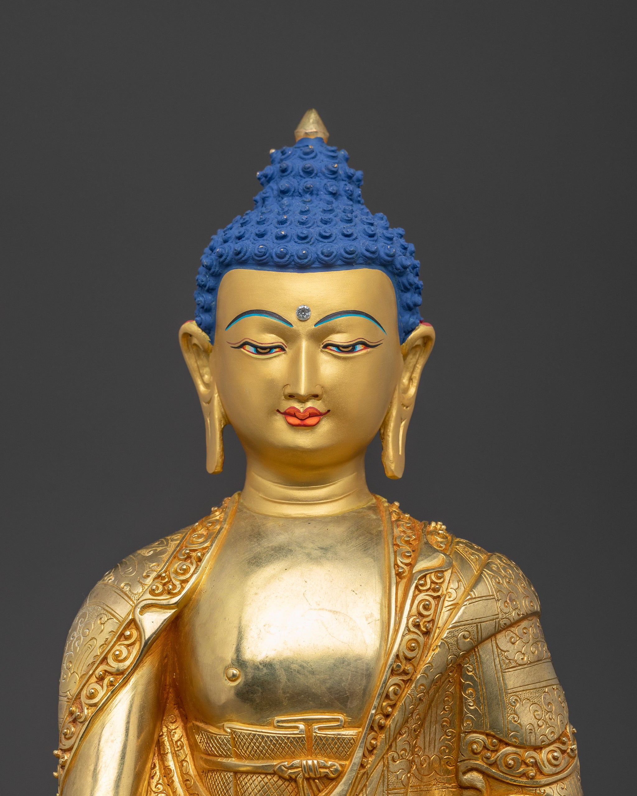 Experience the timeless tranquility of the Traditional Copper Handmade Statue of Buddha Shakyamuni, also known as Gautama Buddha. This finely crafted statue measures 15.4”/39cm in height and 10”/25.5cm at the base and weighs 4.34 kg. Made from a copper body with 24K gold gilding and gold and acrylic paintings, it embodies traditional craftsmanship and spiritual elegance.
