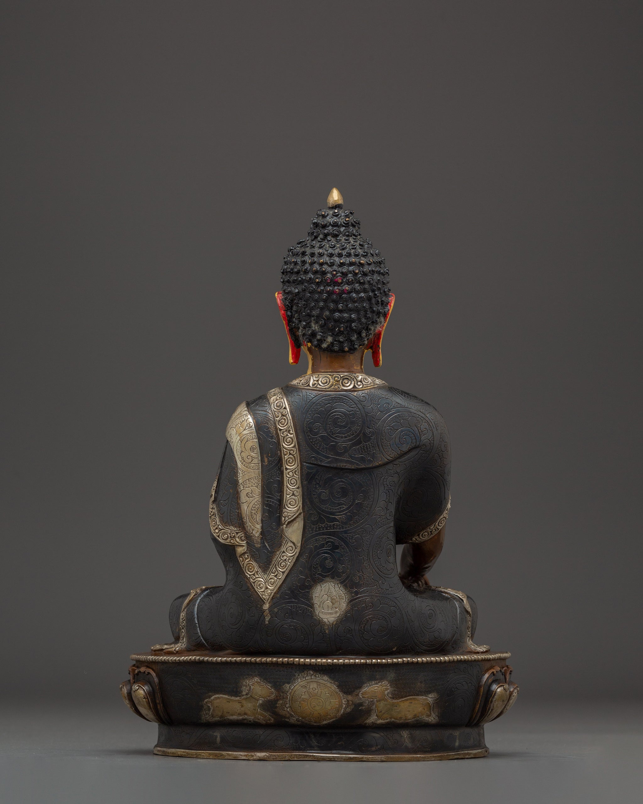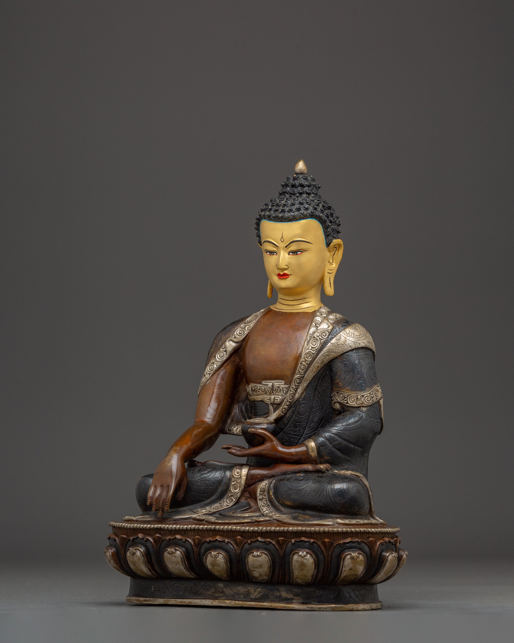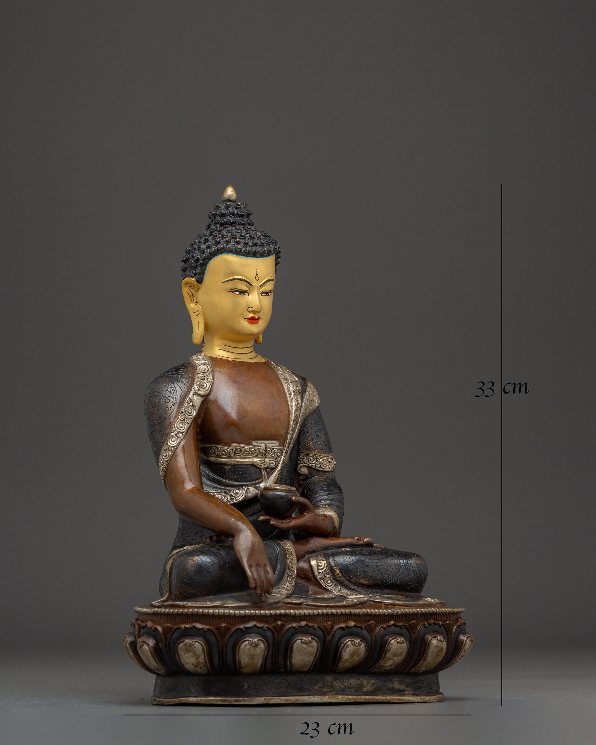 This Handmade Shakyamuni Buddha Statue, honoring the Historical Buddha, stands 13”/33cm tall with a base width of 9.1”/23cm and weighs 4.32 kg. Crafted from oxidized copper with silver plating and richly detailed with gold and acrylic paintings, this statue exemplifies expert Nepali craftsmanship. Perfect for altars and meditation spaces, it symbolizes the enlightened wisdom and compassionate teachings of Shakyamuni Buddha, inspiring practitioners on their spiritual journey.