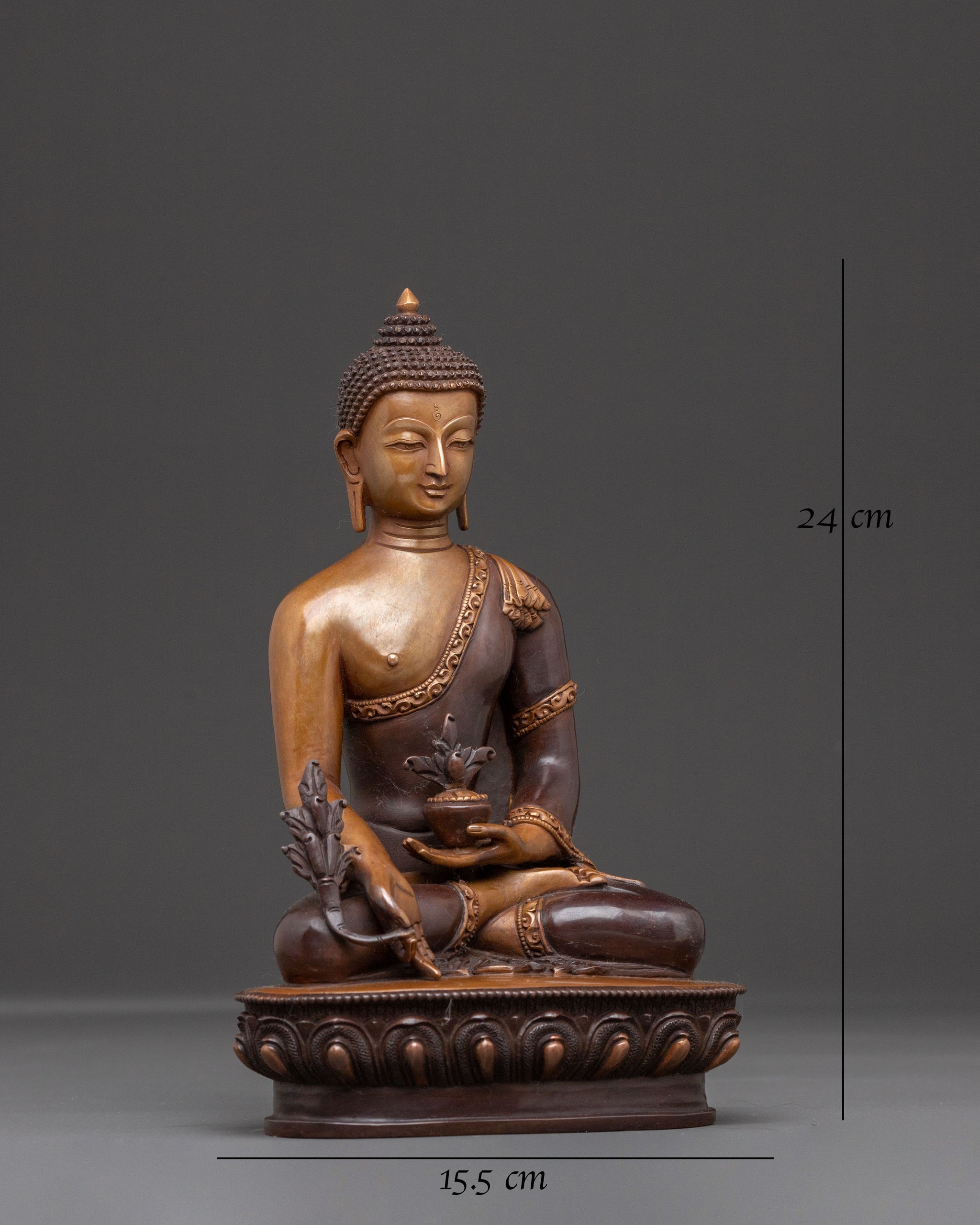 This serene Medicine Buddha statue, crafted from oxidized copper, stands 9.45 inches (24 cm) tall and features a 6.1-inch (15.5 cm) base. Weighing 1.59 kg, it radiates a peaceful, healing energy, creating a tranquil atmosphere in any sacred space. The statue embodies quiet strength, grounding its benevolent aura with every glance.