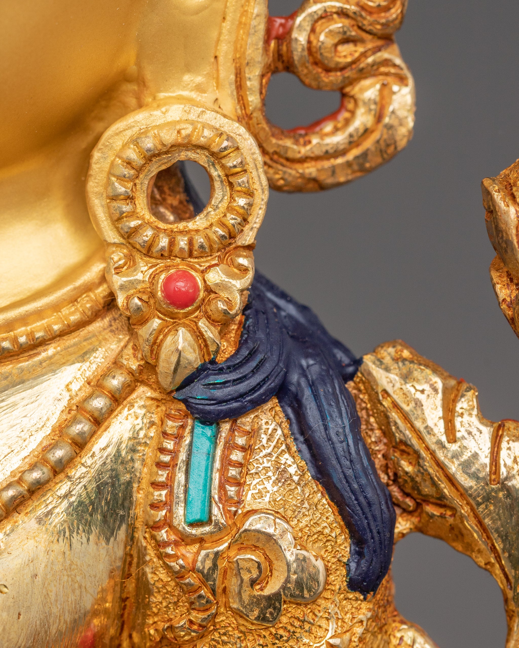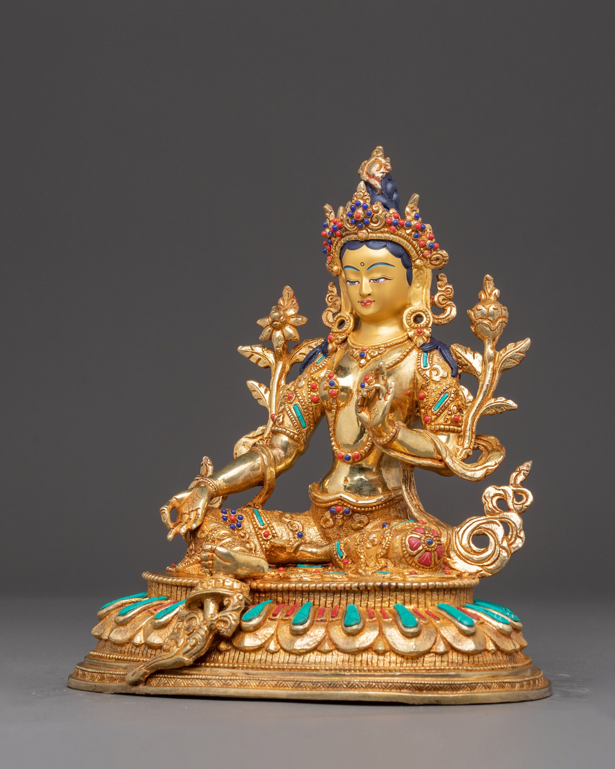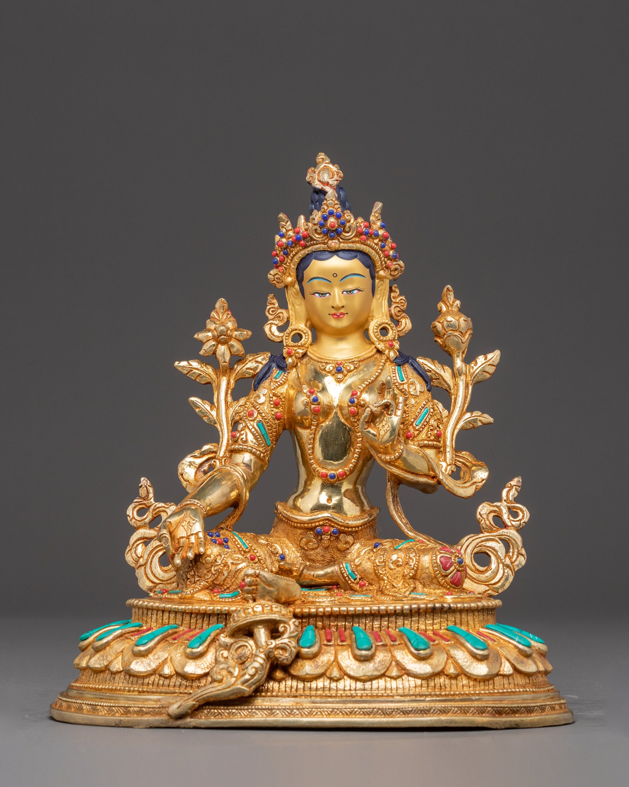 Green Tara is shown seated on a lotus throne, representing purity and spiritual awakening. Her posture is known as lalitasana or the posture of royal ease, with her right leg extended and her left leg folded. This signifies her readiness to spring into action to aid sentient beings while embodying meditative serenity. Her right hand is extended downward, holding the lotus stem, which signifies wisdom and compassion, the ability to remain pure and wise while actively engaging with the world to help others. Her left hand is held at her heart in the three jewels mudra, symbolizing the Three Jewels of Buddhism: the Buddha, the Dharma (teachings), and the Sangha (community of practitioners).