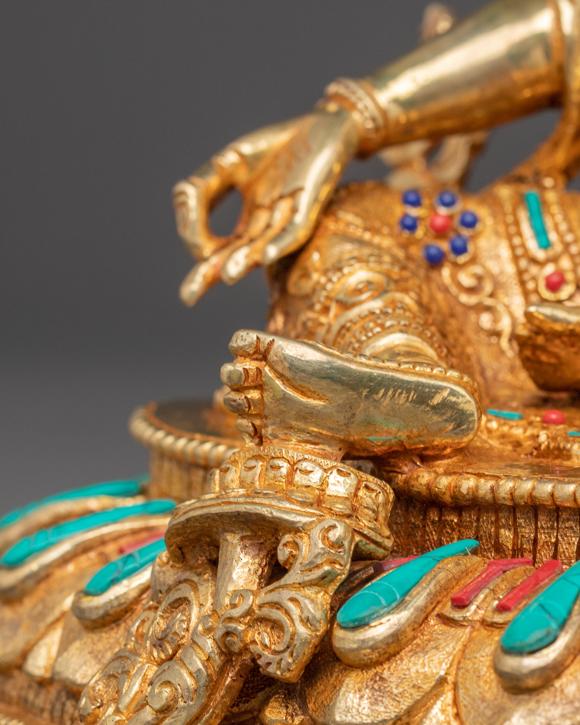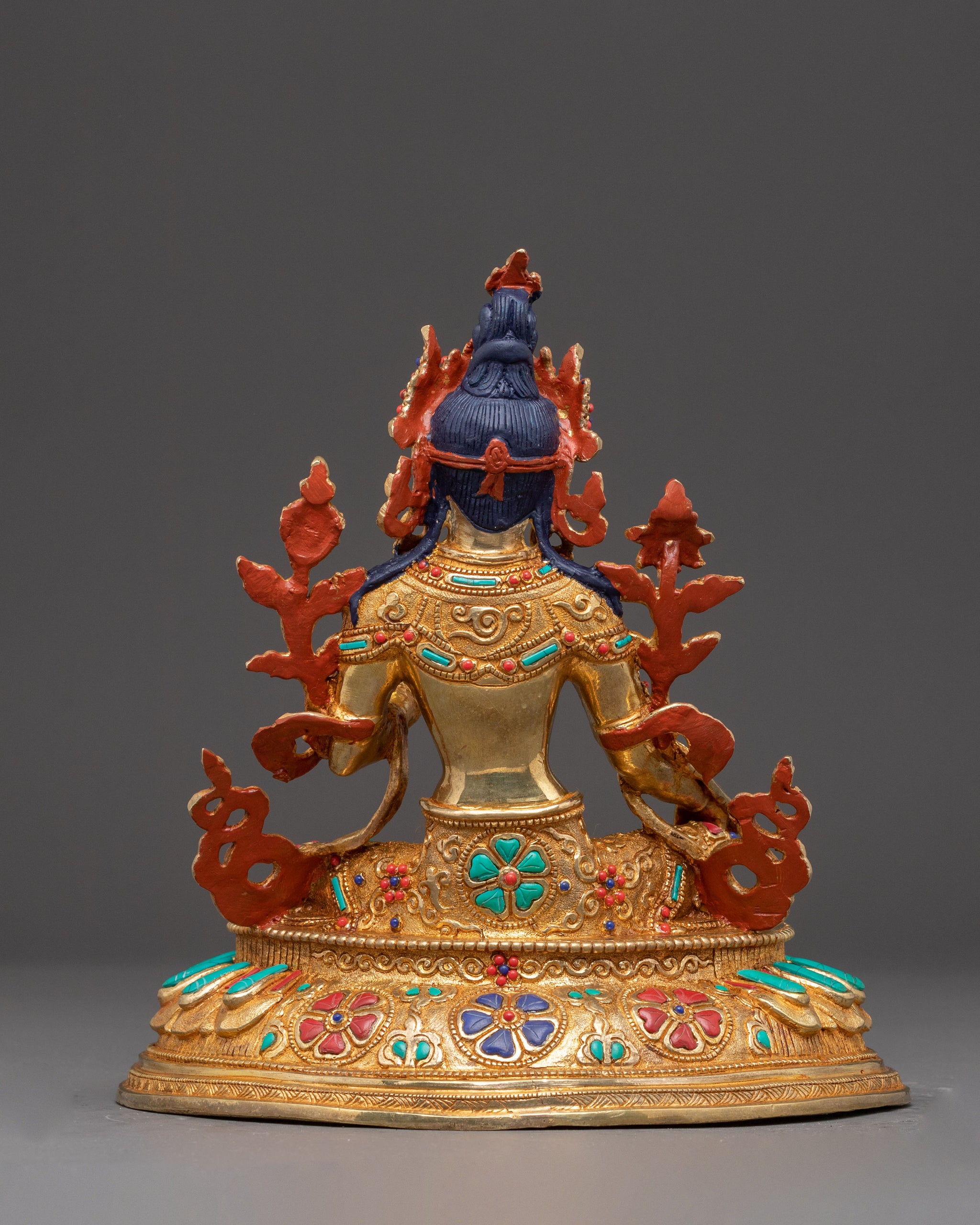 The Handcrafted Copper Statue of Mother Green Tara stands at a height of 9.3”/23.5cm with a base width of 8.9”/22.5cm and weighs 1.93 kg. Expertly crafted from a copper body, 24K gold gilding, and gemstones. This piece radiates divine elegance and spiritual presence, making it a perfect addition to altars, meditation spaces, or as a meaningful decorative centerpiece.