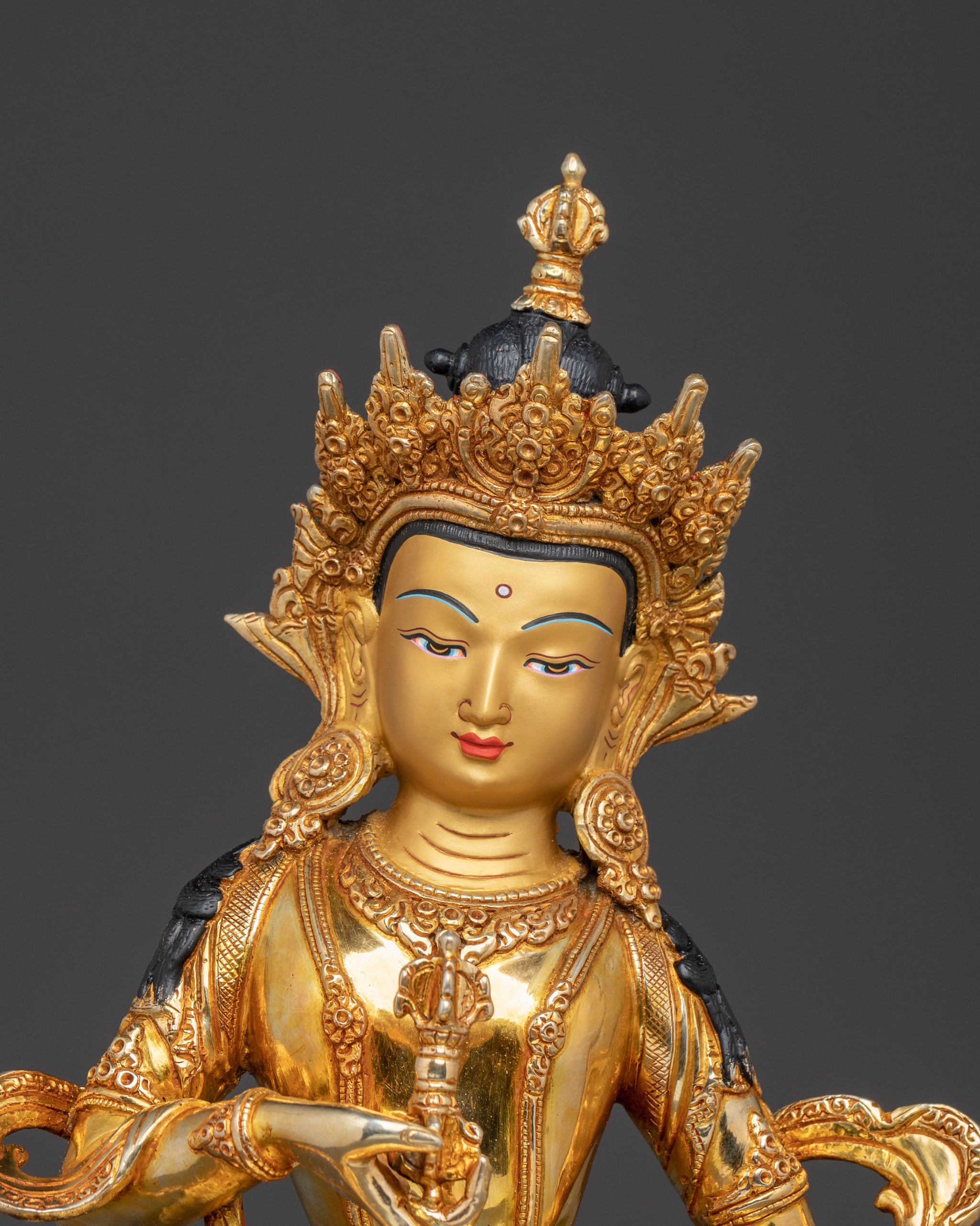 A magnificent copper statue of Vajrasattva Bodhisattva radiates profound purity and spiritual cleansing. This exquisite 24K gold-gilded piece, handcrafted in Nepal, stands at 13.39 inches (34cm) tall, embodying the essence of Vajrayana practice with serene grace. Its substantial weight of 3.8 kg ensures a commanding, stable presence in any sacred space. Covered with a triple layer of 24K gold gilding and carved with deeply engraved details that produce a magnificent 3D-like effect, this statue is a true masterpiece of craftsmanship.