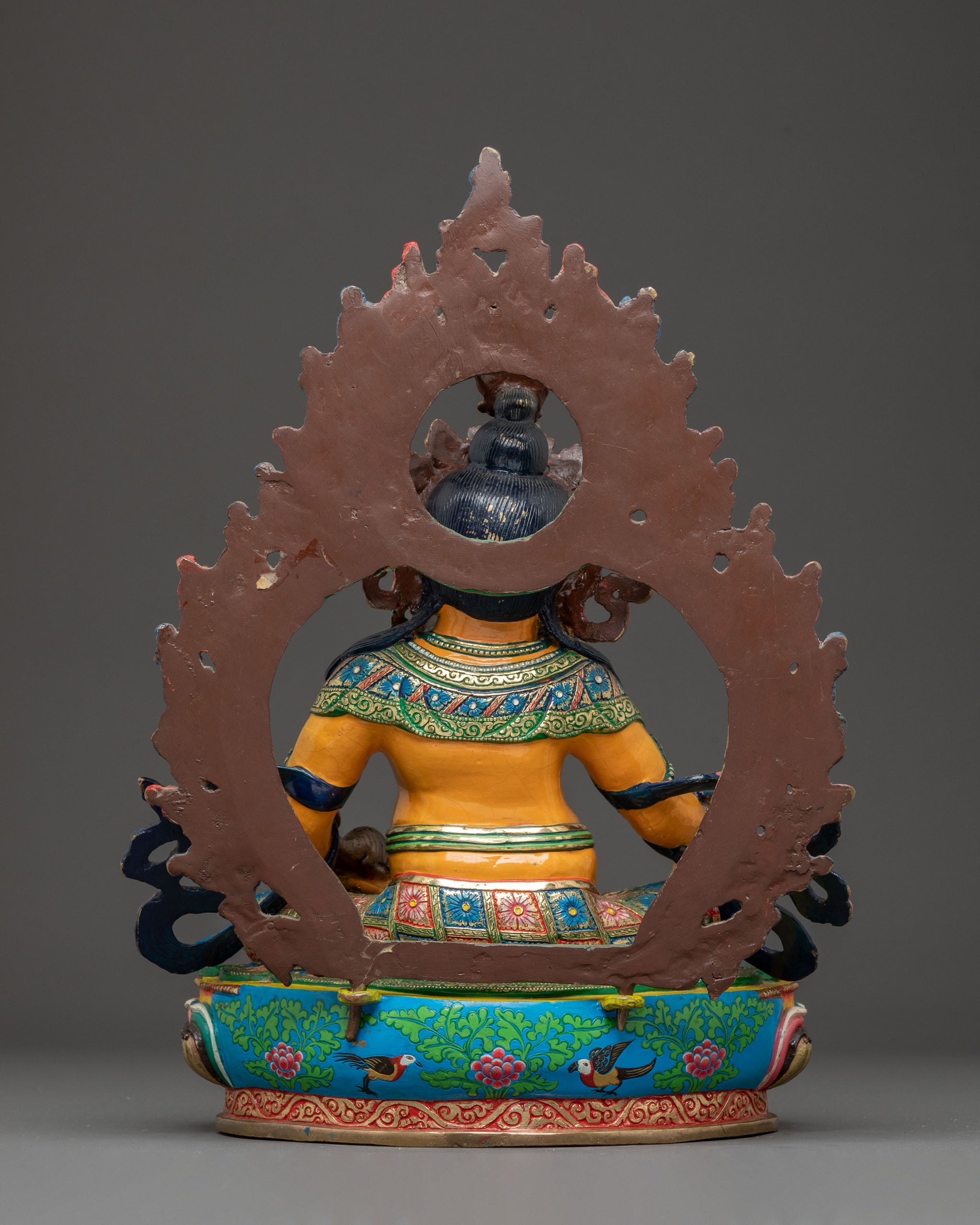 Dzambhala is depicted seated on a lotus base, symbolizing purity and spiritual elevation. He holds a mongoose in his left hand, which spits jewels, representing limitless wealth and generosity. His right hand holds a citron fruit, symbolizing fulfillment, prosperity, and spiritual well-being. A radiant halo surrounds him, emphasizing his divine presence. This statue beautifully captures Dzambhala’s role as the deity who grants material and spiritual riches while encouraging generosity among devotees.