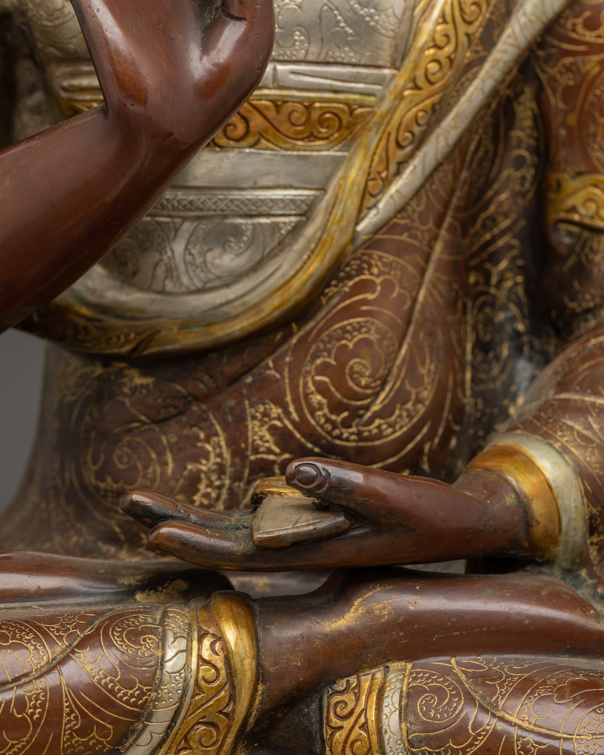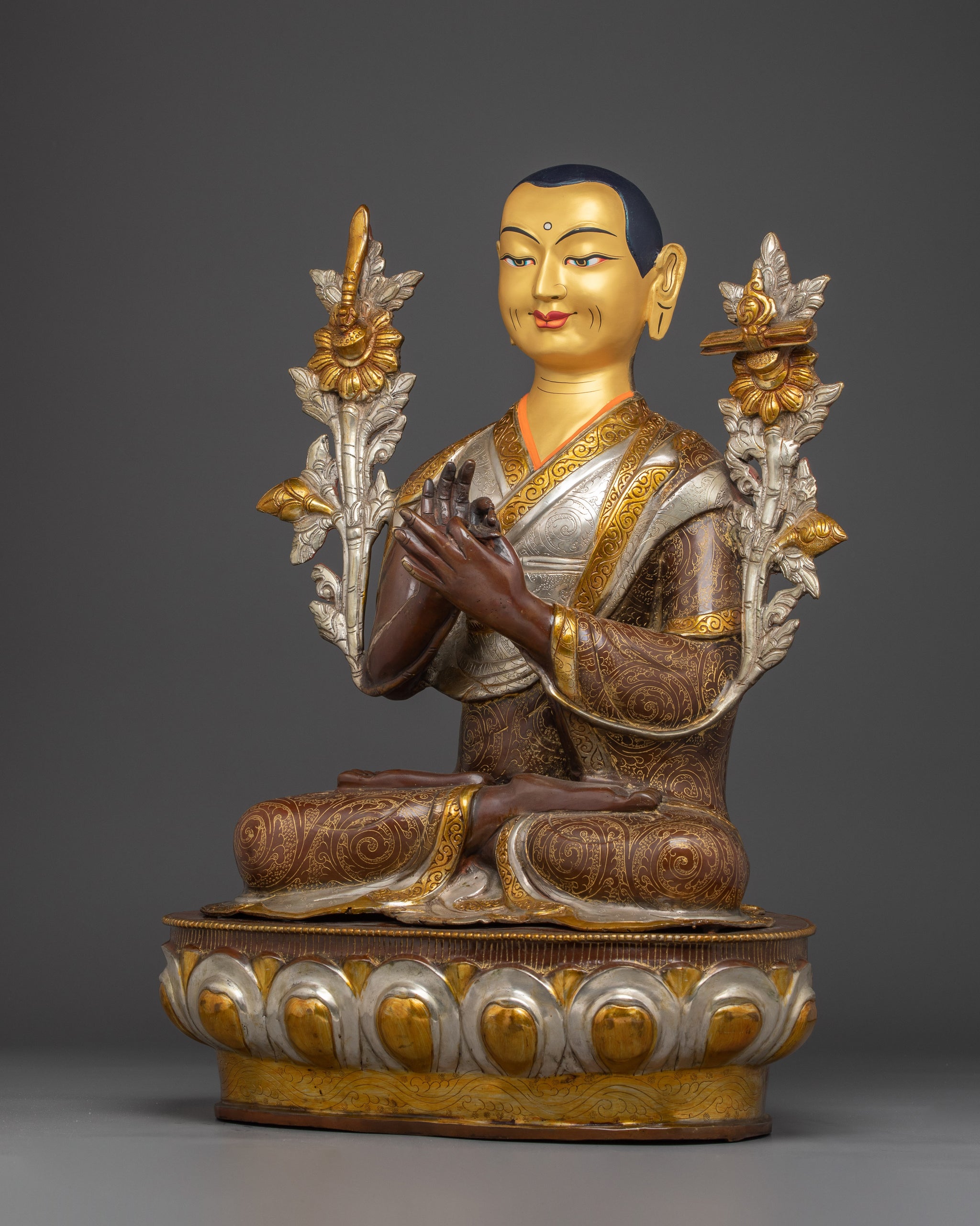 Tsongkhapa, the esteemed philosopher and founder of the Gelug school, is depicted in serene meditation, his hands raised at chest height forming the Dharmachakra Mudra—the emblem of teaching. From his palms grow two lotus stems: the left topped with a flaming sword, symbolizing the sharp edge of wisdom slicing through ignorance; the right clutching the Prajnaparamita Sutra, representing the perfected wisdom central to his teachings. Beside him stand his devoted disciples, Je Gyaltsab and Je Khedrup, each displaying the Vitarka Mudra, the gesture of thoughtful discussion, underscoring their role as protectors and transmitters of the Dharma. Bearing sacred scriptures, they continue the enlightened heritage of Tsongkhapa. This exquisite set narrates a captivating tale of insight, tradition, and the enduring quest for understanding.