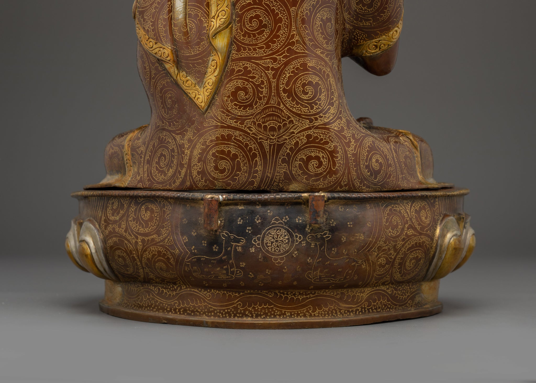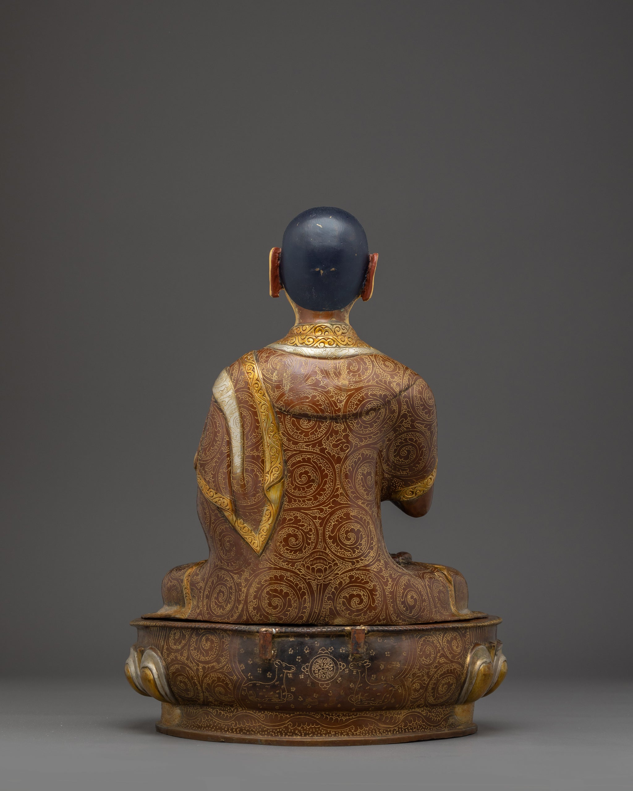 This Handmade Copper Tsongkhapa Statue Set features three expertly crafted figures, each embodying revered Tibetan Buddhist masters. The largest statue, Tsongkhapa, stands 21.3 inches (54 cm) tall with a base measuring 15.4 inches (39 cm). Accompanying him are Je Gyalsab and Je Khedrup, both measuring 16.9 inches (43 cm) in height, with bases of 12.2 inches (31 cm) and 12.4 inches (31.5 cm) respectively. Together, the set weighs a substantial 31.95 kilograms. Each statue is meticulously made from oxidized copper, enhanced with silver plating, and adorned with 24K gold gilding alongside detailed gold and acrylic paintings. This harmonious set embodies the refined craftsmanship and profound spiritual significance that skilled artisans have upheld, making it a distinguished addition to any altar or collection.
