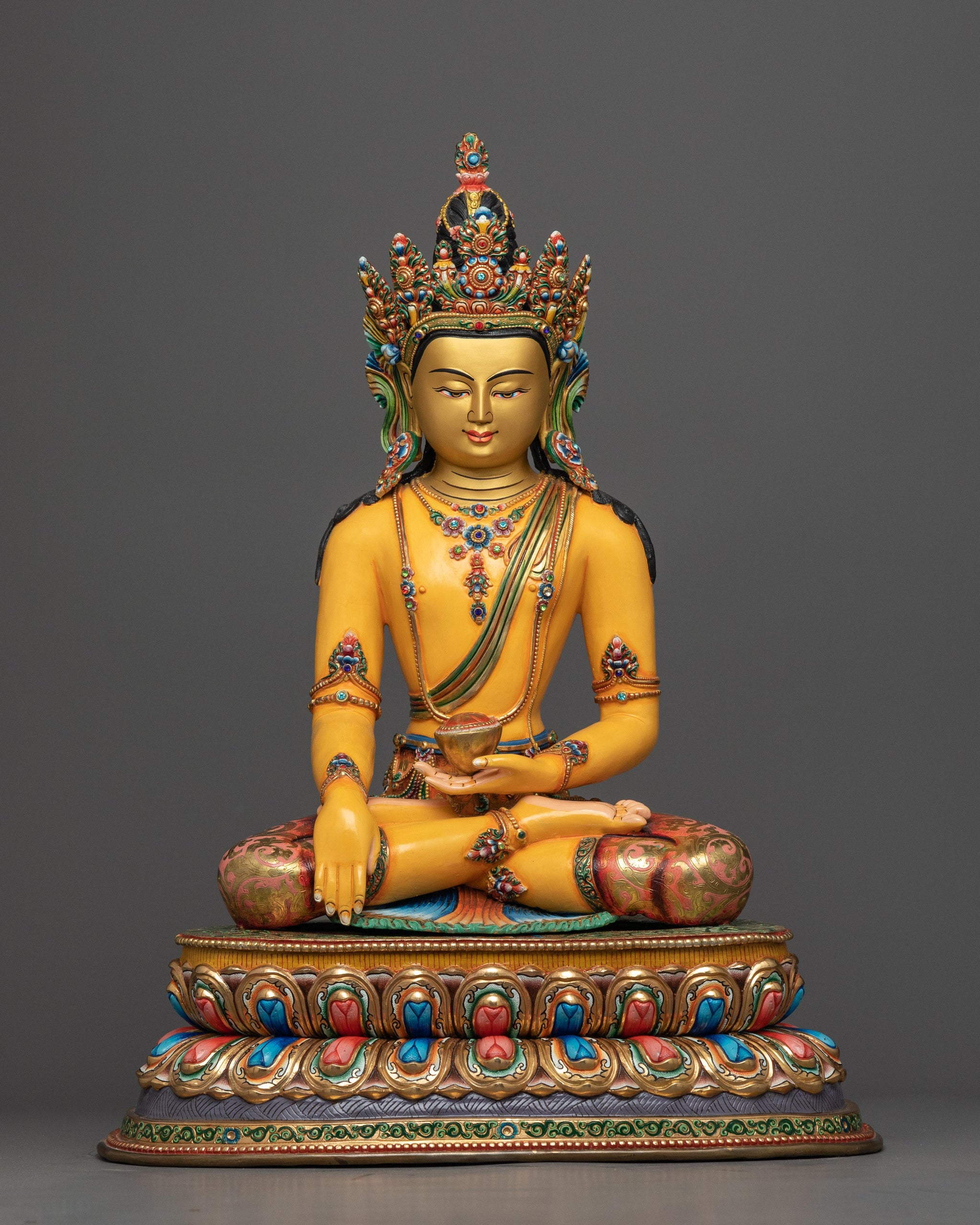 Discover the magnificence of the Crown Buddha Shakyamuni with this magnificent sculpture, which stands 18.8 inches tall and weighs 10.36 kg. This statue depicts Siddhartha Gautama, the historical Buddha, wearing a regal crown, symbolizing his enlightened mastery over both the material and spiritual realms. It represents Buddhist tradition's beautiful workmanship and sacred symbolism, having been meticulously constructed from a copper body and lavishly embellished with 24K gold gilding, precise gold and acrylic paints, and a distinctive beige skin painting to mirror the Buddha's complexion.
