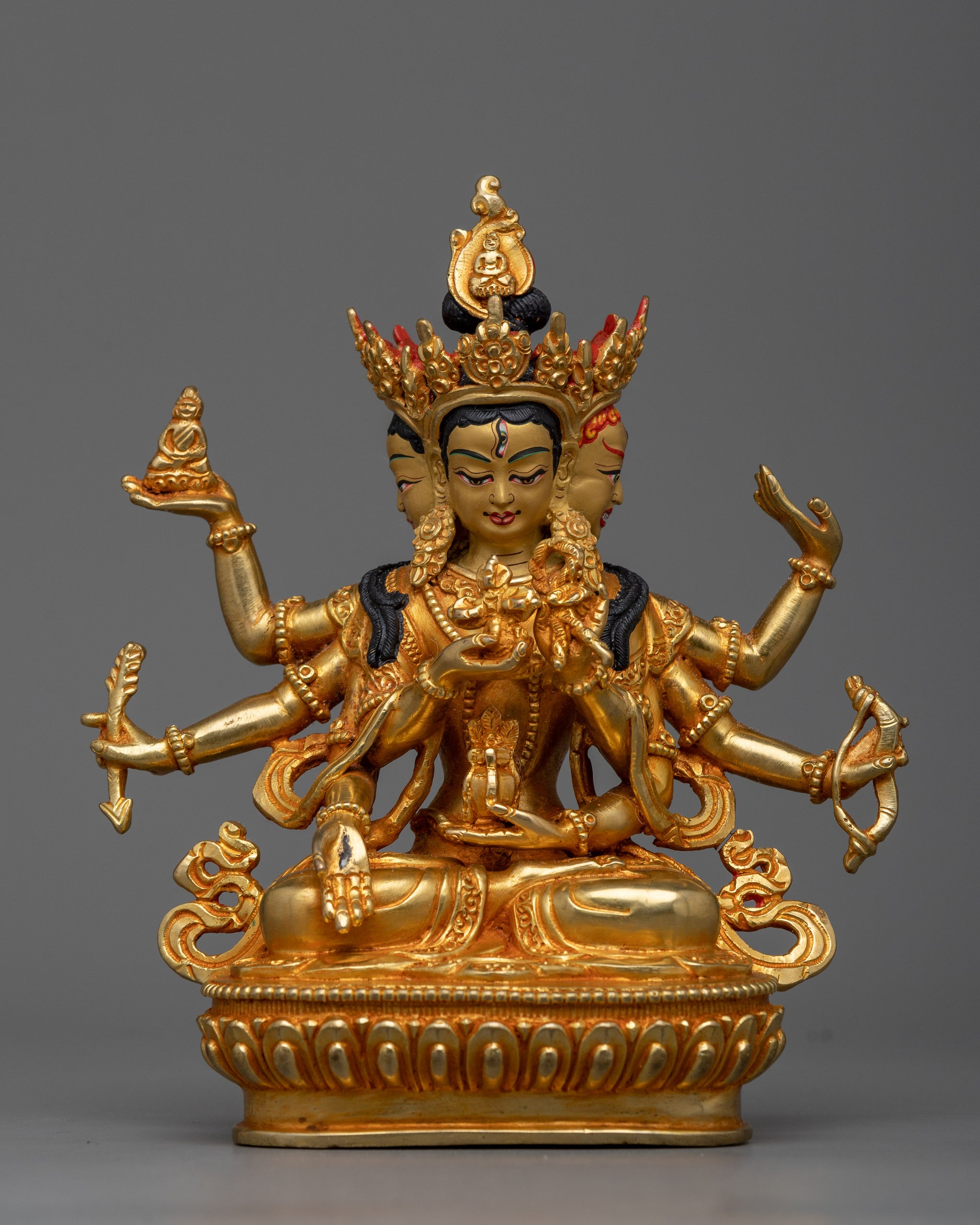 This sculpture, made of high-quality copper, is embellished with a rich 24K gold gilding that reflects the statue's holiness and the respected status of Dakini Namgyalma. The gold finish enhances the statue's visual attractiveness while also symbolizing the deity's purity and celestial characteristics. Detailed gold and acrylic paintings further embellish the statue, highlighting the intricate features of Namgyalma, including her serene expression and her characteristic crown.