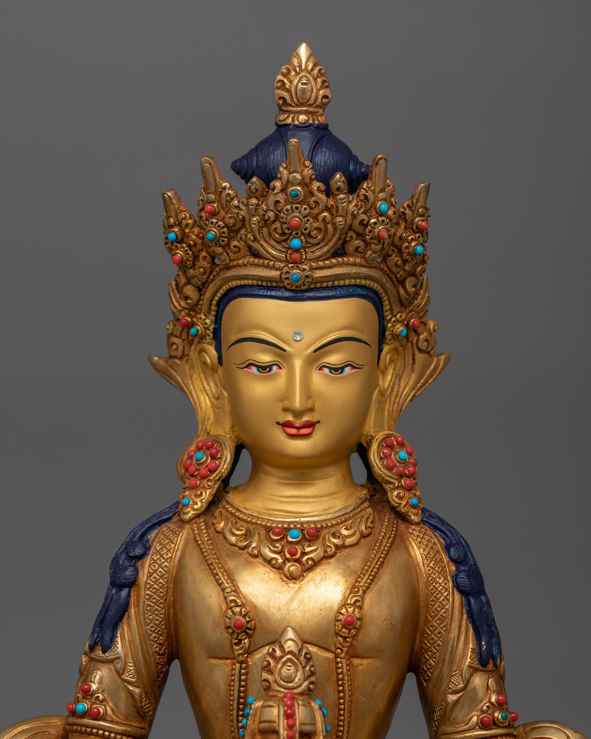 The statue of the Buddha of Long Life in Nepalese traditional Himalayan art. We have portrayed the god sitting atop a moon disc lotus in this statue, grasping a moon disc lotus and a vase with the nectar of immortality. This has hand-craved beautiful graphic patterns. The statue's crown and robe serve as its primary features. We have gemstones and priceless corals adorning us. We used real 24K gold to gilde the figure after hand-craving the patterns.