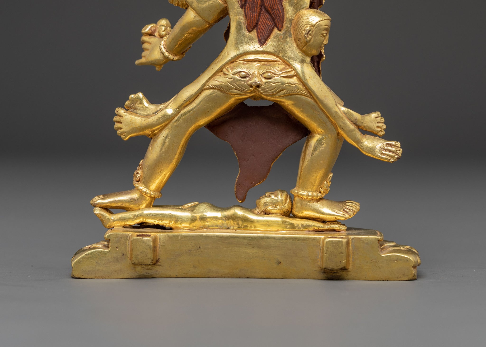 Dharmapala Ekajati Statue stands 7.1” (18 cm) tall with a 5.1” (13 cm) base and weighs 1.1 kg. Expertly handcrafted from copper, covered with a triple layer of 24K gold gilding, and carved with deeply engraved carvings that produce a magnificent 3D-like effect. This sculpture, adorned with hand-carved gemstones, handcrafted by expert Nepalese artisans, elegantly symbolizes Himalayan Buddhism's sacred traditions, making it an appropriate addition to altars, meditation places, or sacred collections.