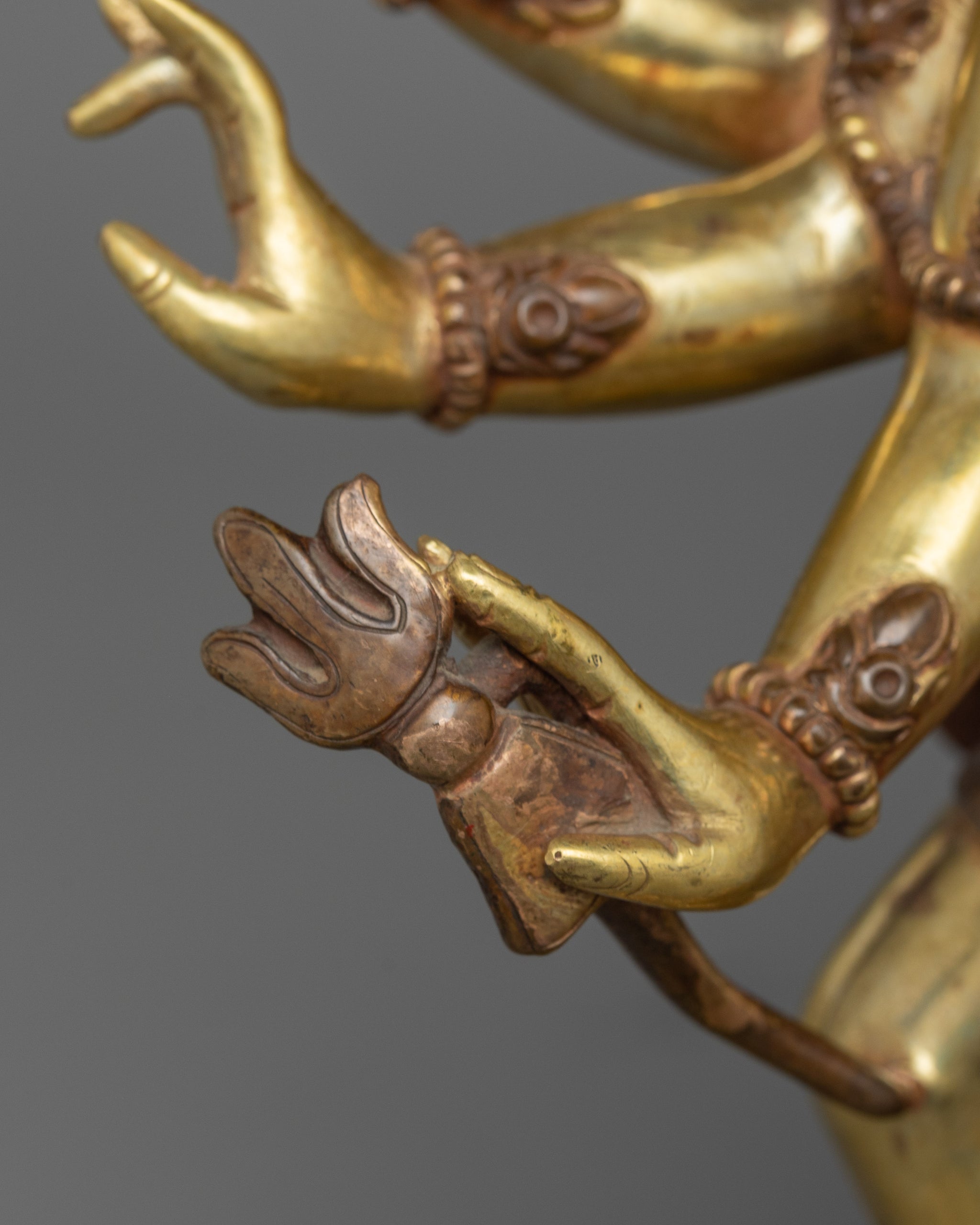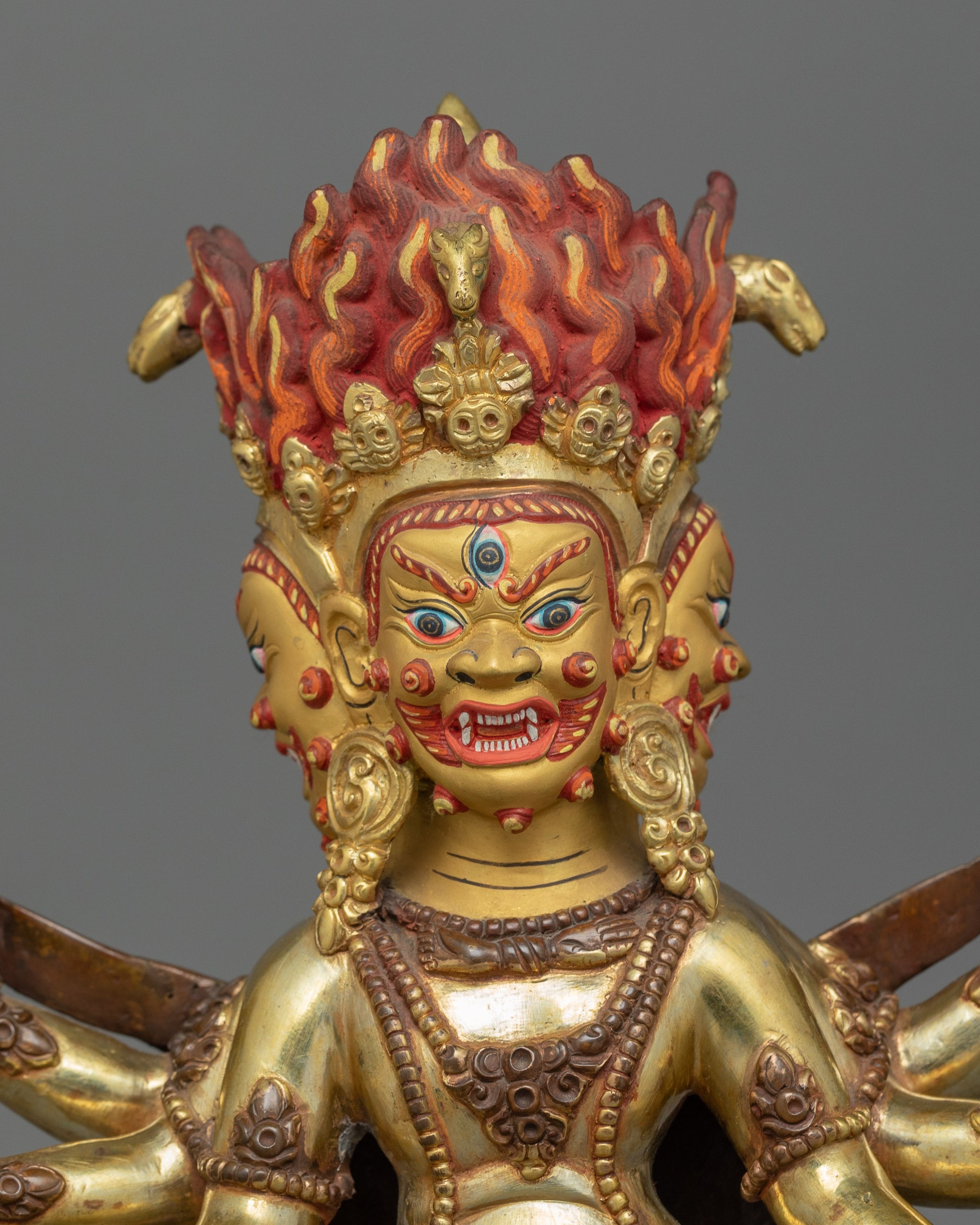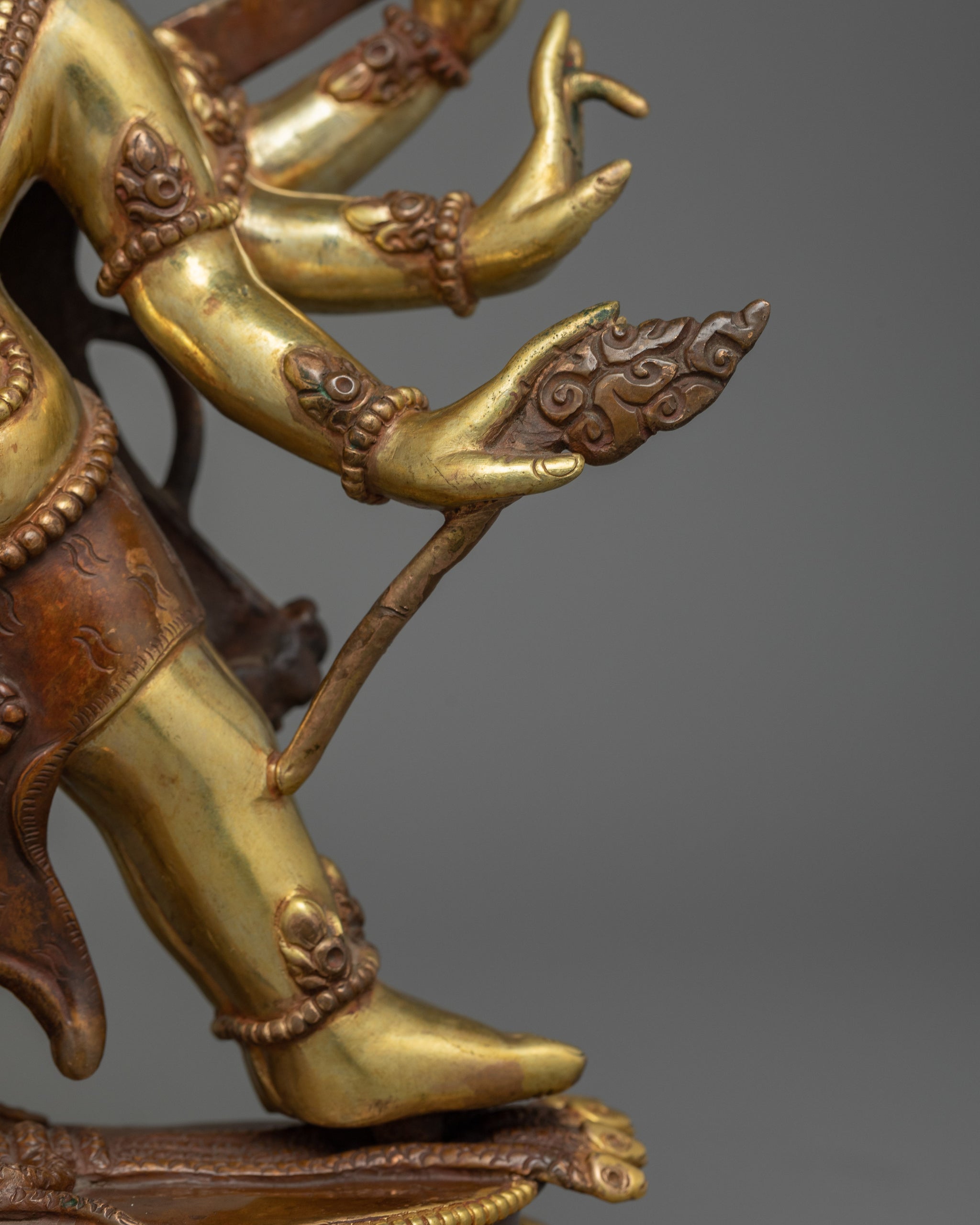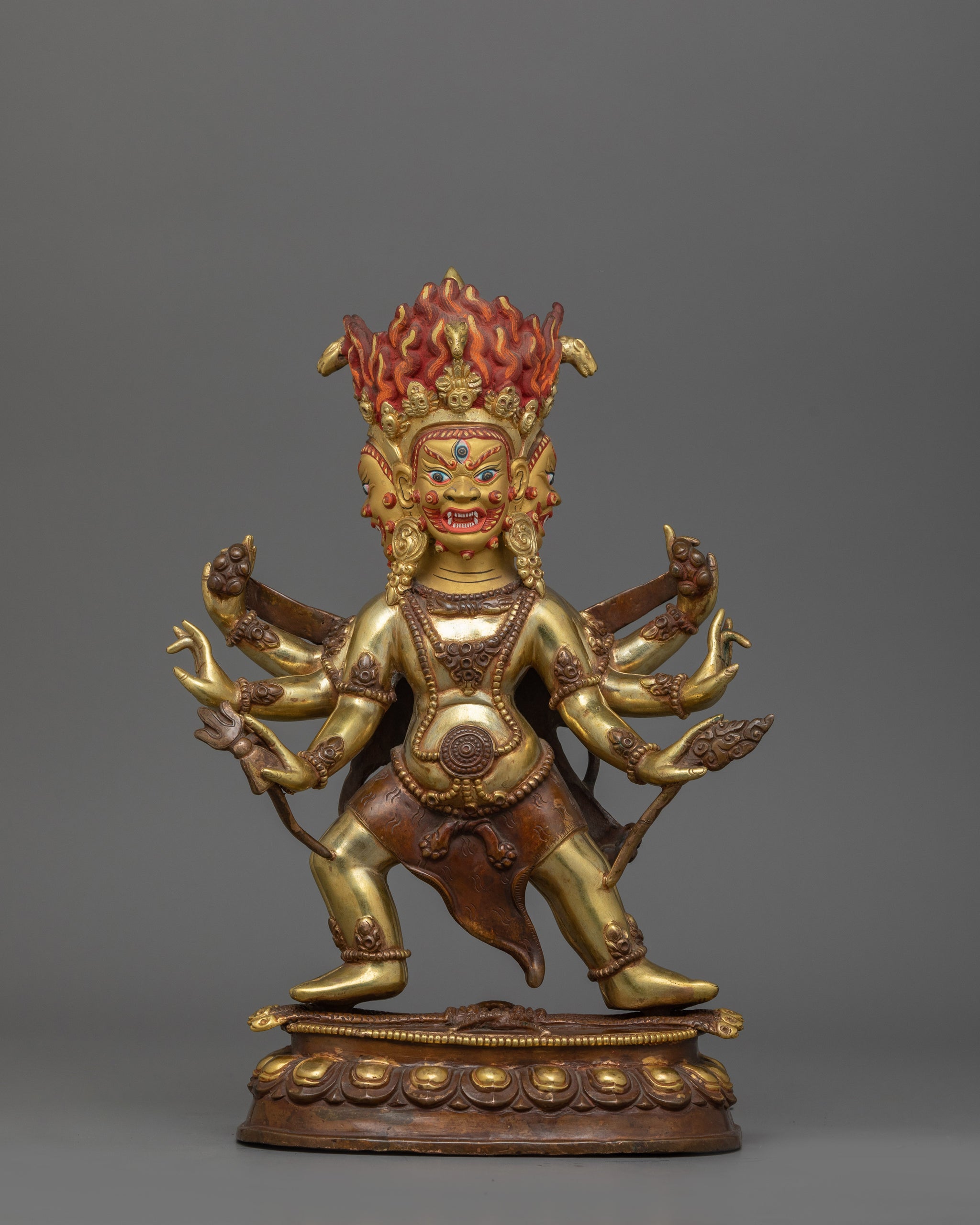 The Dharmapala Statue, measuring 11.0 inches (28 cm) in height and 7.5 inches (19 cm) in base width, is a powerful representation of a protector deity in Tibetan Buddhism. Crafted from oxidized copper, this statue is enhanced with 24K gold gilding and gold and acrylic paintings. Designed by talented Nepalese artisans, this detailed sculpture is ideal for altars, meditation areas, or as a meaningful decor item for individuals seeking awareness in their daily life.