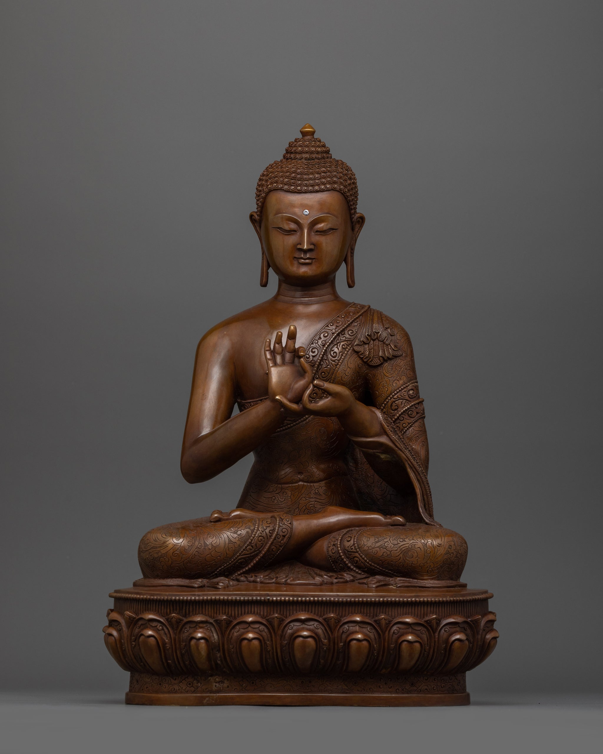 This Dhyani Buddha Vairocana Figurine, or Buddha of Universal Wisdom, represents the illumination of ultimate truth and the unification of all manifestations. This hand carved statue measures 16.9" (Height) x 11.6" (Base) and weighs 9.12 kg. It is made of oxidized copper and has a timeless and spiritual appeal. This figure, crafted by skilled Nepalese artisans, symbolizes the rich creativity of Himalayan Buddhist traditions, making it an important addition to altars, meditation places, or sacred collections.